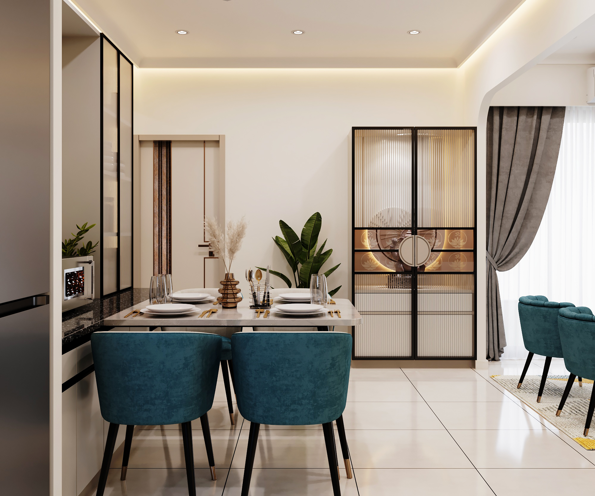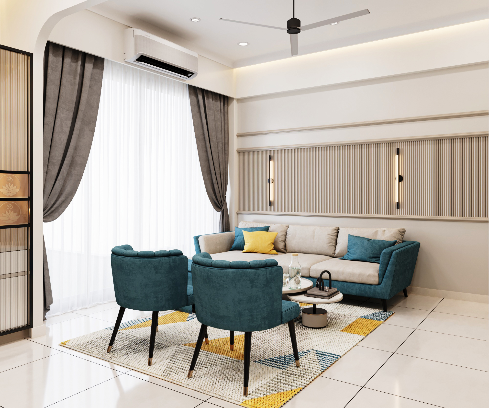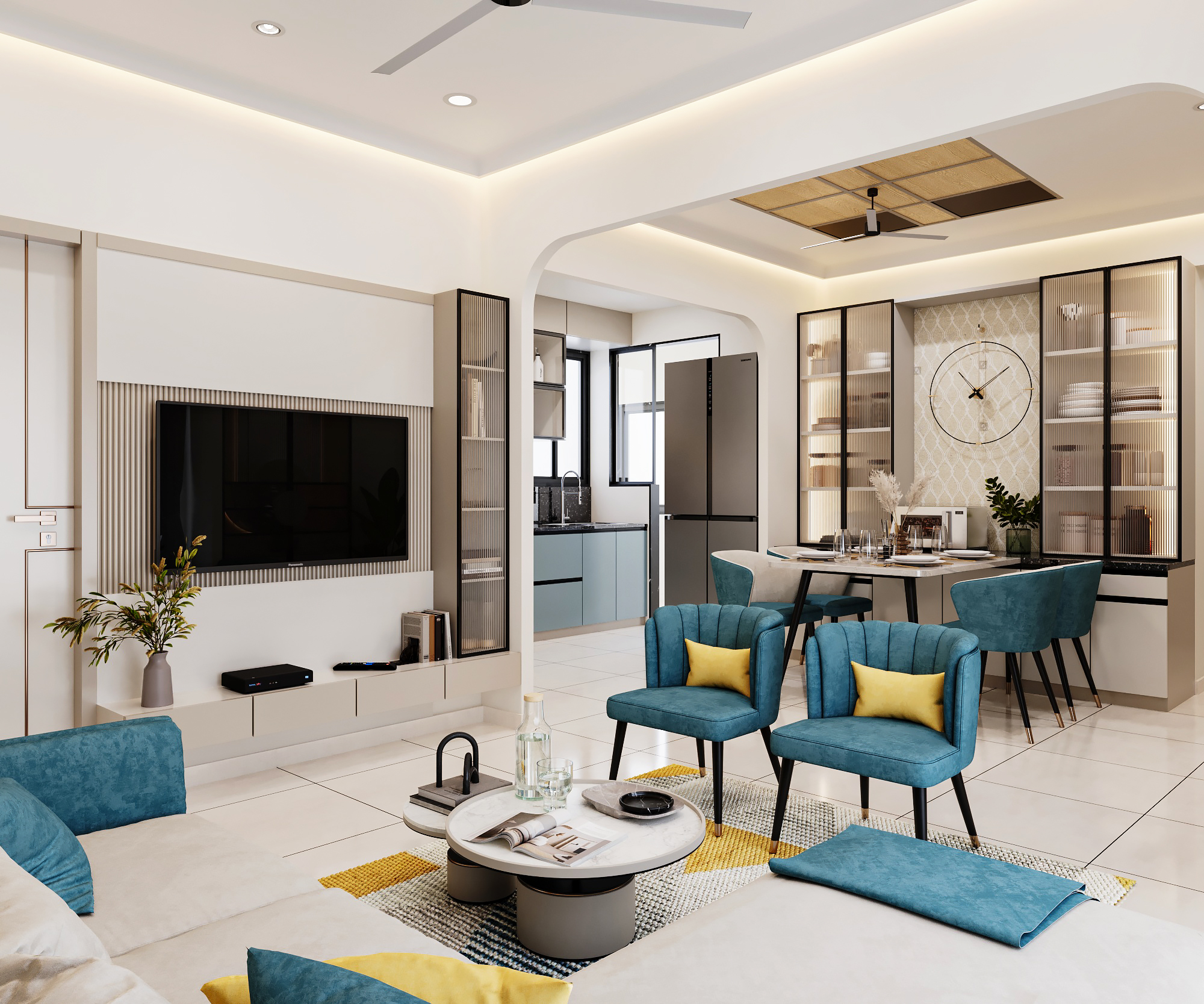 The layout comprises a welcoming living area, kitchen-dining, pooja space, master bedroom, kids’ room, and a parents’ room. The living area features a fluted panel with mouldings on the sofa back wall, accentuated by wall lights. Teal green armchairs with bright yellow cushions bring vibrancy, while a spacious crockery unit enhances the dining zone.