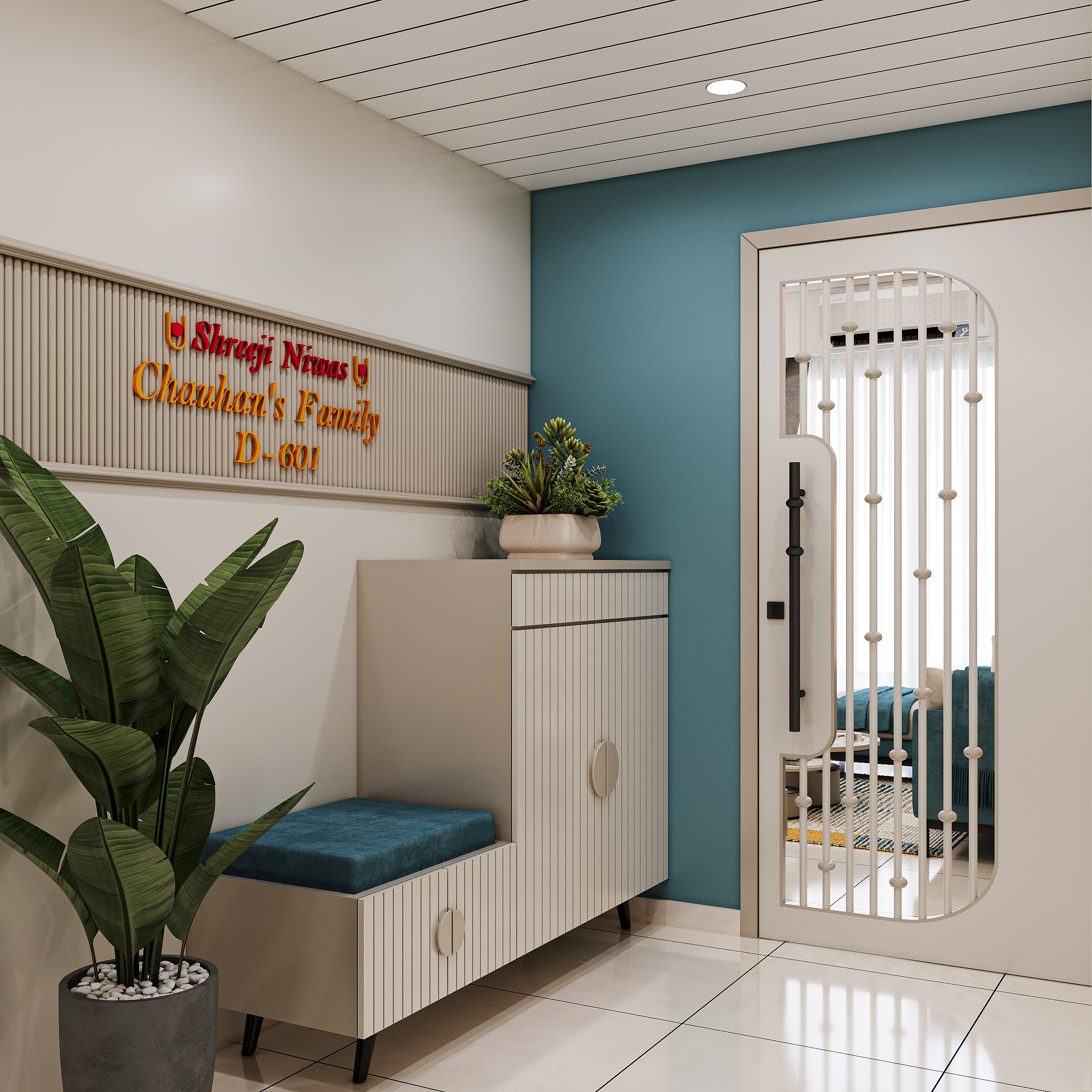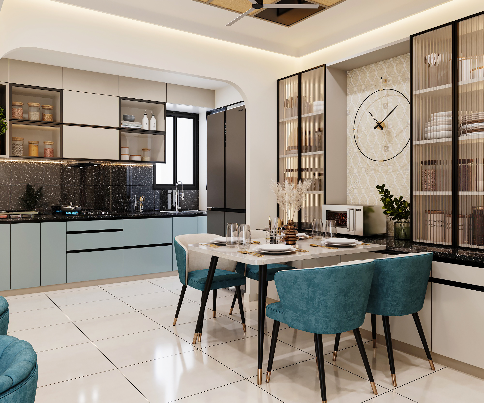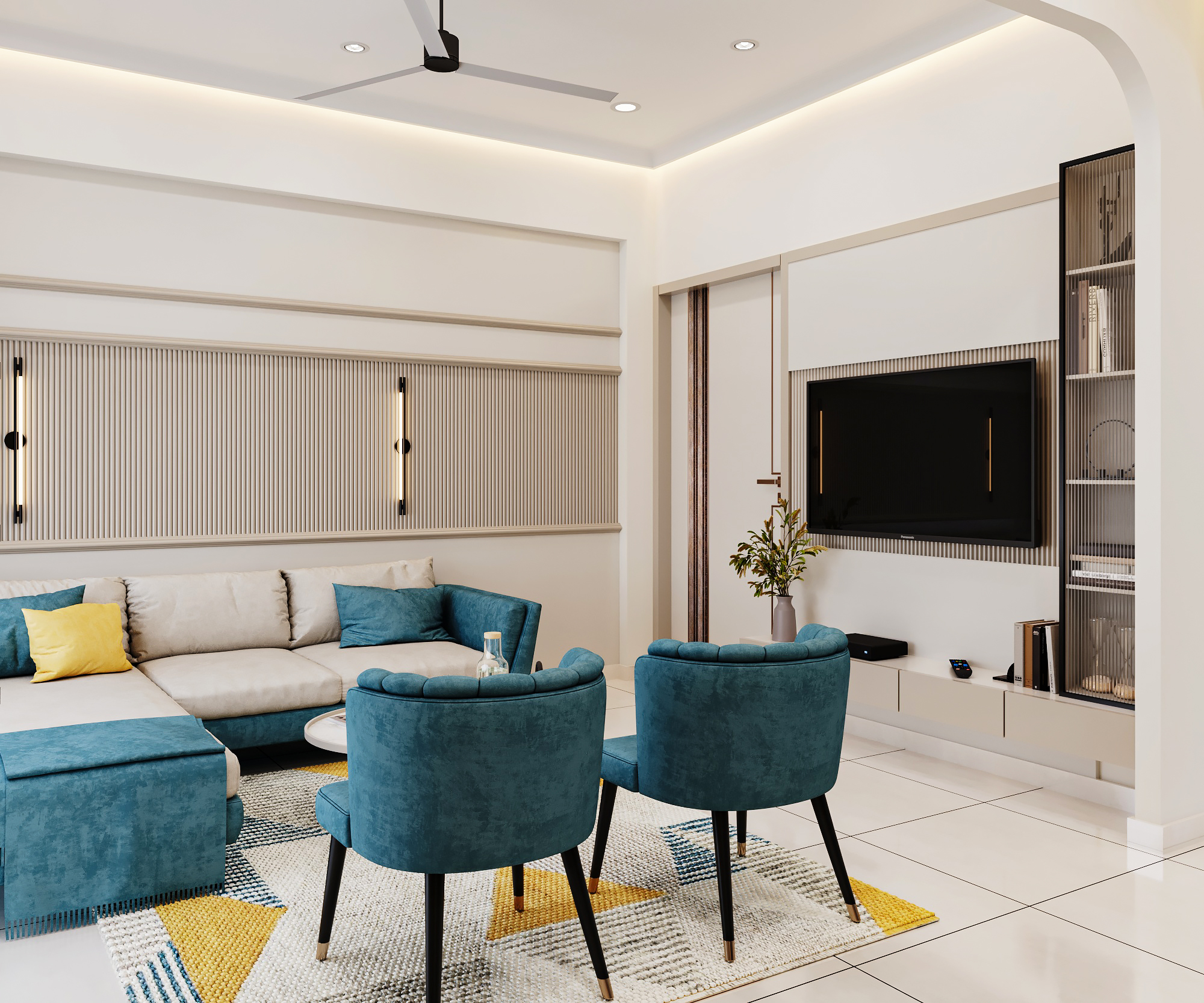 The layout comprises a welcoming living area, kitchen-dining, pooja space, master bedroom, kids’ room, and a parents’ room. The living area features a fluted panel with mouldings on the sofa back wall, accentuated by wall lights. Teal green armchairs with bright yellow cushions bring vibrancy, while a spacious crockery unit enhances the dining zone.