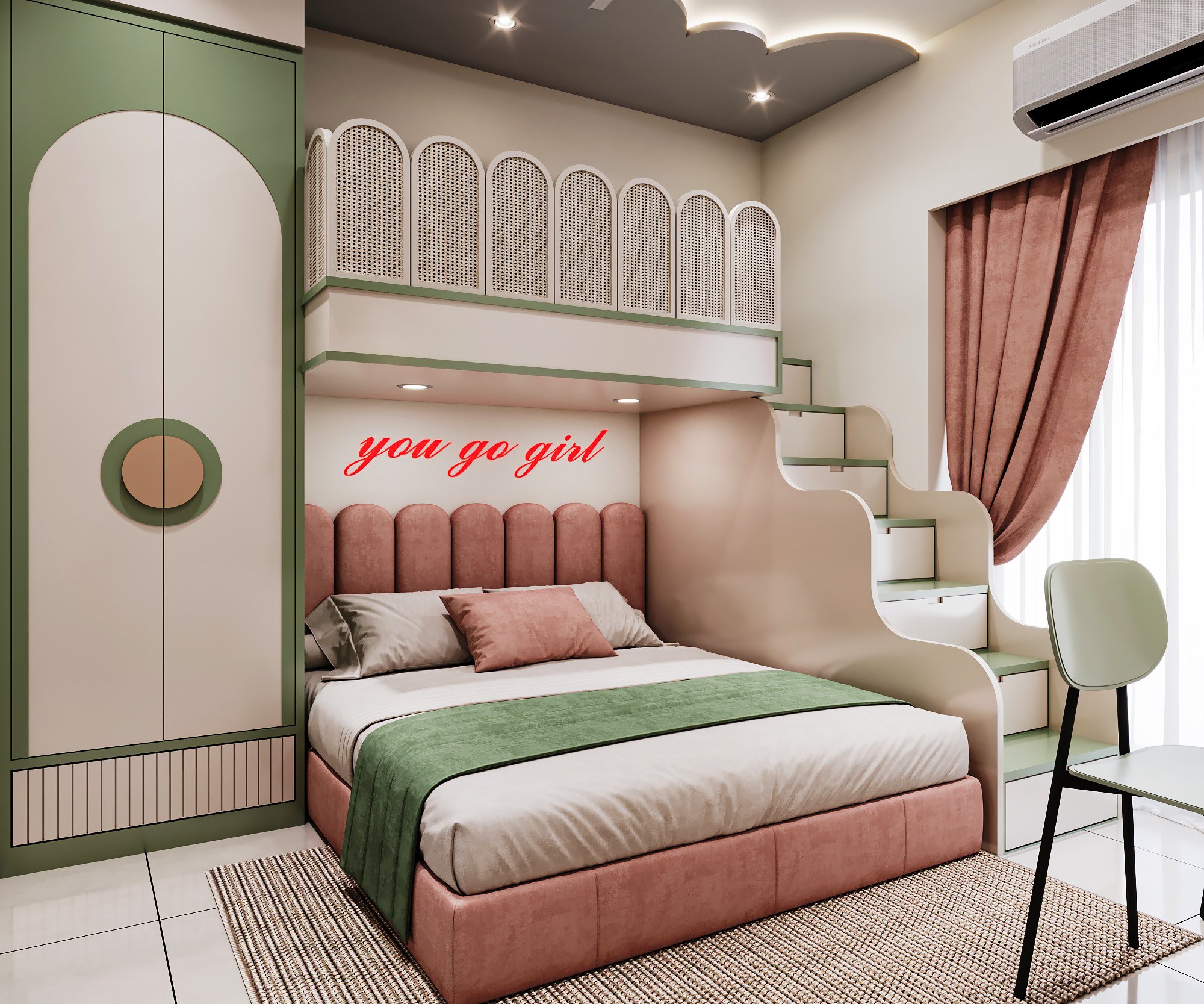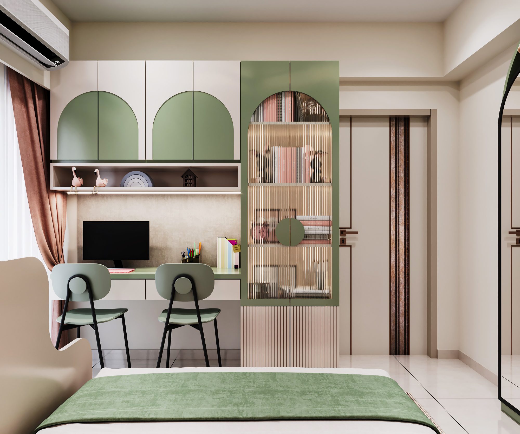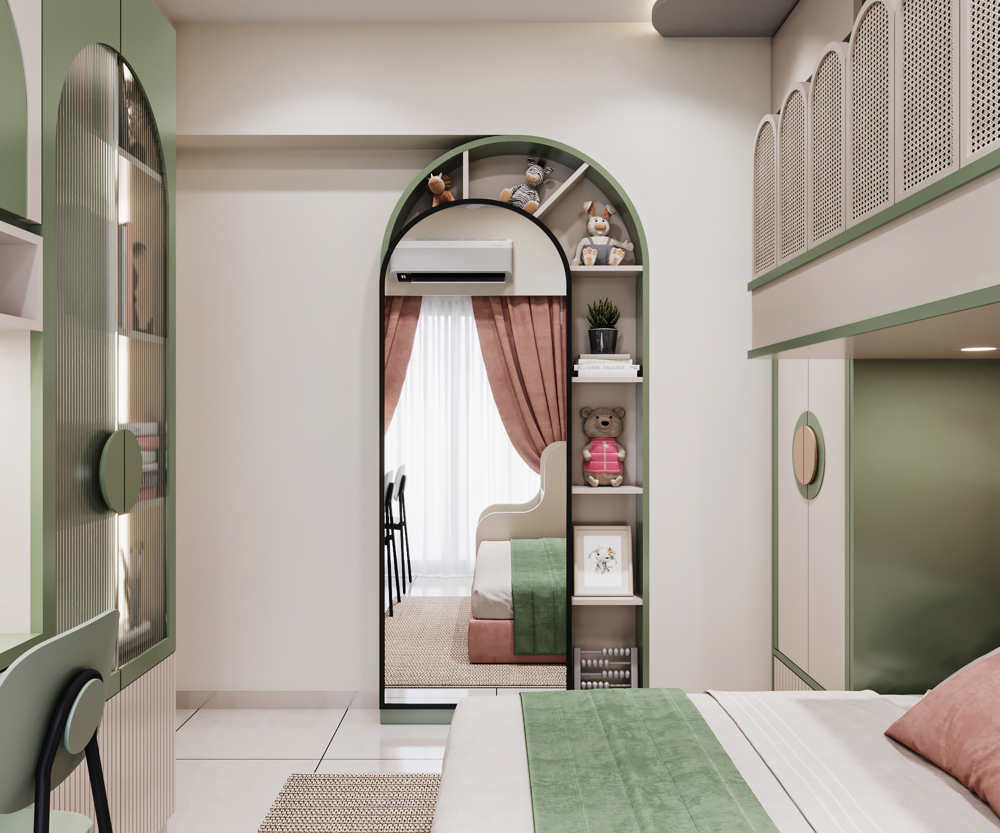 The master bedroom is designed with a neutral palette and green undertones, highlighted by a nature-inspired wallpaper, cane-bordered headboard, wooden ceiling, and a custom metal art wall clock. The parents’ room is multipurpose, equipped with a Murphy bed to maximize flexibility. The kids’ room, tailored for two daughters, includes a bunk bed with a playful round-arch theme, a full-height arch mirror with open shelves, and a thoughtfully designed study table with generous storage. The overall design merges simplicity, warmth, and practicality.