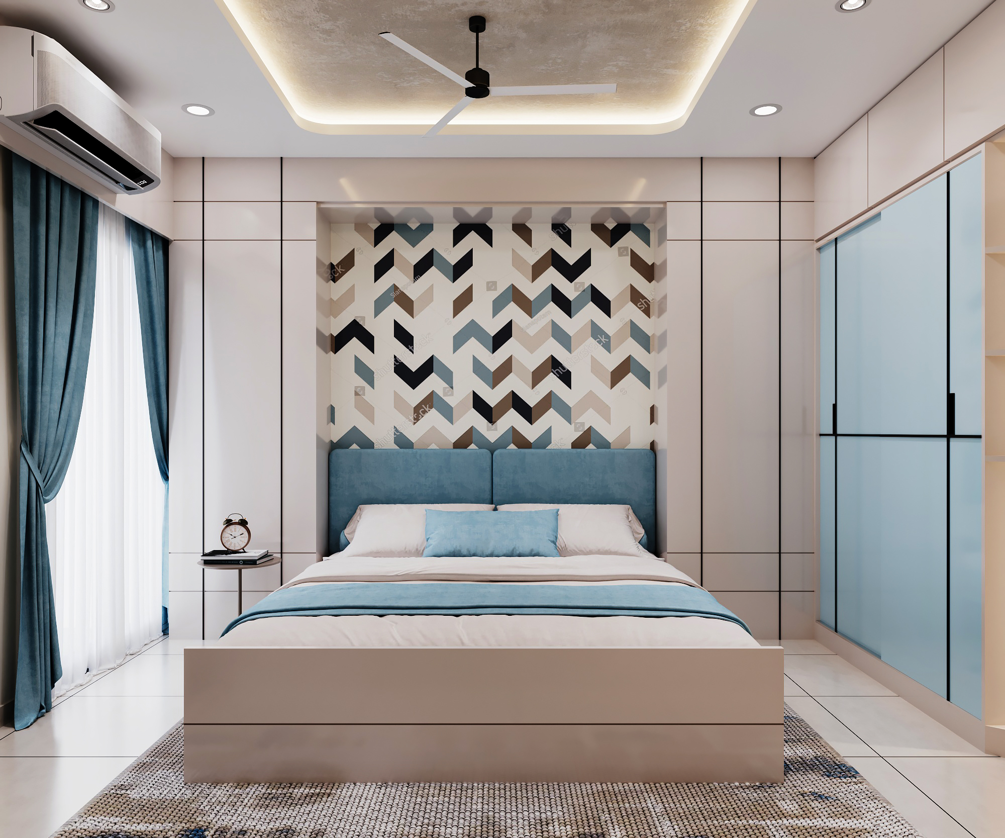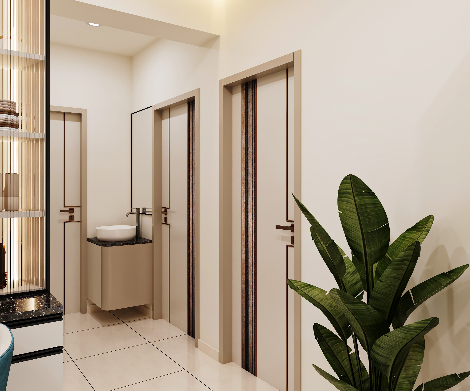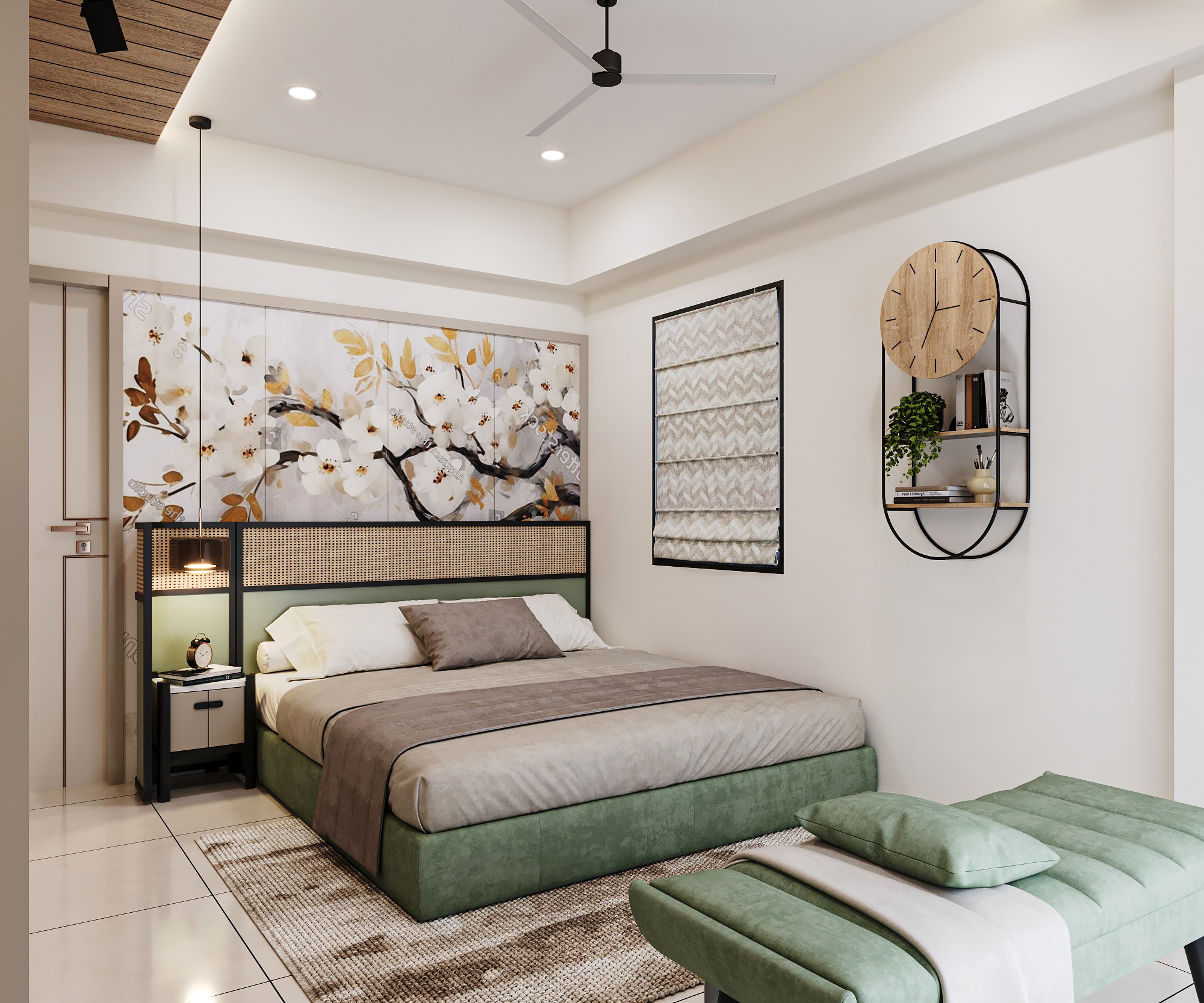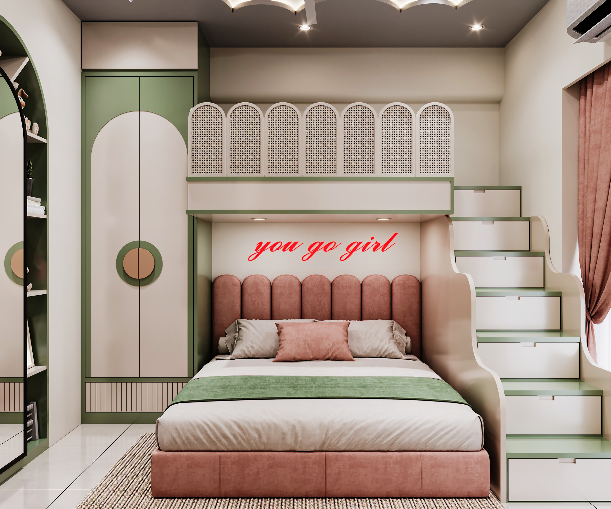 The master bedroom is designed with a neutral palette and green undertones, highlighted by a nature-inspired wallpaper, cane-bordered headboard, wooden ceiling, and a custom metal art wall clock. The parents’ room is multipurpose, equipped with a Murphy bed to maximize flexibility. The kids’ room, tailored for two daughters, includes a bunk bed with a playful round-arch theme, a full-height arch mirror with open shelves, and a thoughtfully designed study table with generous storage. The overall design merges simplicity, warmth, and practicality.