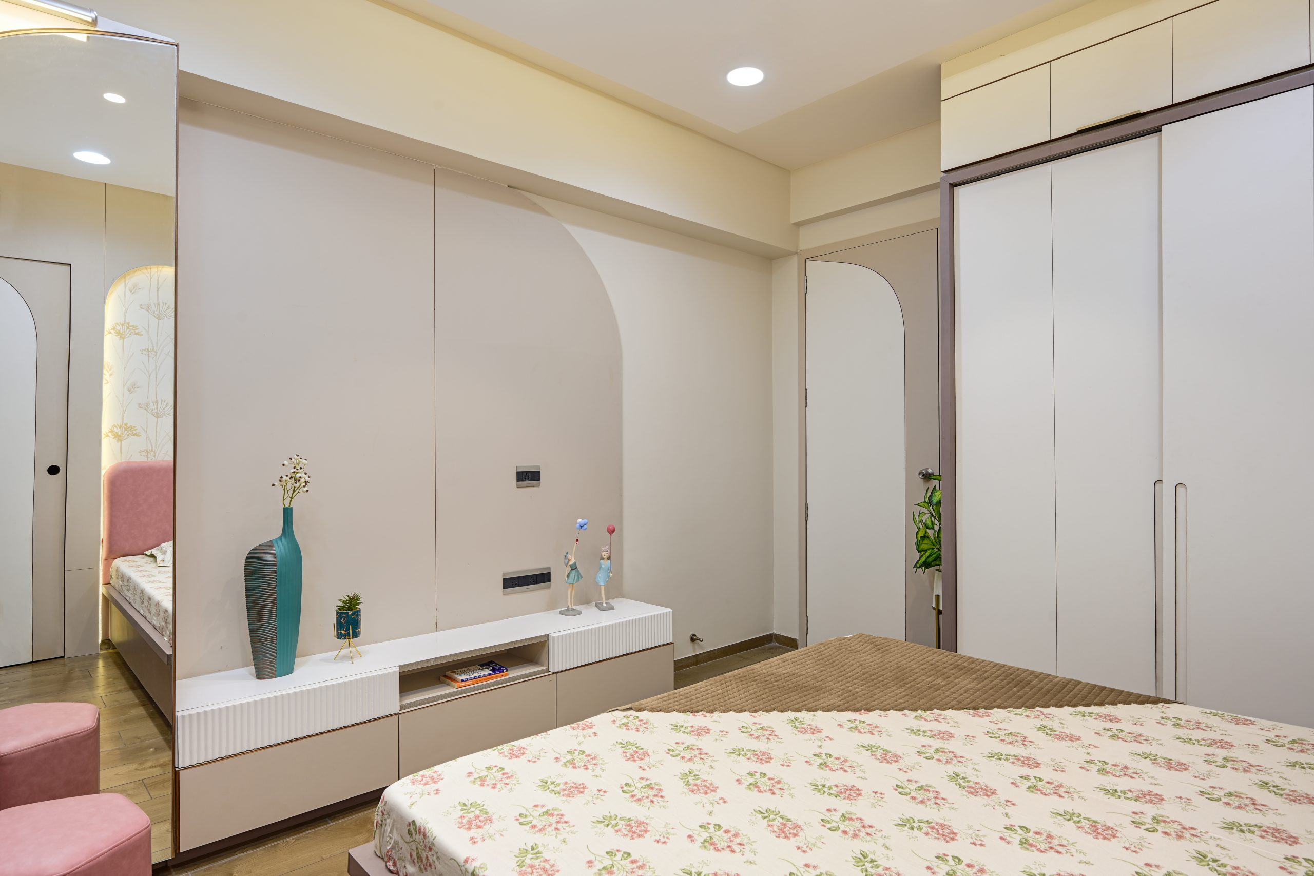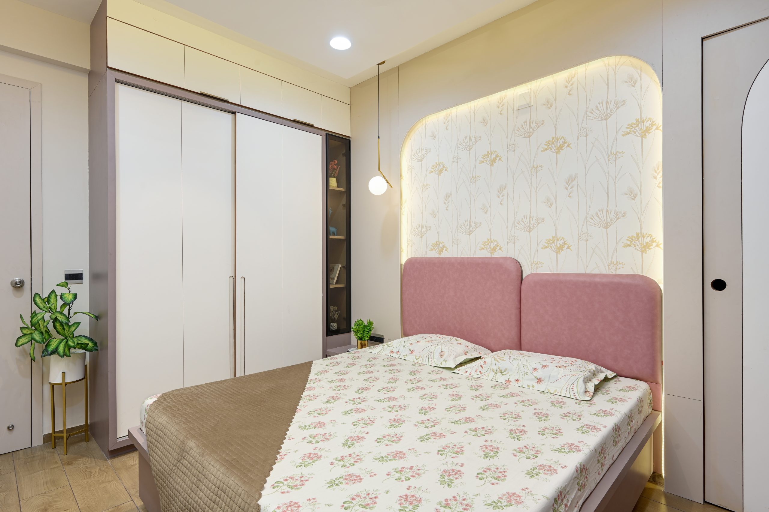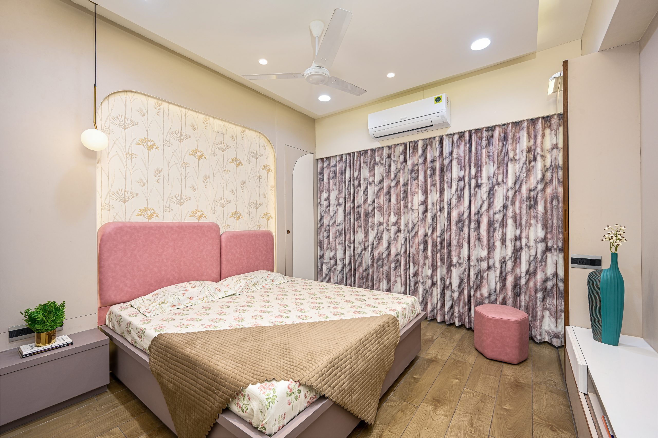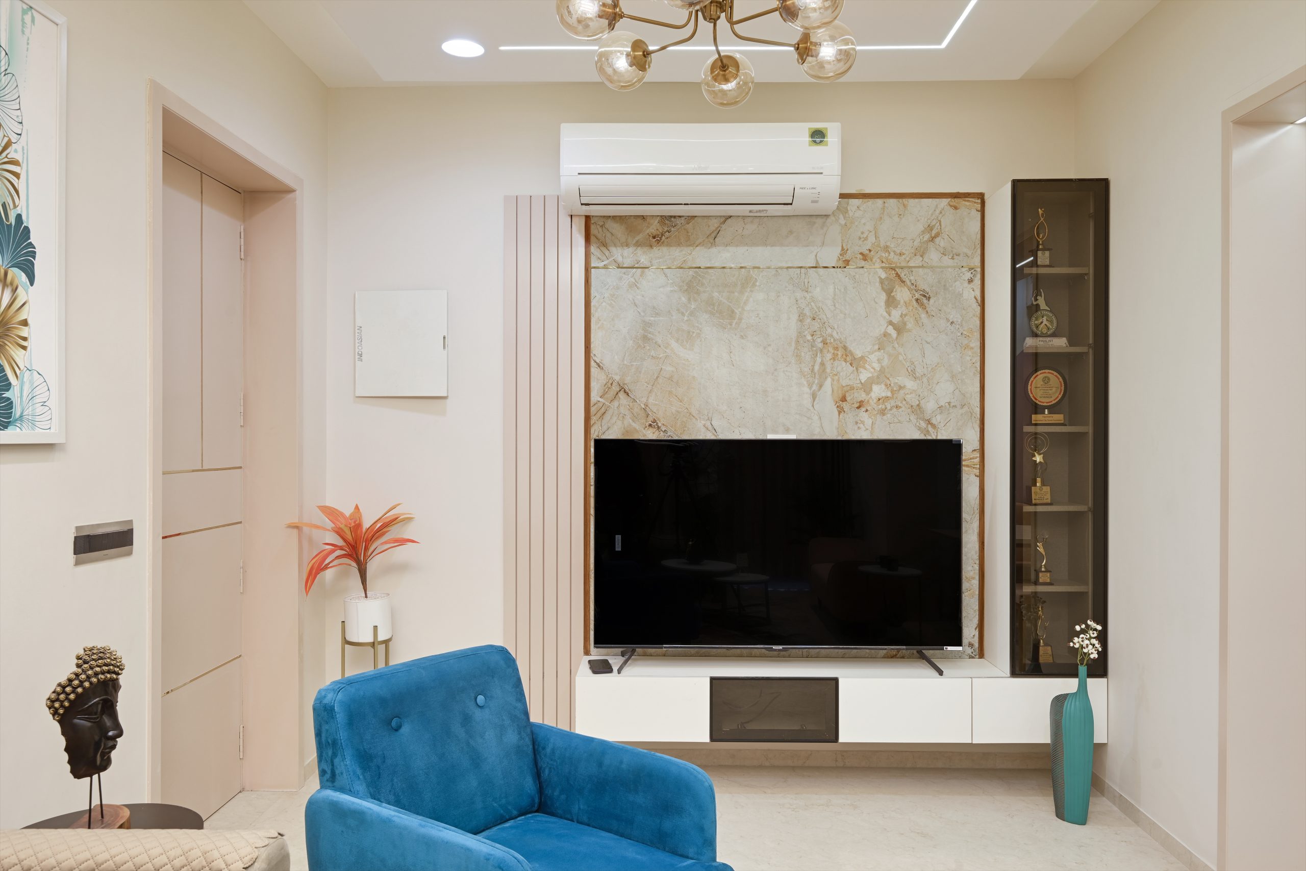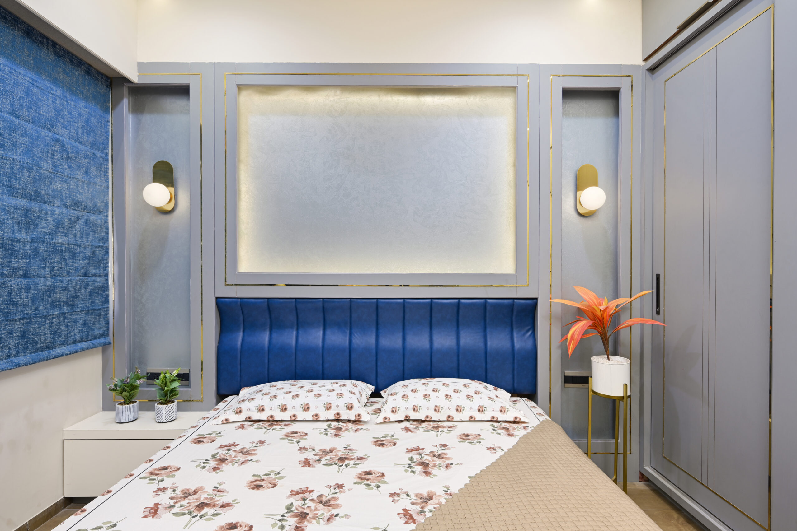 Bedrooms feature bold hues like royal blue and soft greys, balanced with gold accents and ambient lighting to enhance comfort and elegance.
