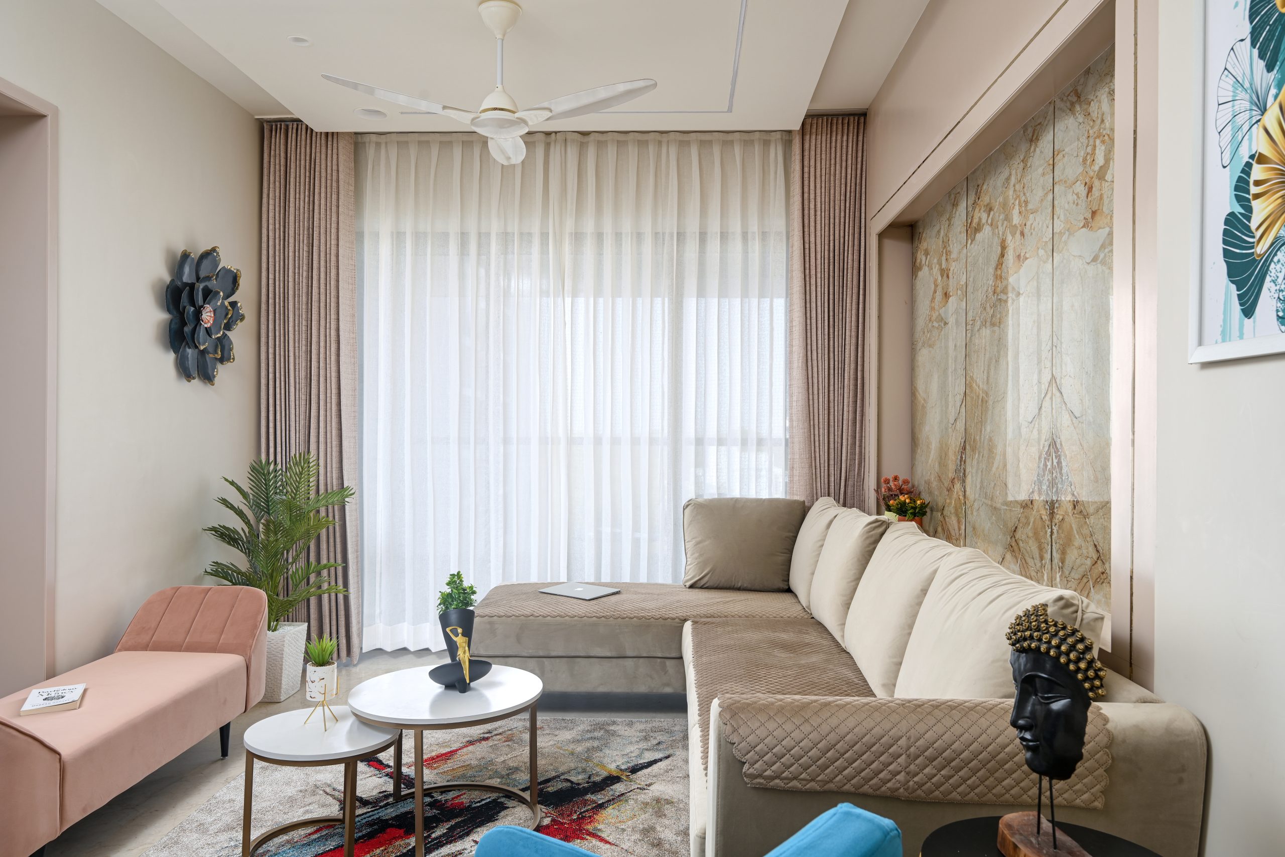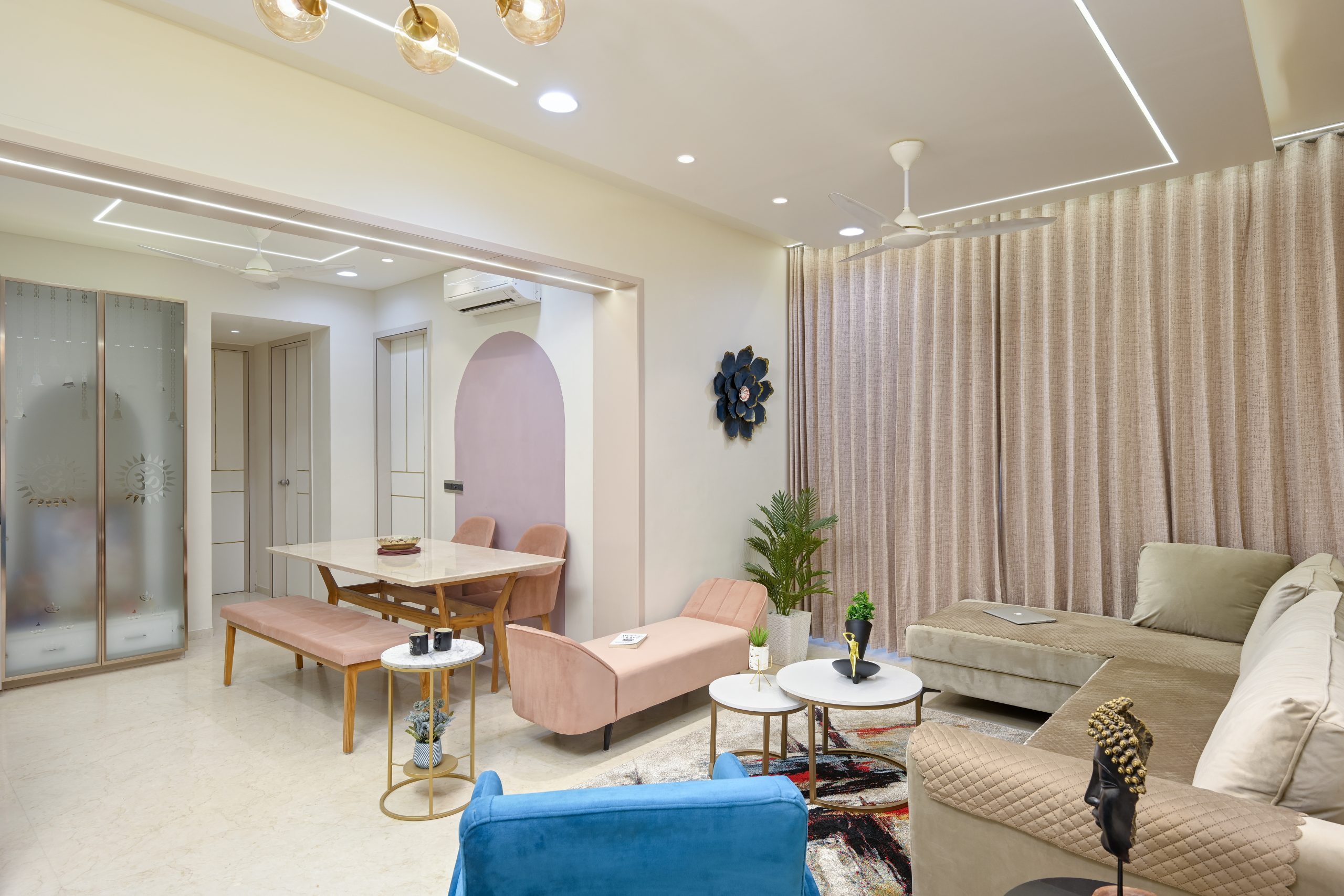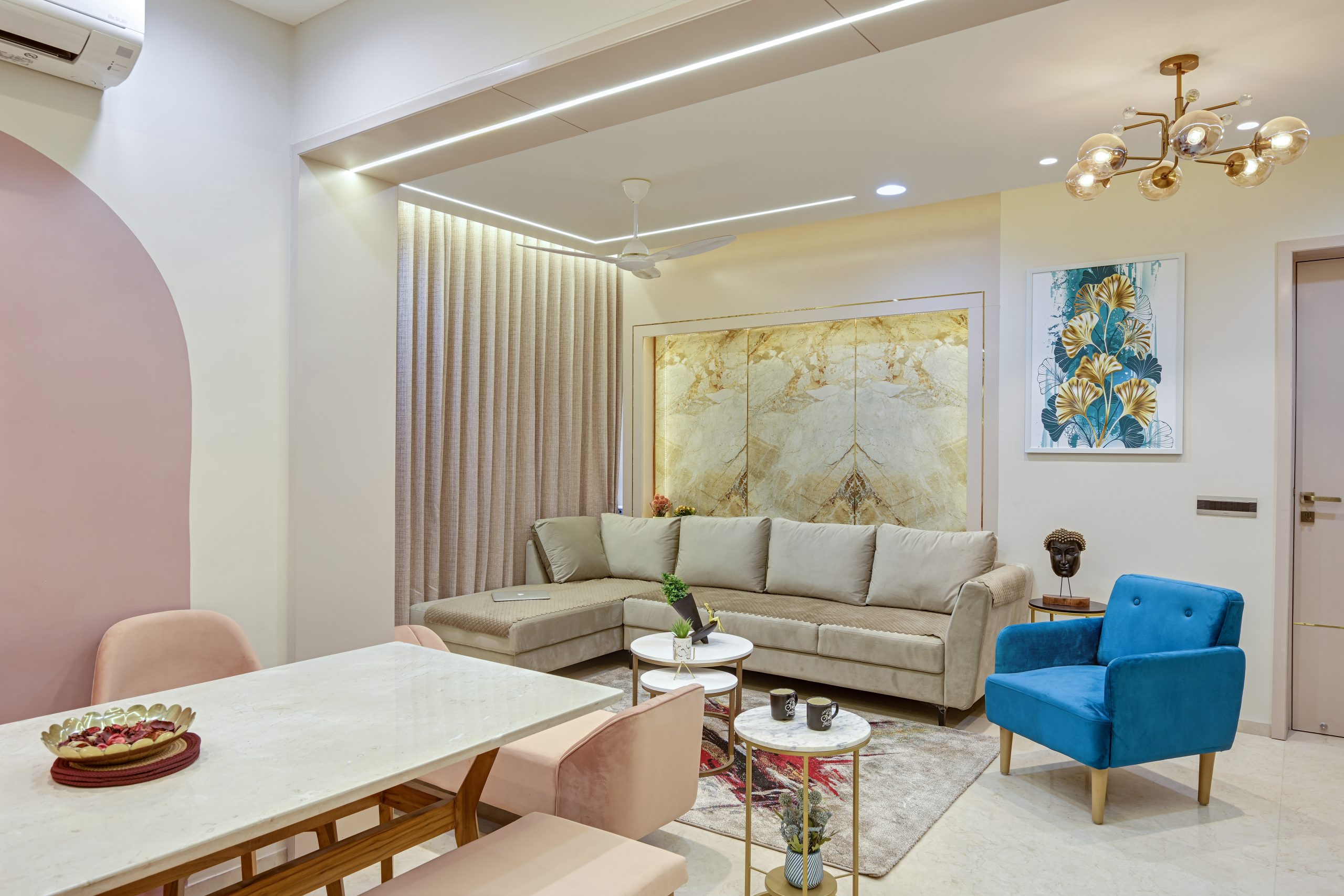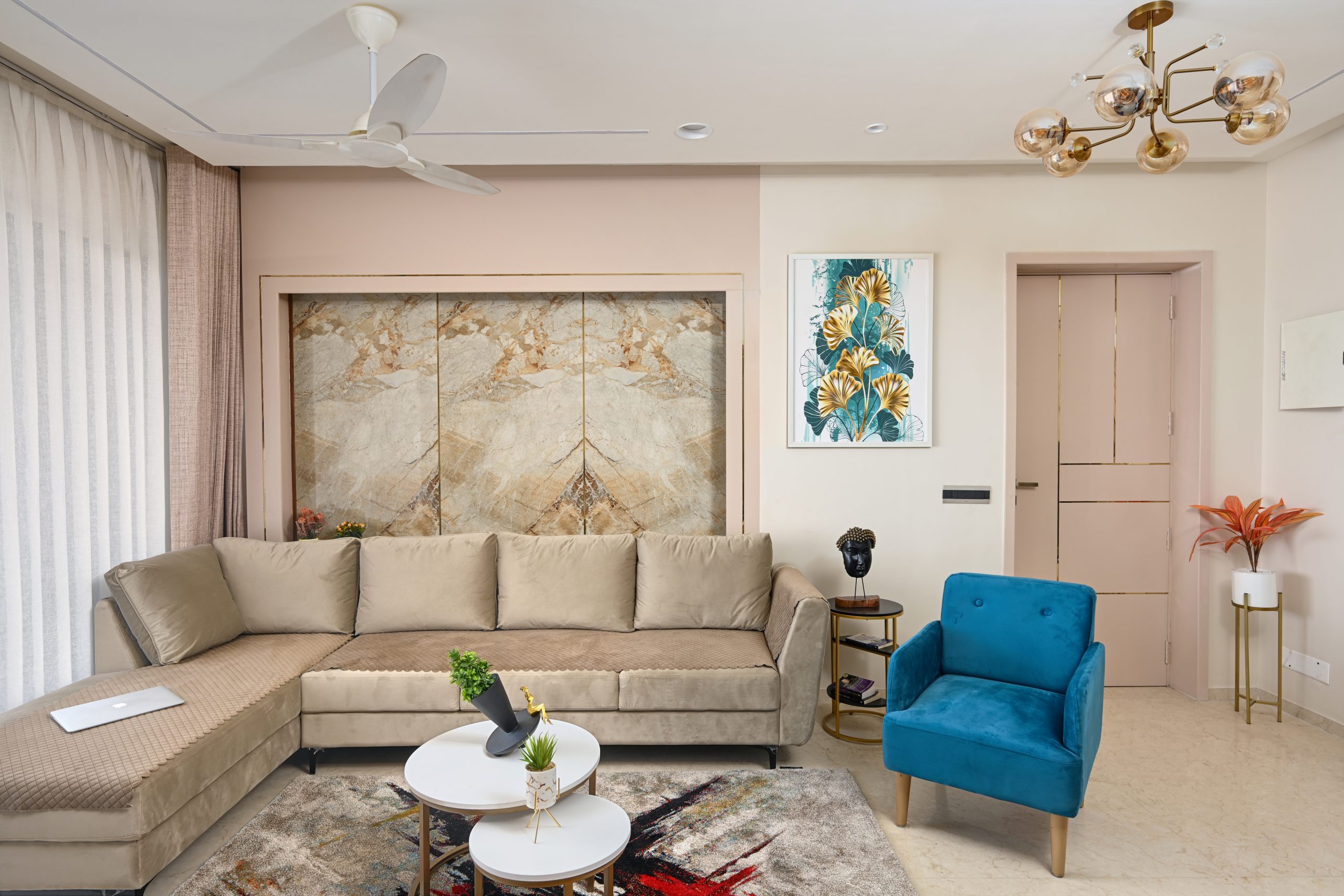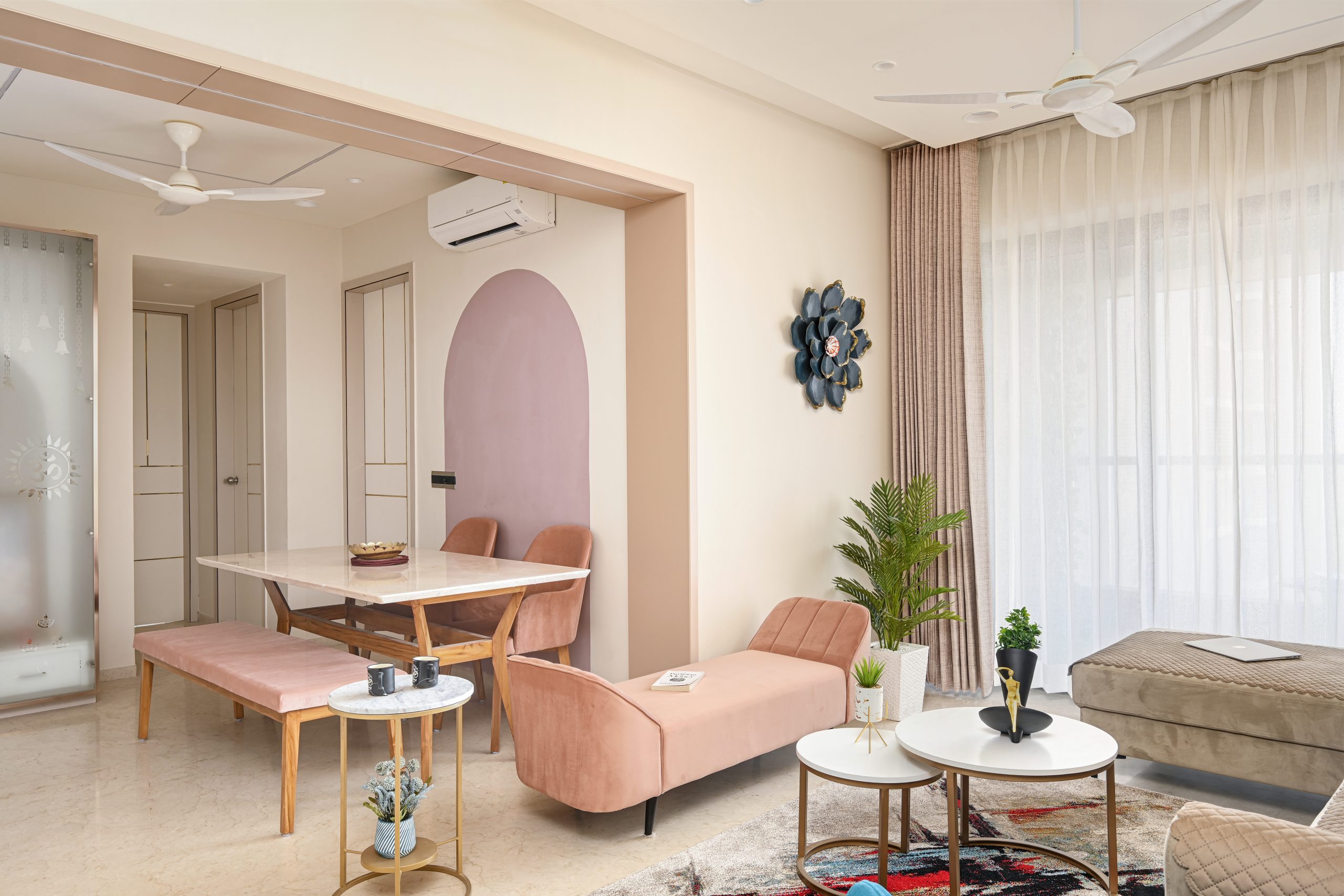 This home showcases a refined palette with warm pastels and modern elements. The living and dining areas combine plush peach seating, contemporary art, and marble-topped tables, creating a cozy yet sophisticated vibe.