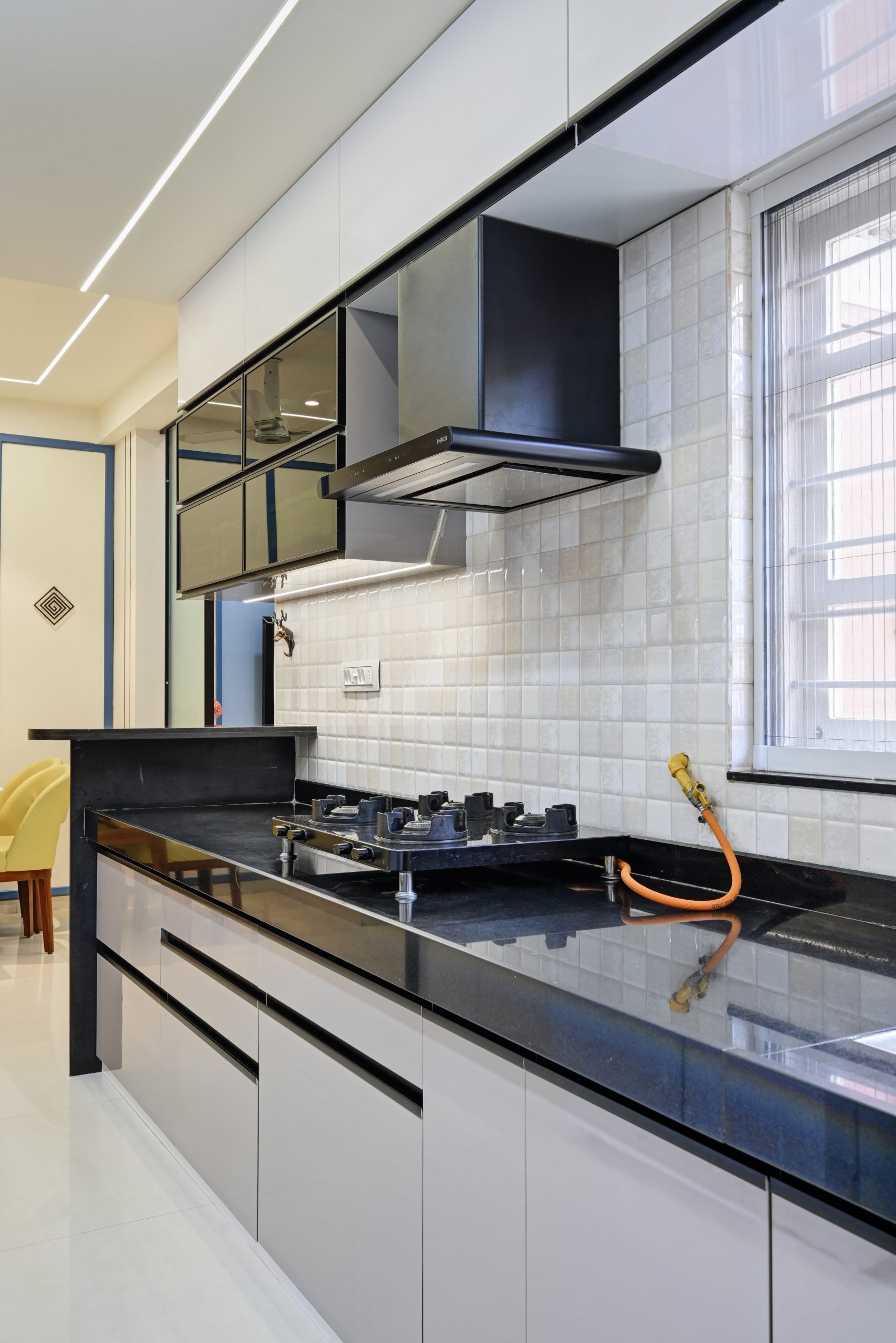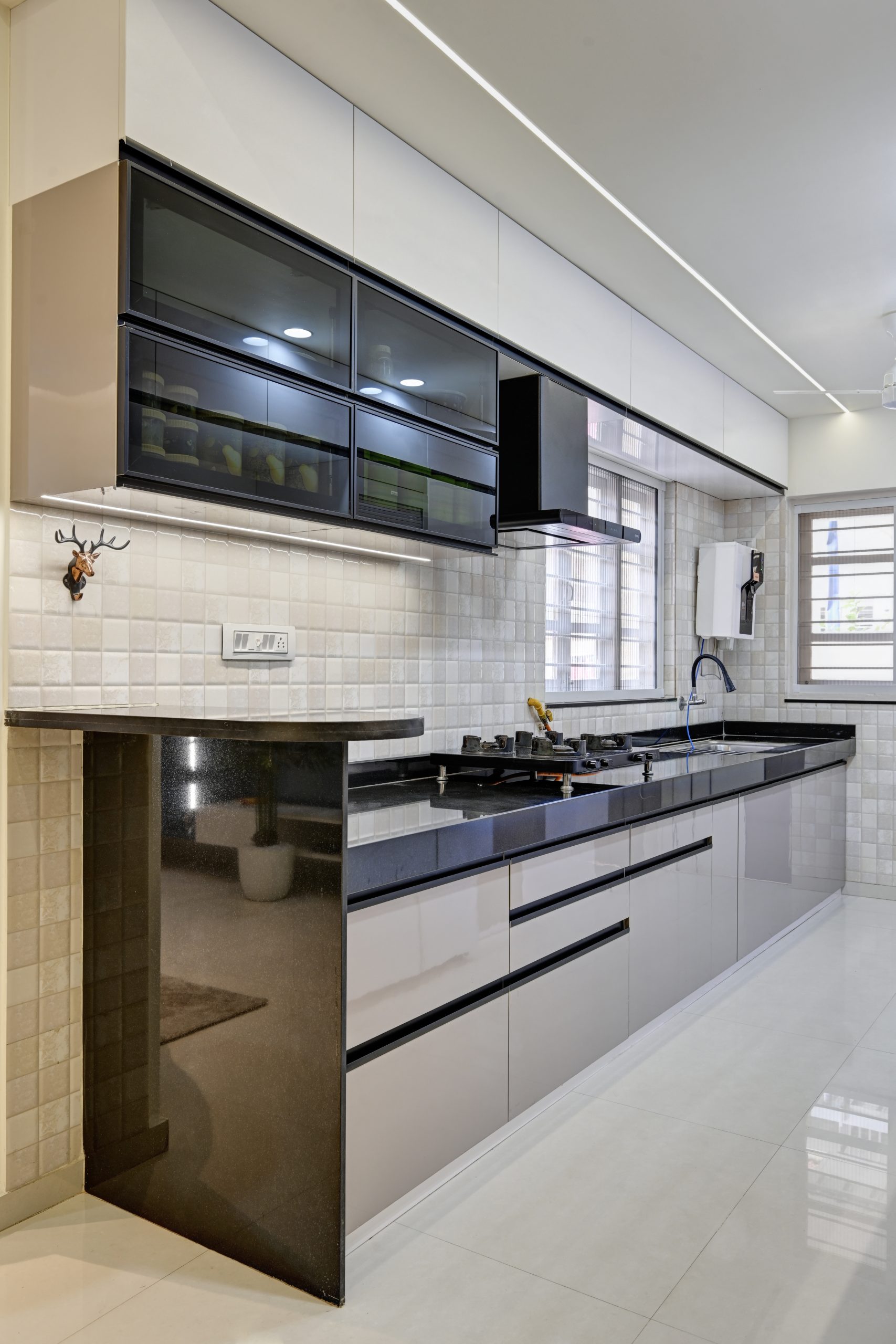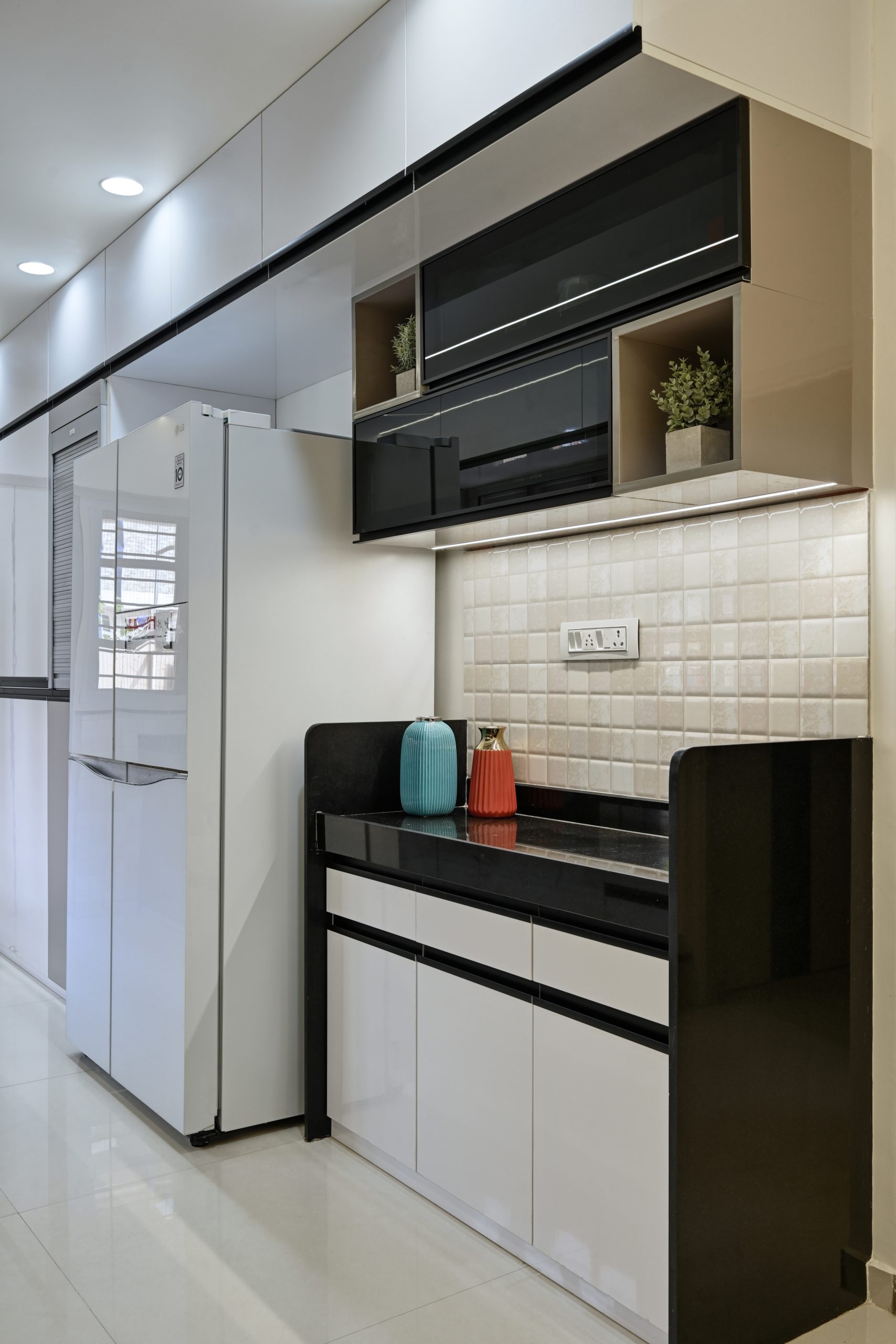 The kitchen is a parallel layout designed for maximum efficiency. With smart cabinetry, a combination of closed and open storage, and easy-to-clean finishes, it’s built to serve modern cooking needs without compromising on design aesthetics.