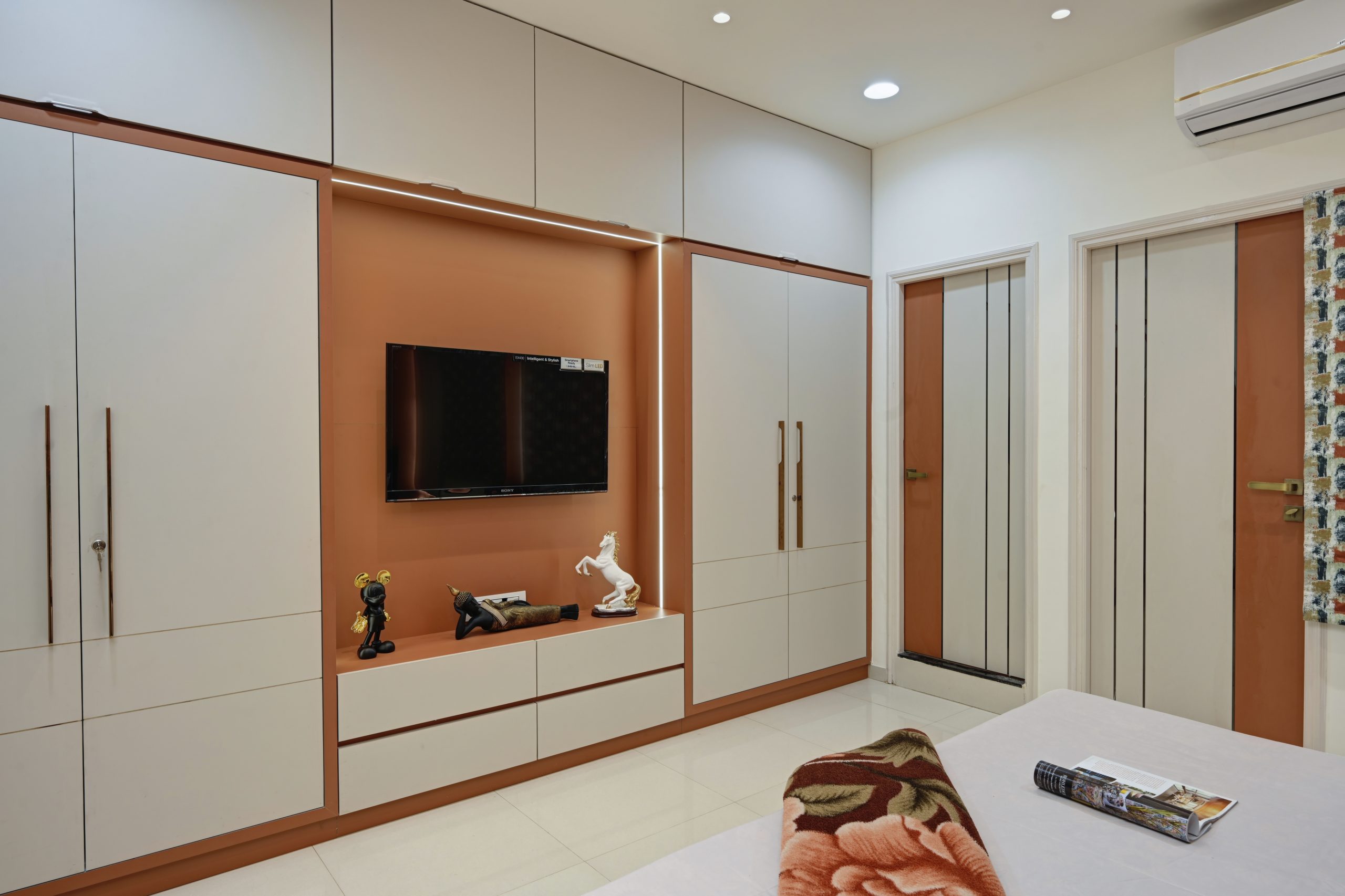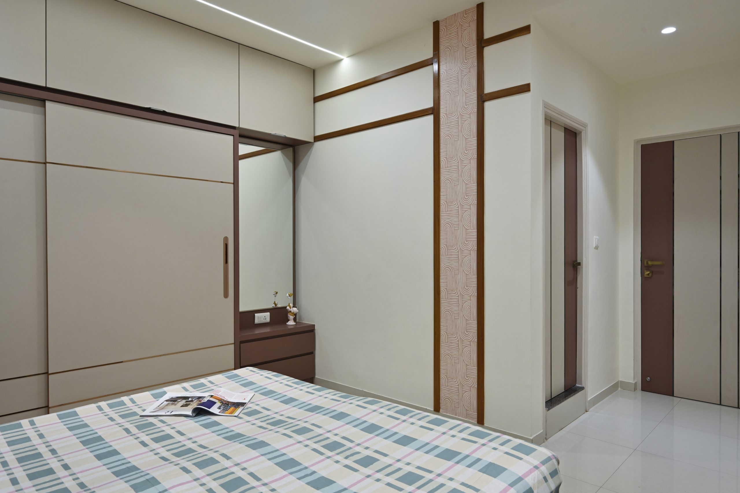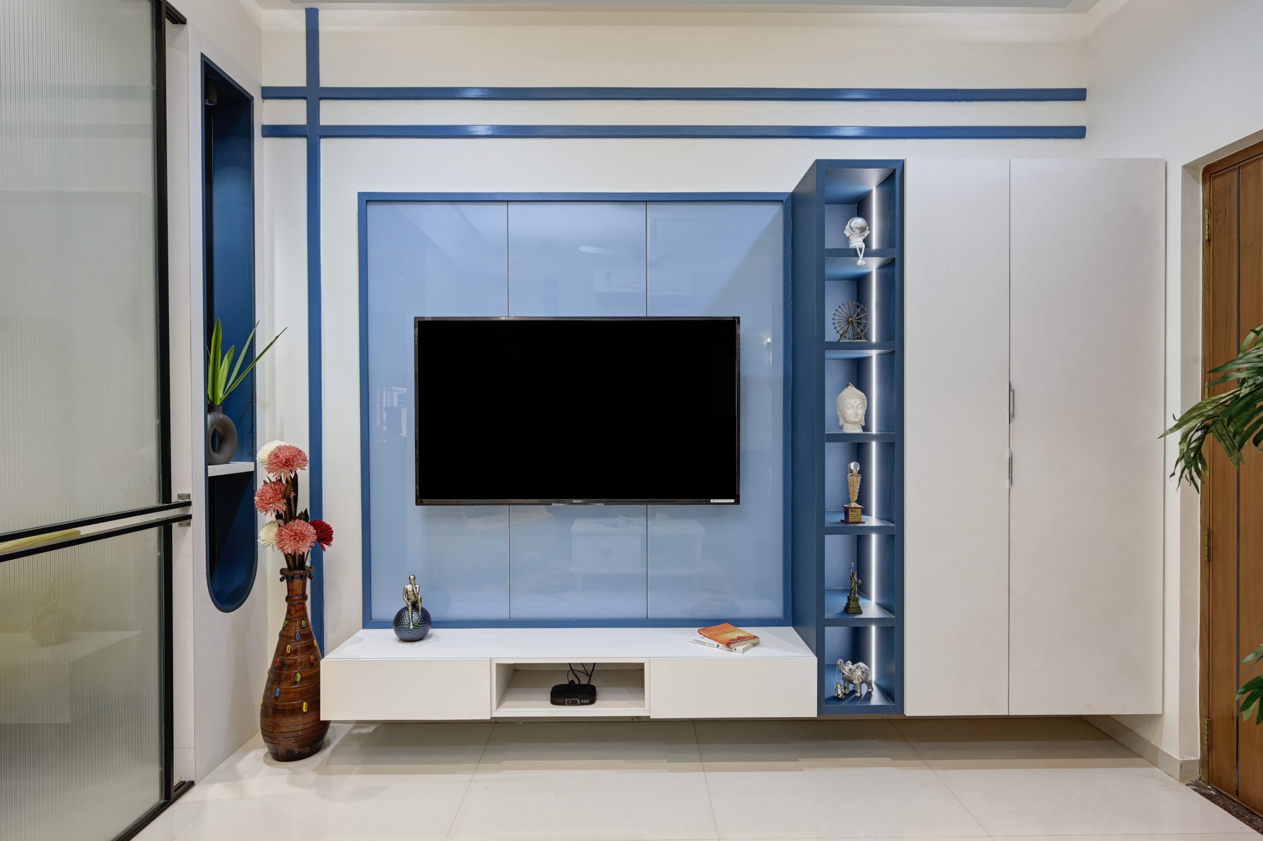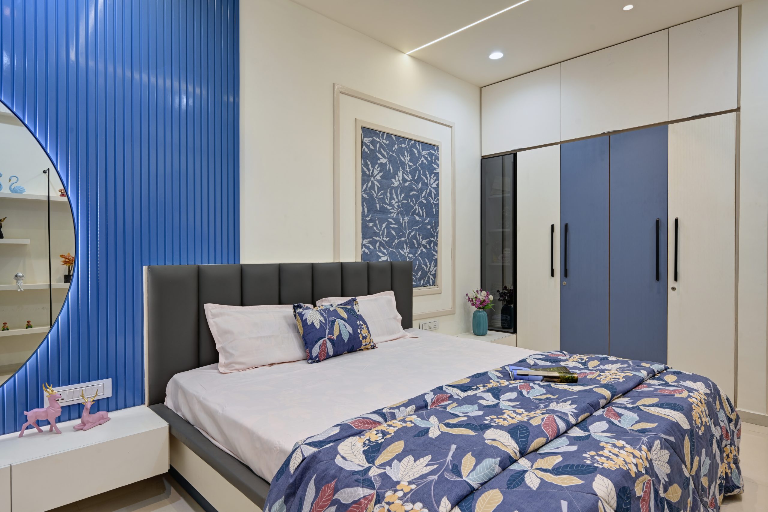 In the bedrooms, the design adopts distinct moods. One bedroom uses a blue and white palette with floral motifs and a striking circular mirror panel, creating a serene, almost dreamy ambiance.