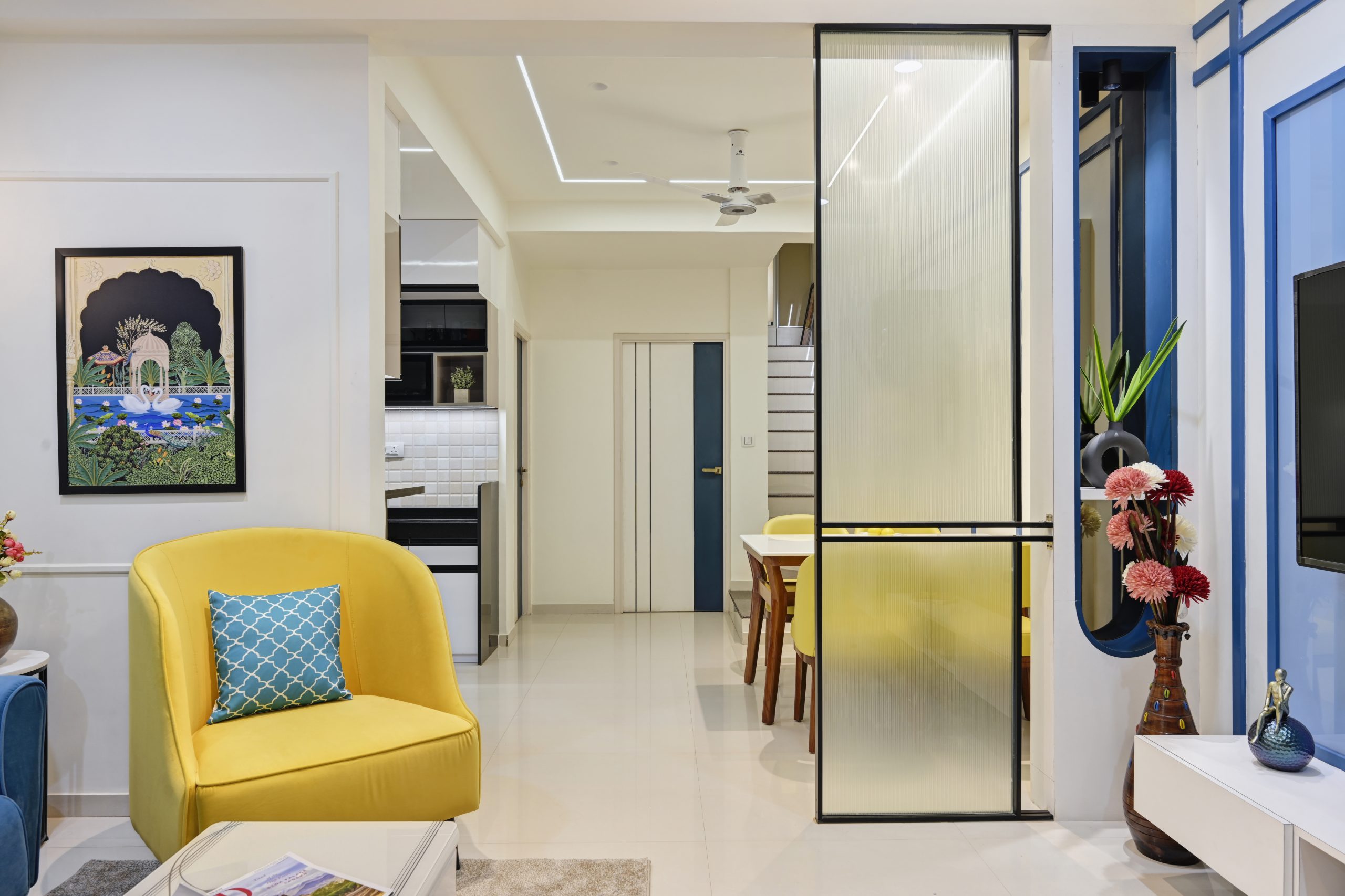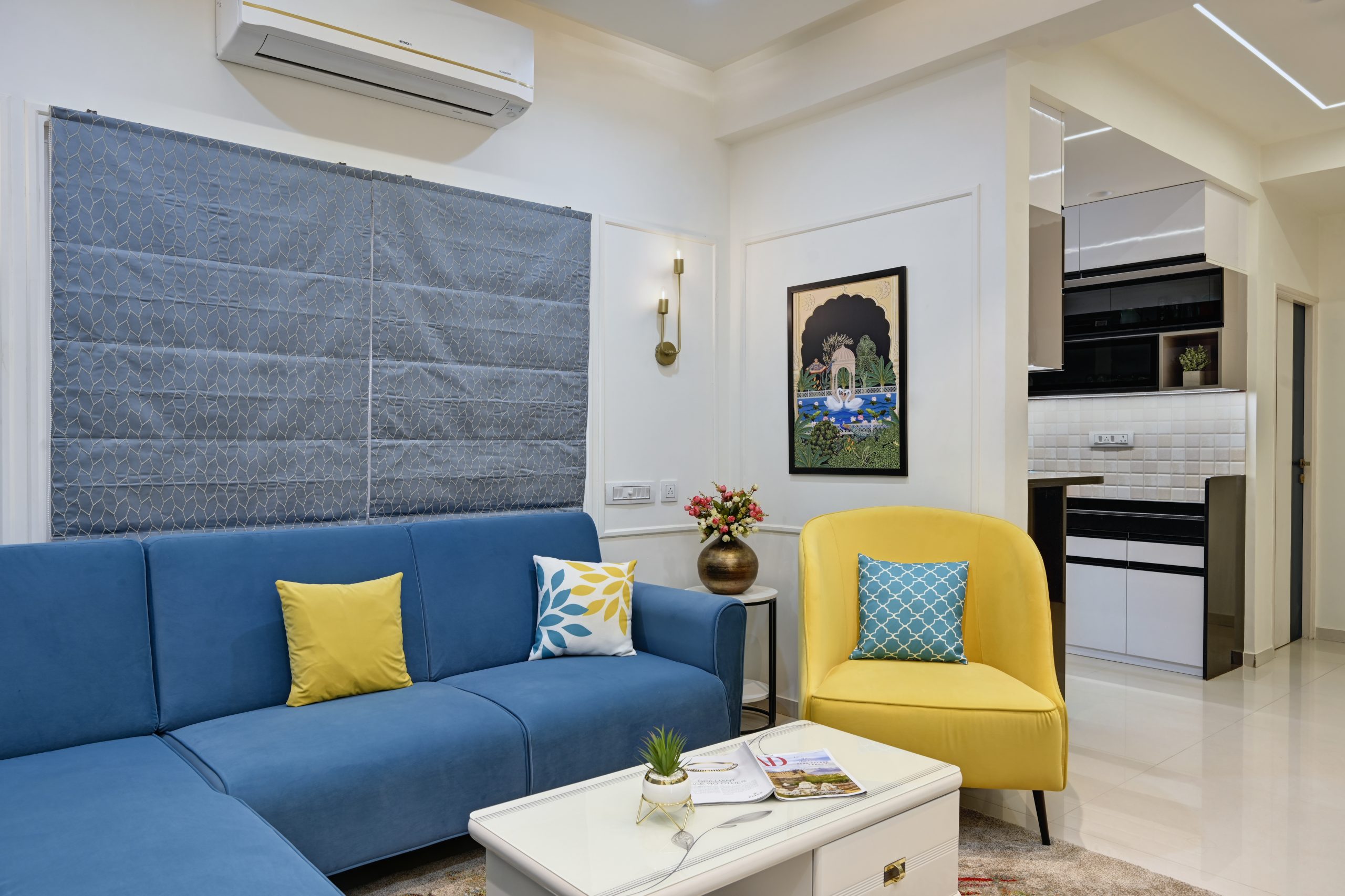 This residential interior design exudes a refreshing and vibrant aesthetic, balancing modern minimalism with playful color schemes. The living room features a bold interplay of blue and yellow, where a blue sectional sofa and bright yellow accent chair create a cheerful contrast. Complemented by geometric cushions and sleek grey blinds, the space feels both cozy and energetic. Artistic wall sconces and a traditional painting add a hint of cultural elegance.