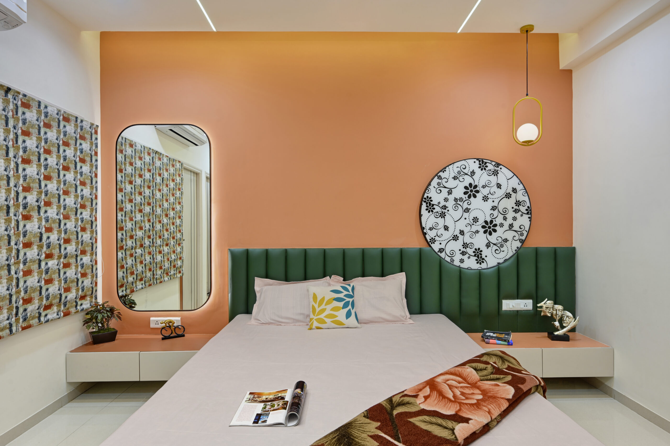 The second bedroom embraces a warmer palette, with a peach and green combination that feels inviting, a circular black and white art piece, and a luxurious green headboard—an inviting blend of tradition and trend.
