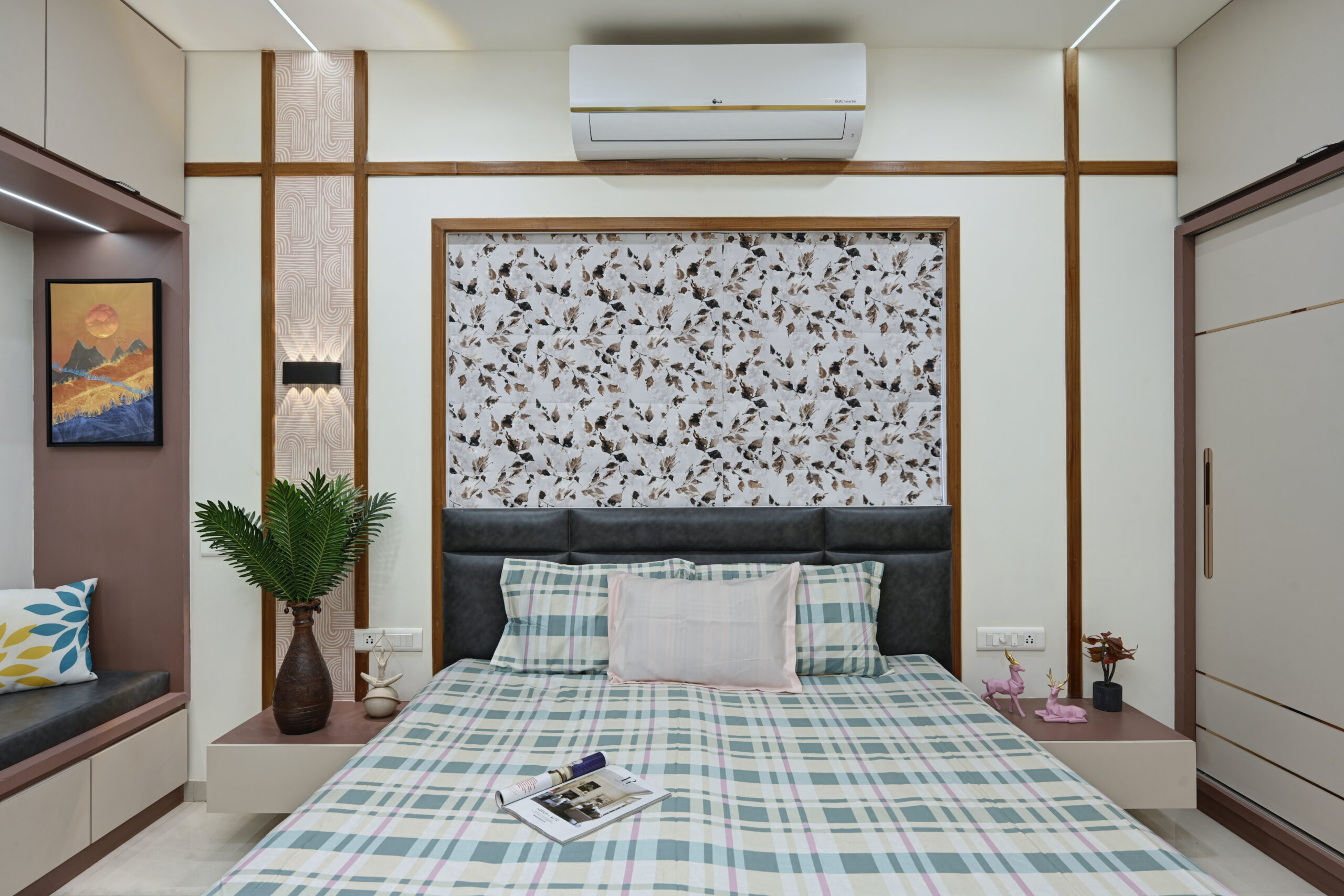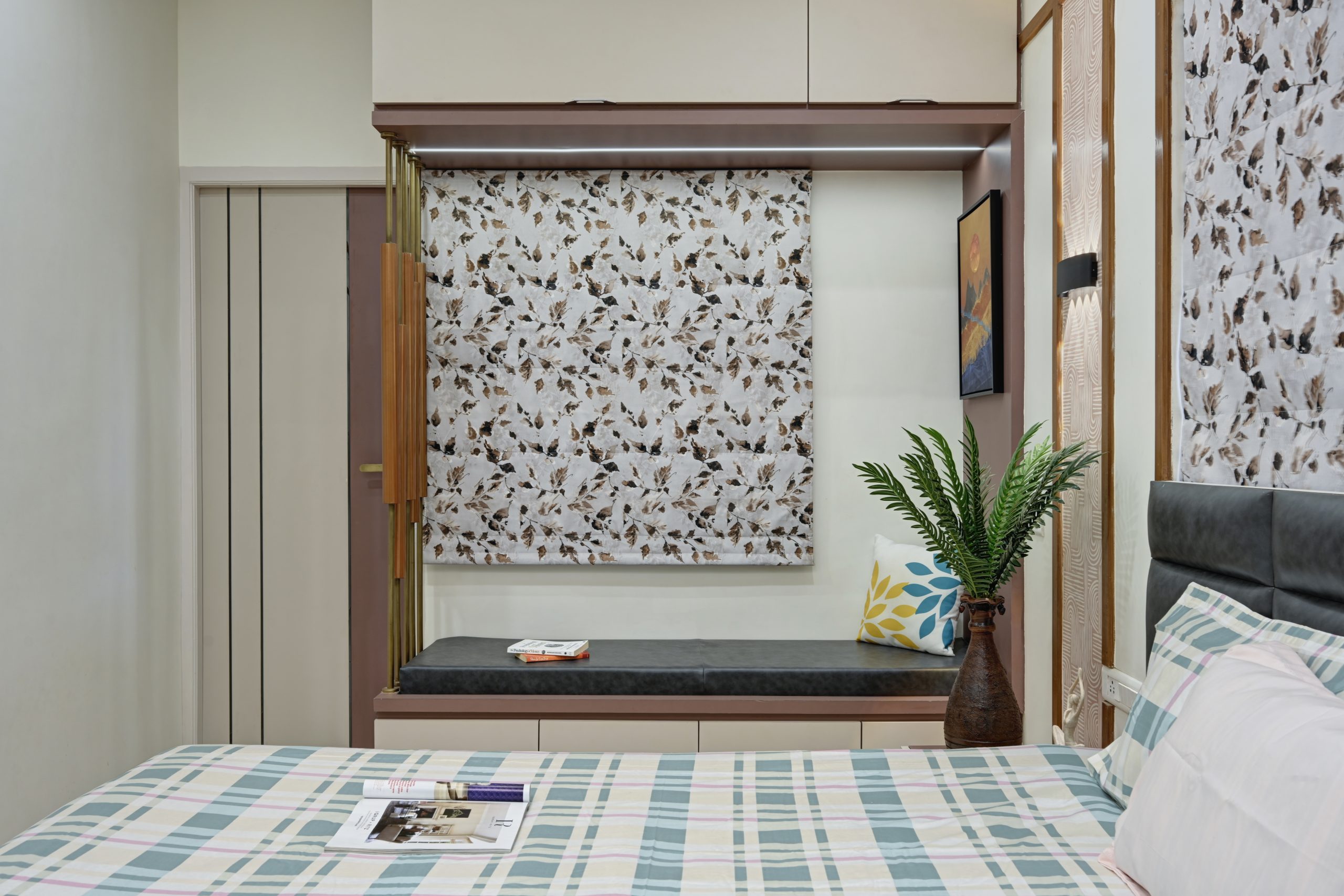 The newest addition is a cozy, neutral-toned bedroom with a plaid bedspread and leafy printed blinds. It features a cushioned window seat ideal for quiet reading moments, enhancing the space’s livability. The soft palette of beige, browns, and pastels is complemented by tactile elements like the velvet headboard and textured wall paneling, blending functionality with a sense of peace and warmth.