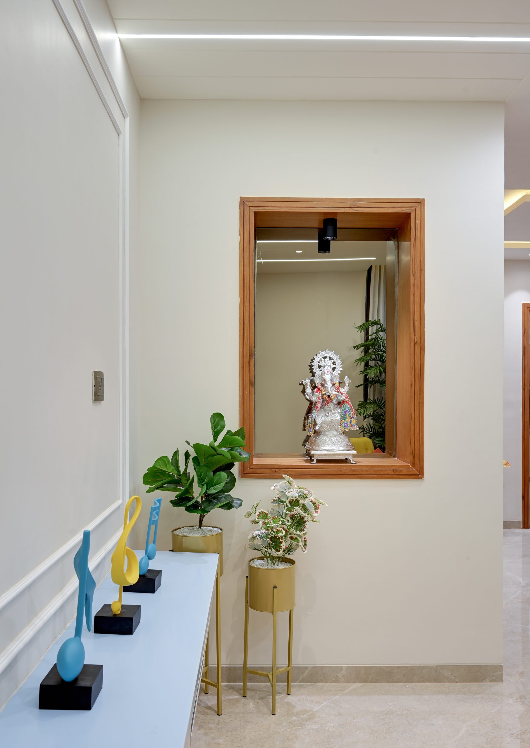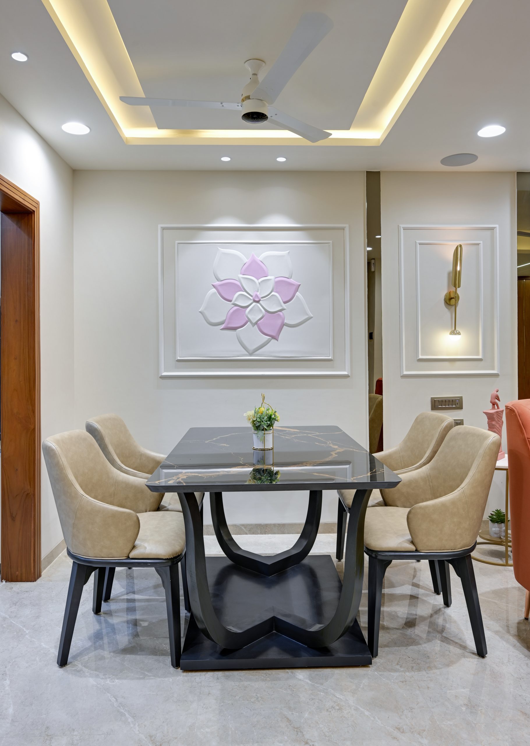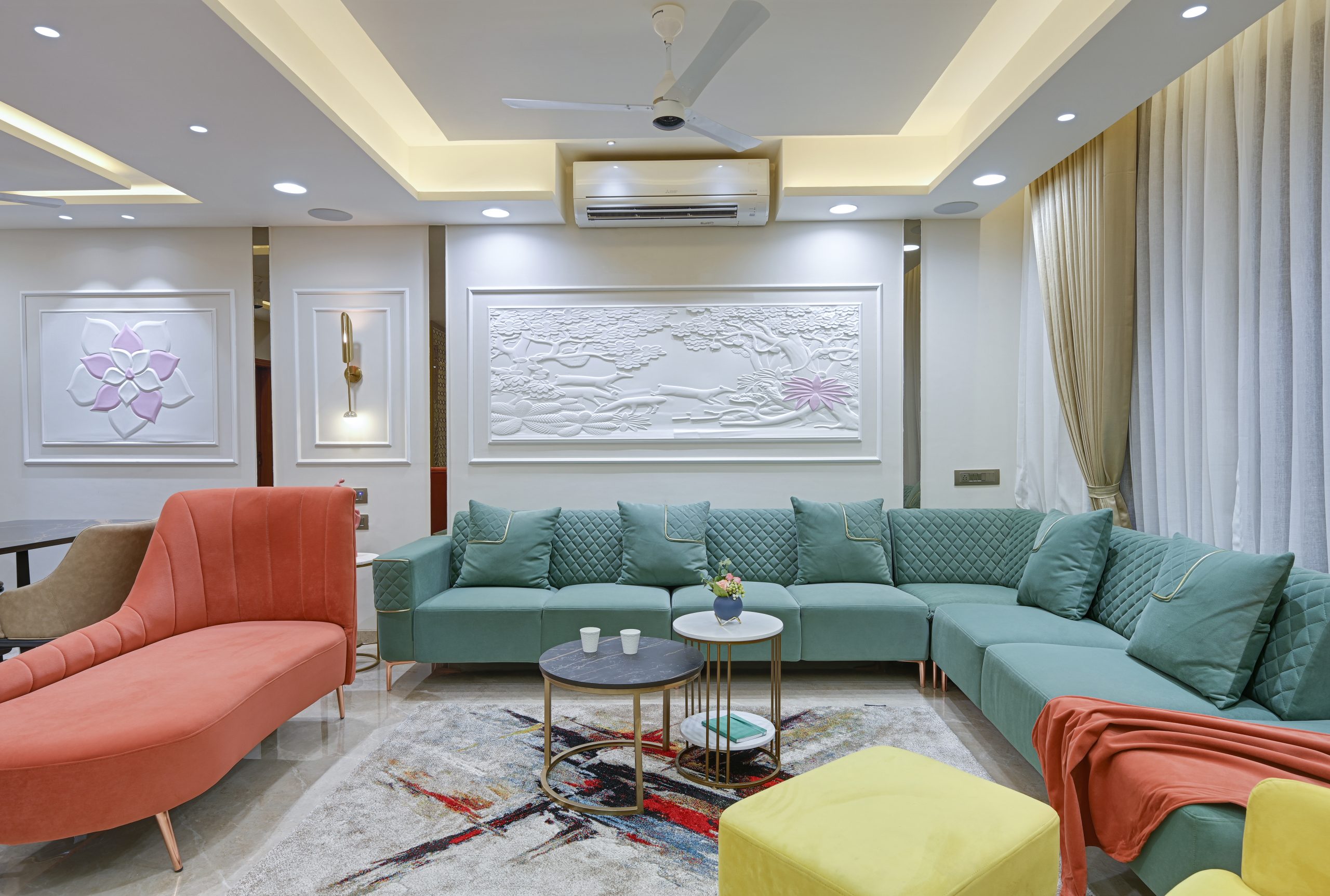 This residence reflects modern elegance with vibrant accents and thoughtful detailing. The living room features a pastel green sectional sofa, coral lounge seating, and artistic wall panels that add a refined charm.