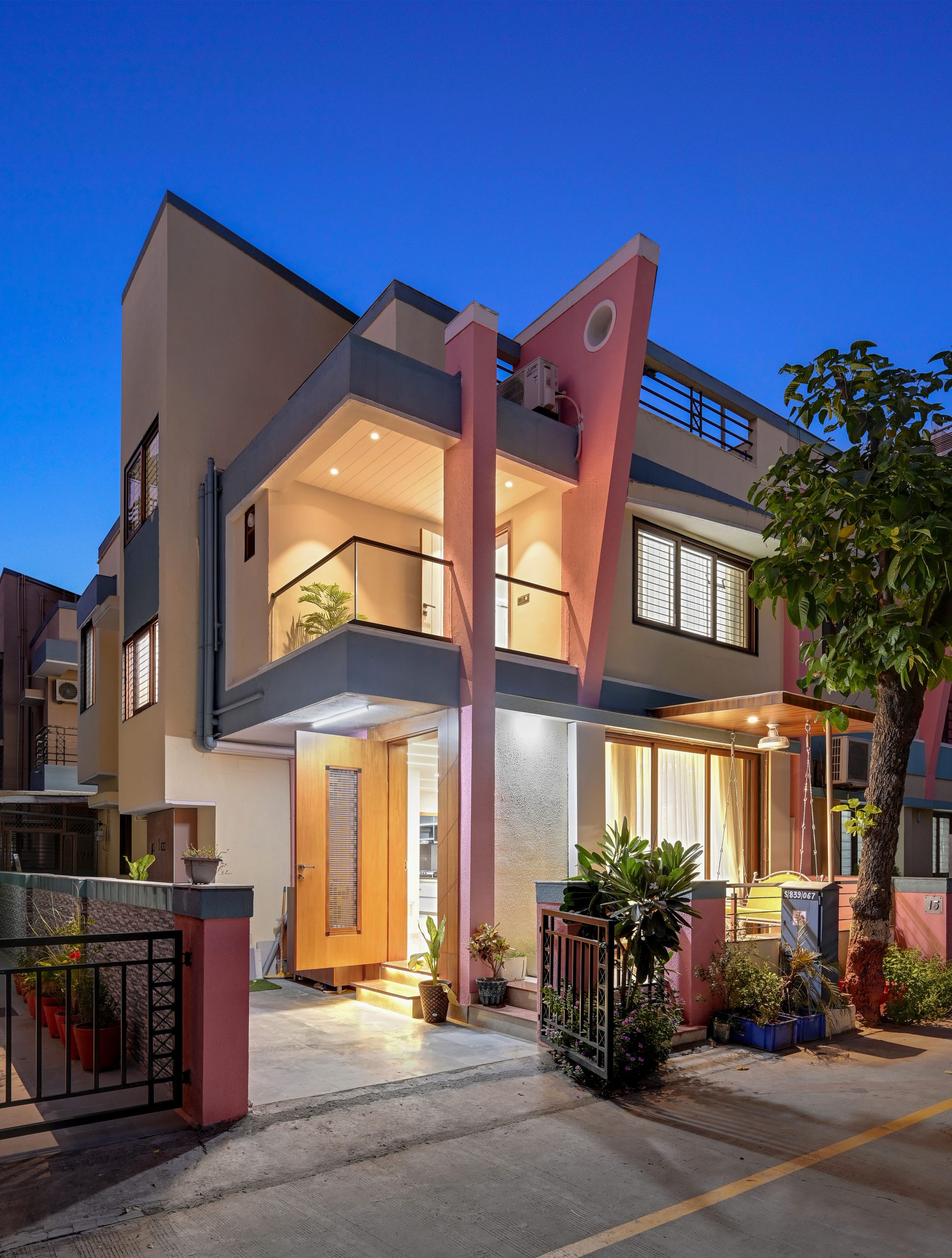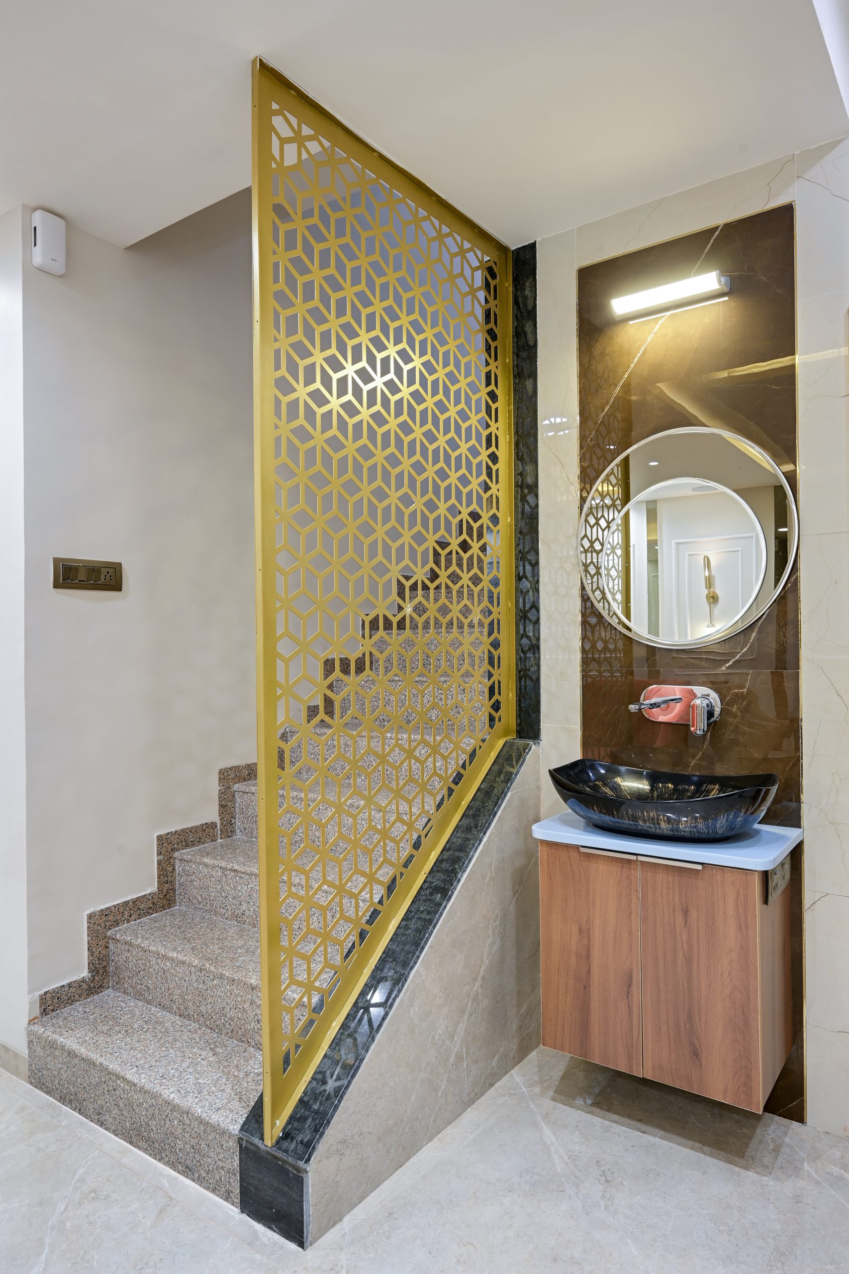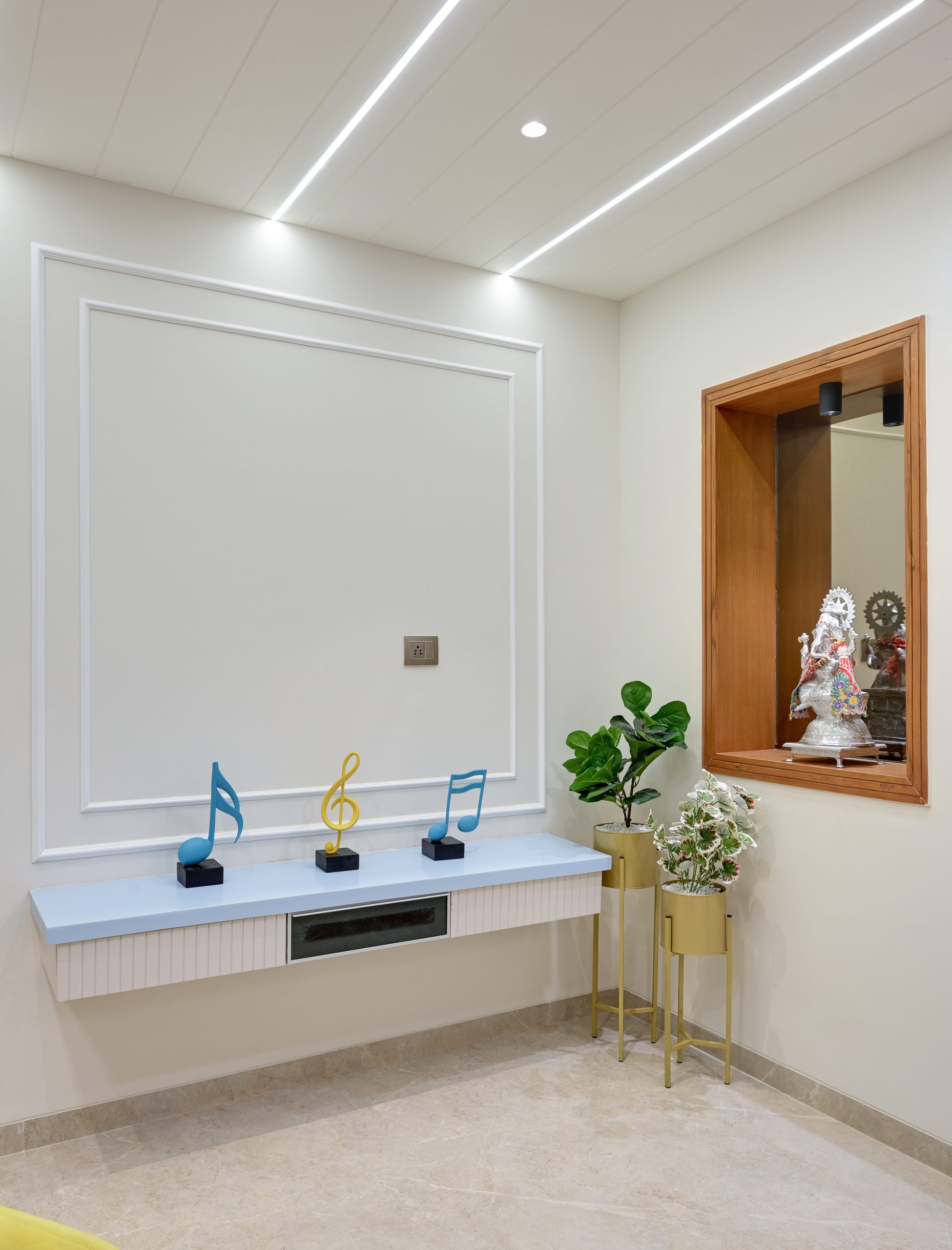 This residence reflects modern elegance with vibrant accents and thoughtful detailing. The living room features a pastel green sectional sofa, coral lounge seating, and artistic wall panels that add a refined charm.