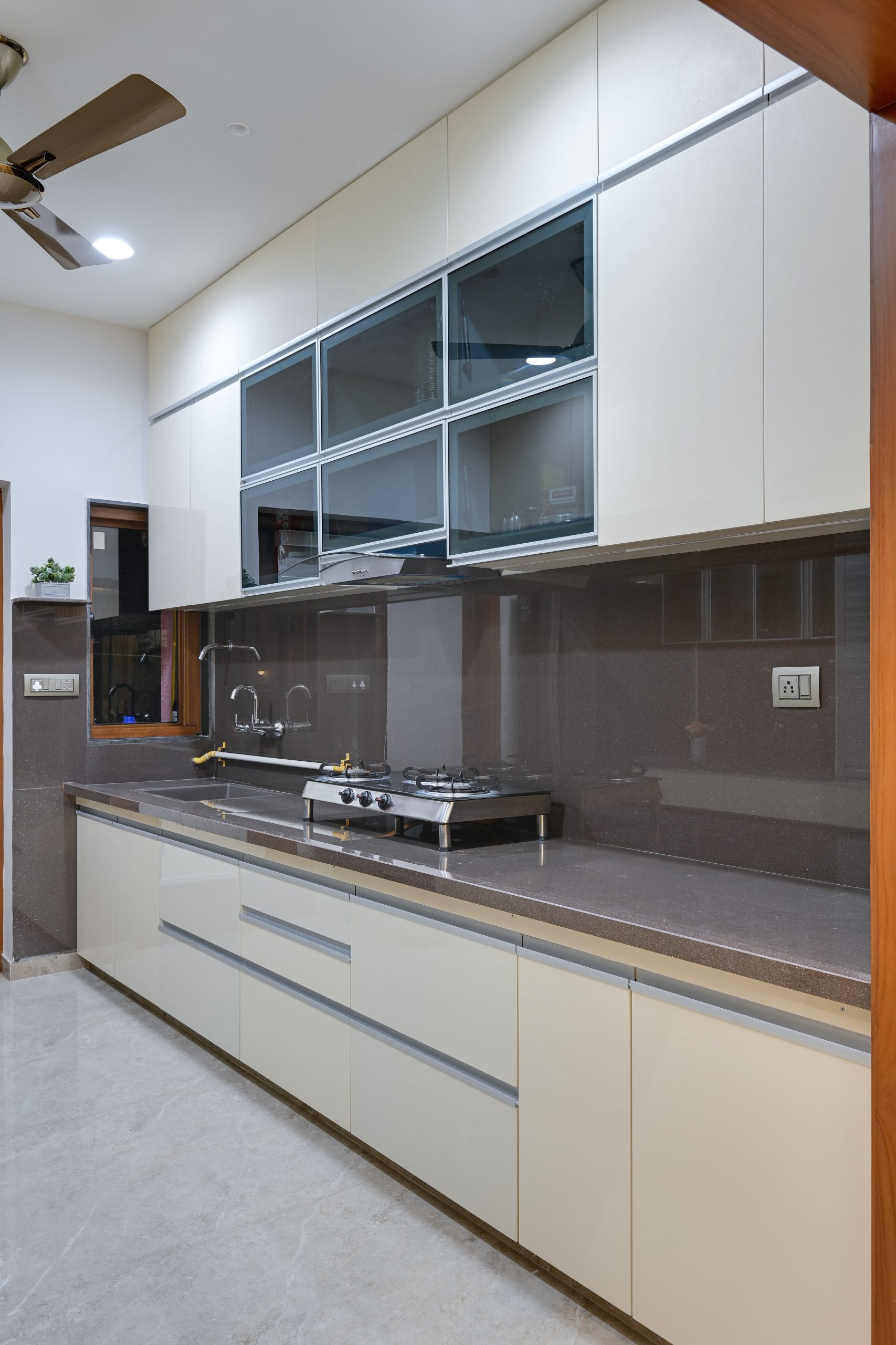The kitchen is designed with a minimalist modular layout, sleek glossy cabinets, and functional storage, ensuring a perfect blend of aesthetics and practicality.