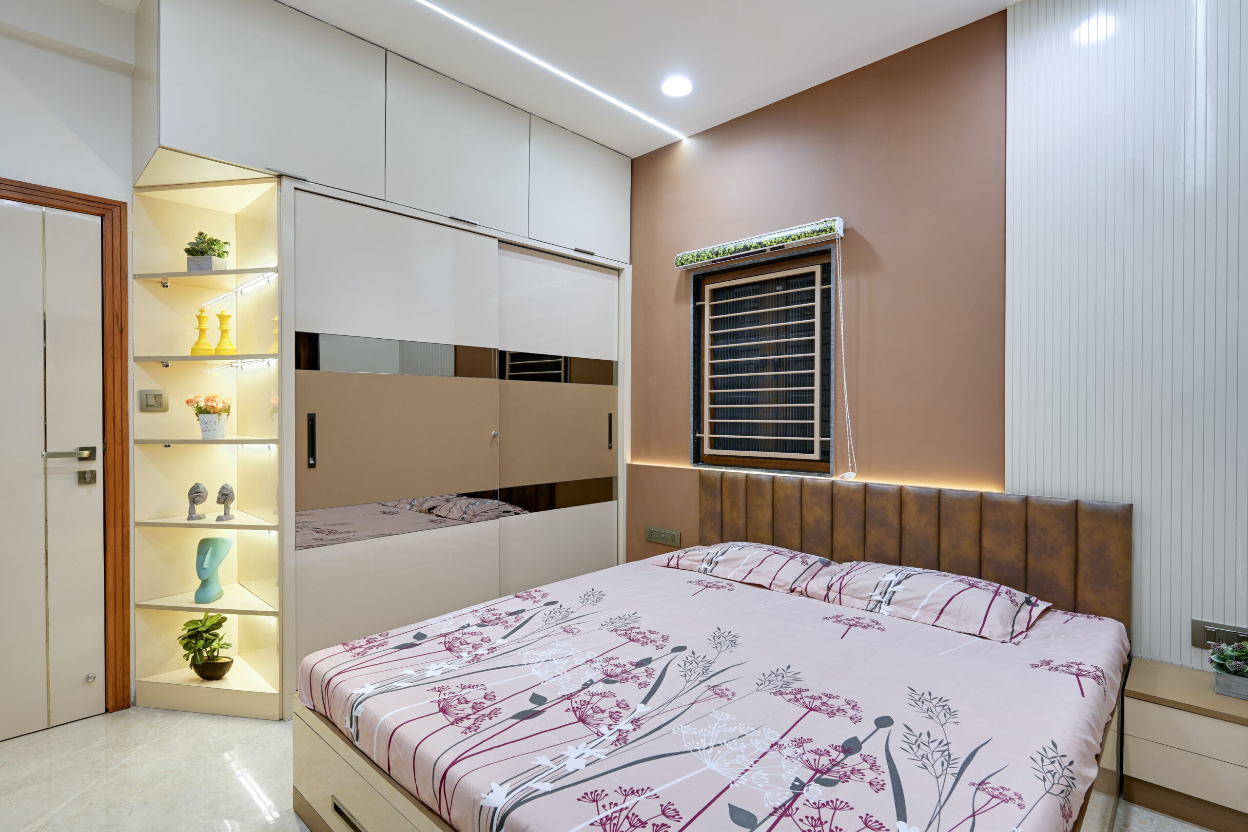 Bedrooms follow a calming color palette, enhanced by soft furnishings, mirrored wardrobes, and cozy seating spaces, creating a warm and inviting atmosphere.
