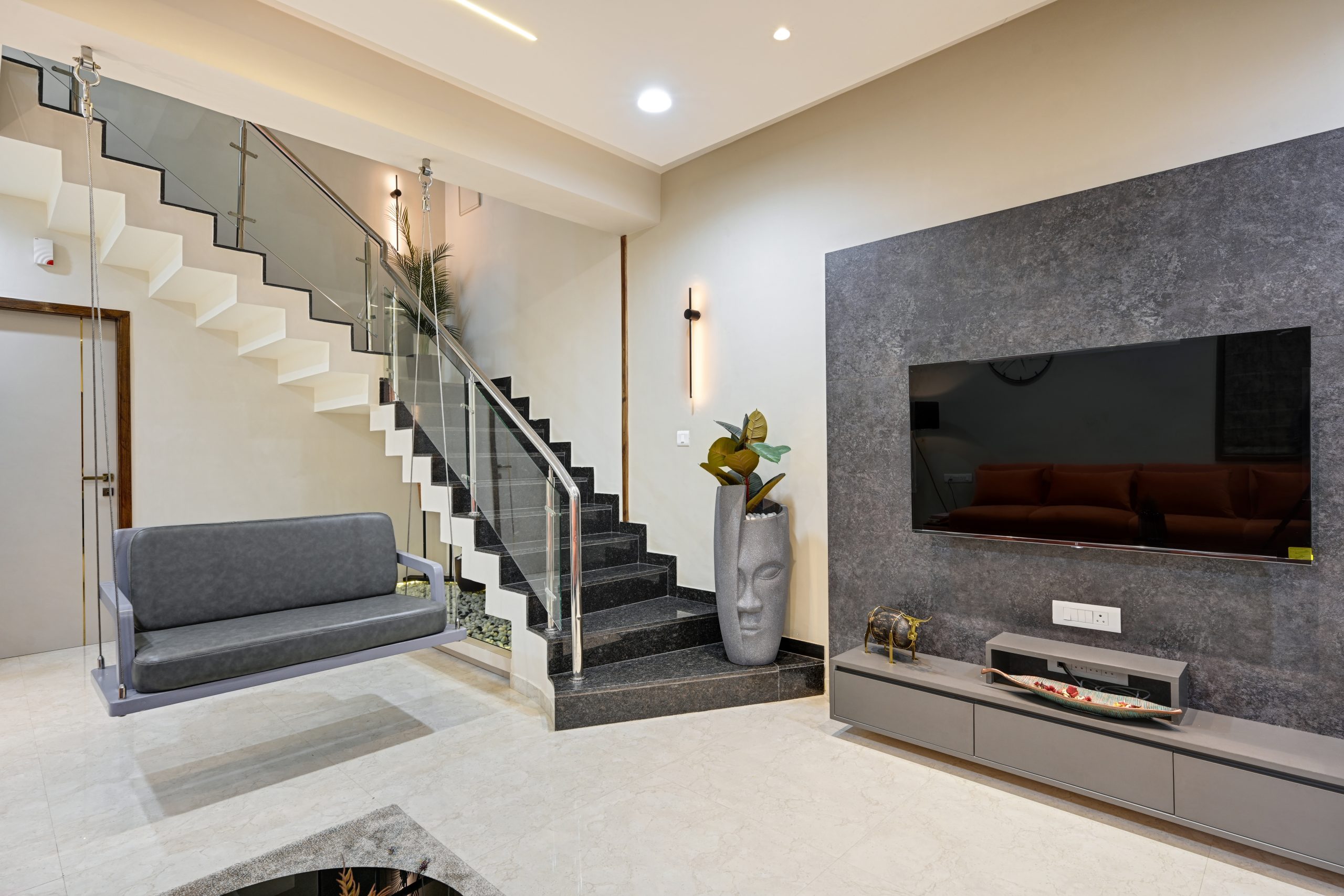 The living room serves as the centerpiece, featuring a bright orange sofa that adds vibrancy and energy. A modern, sleek swing brings a touch of elegance, while the TV unit panel with a concrete texture panel and indirect lighting enhances the aesthetic.
