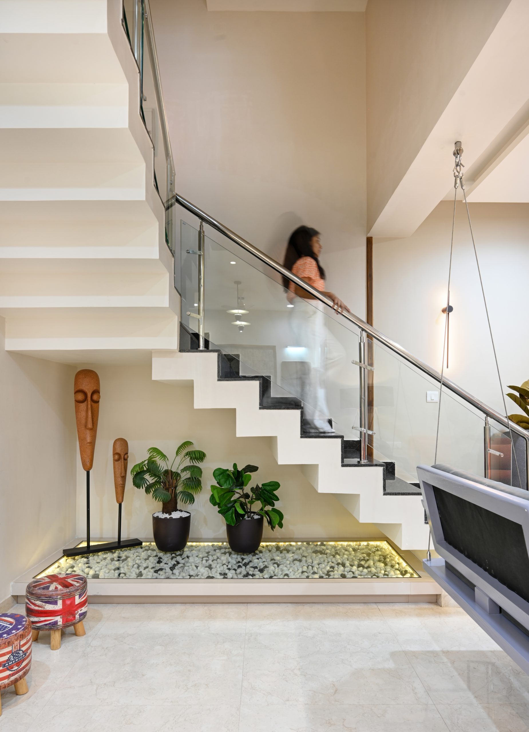 The staircase is designed with modern and sober elements, seamlessly blending into the home’s design. The space beneath the stairs is creatively utilized with decorative artifacts and lush greenery, adding charm and functionality.