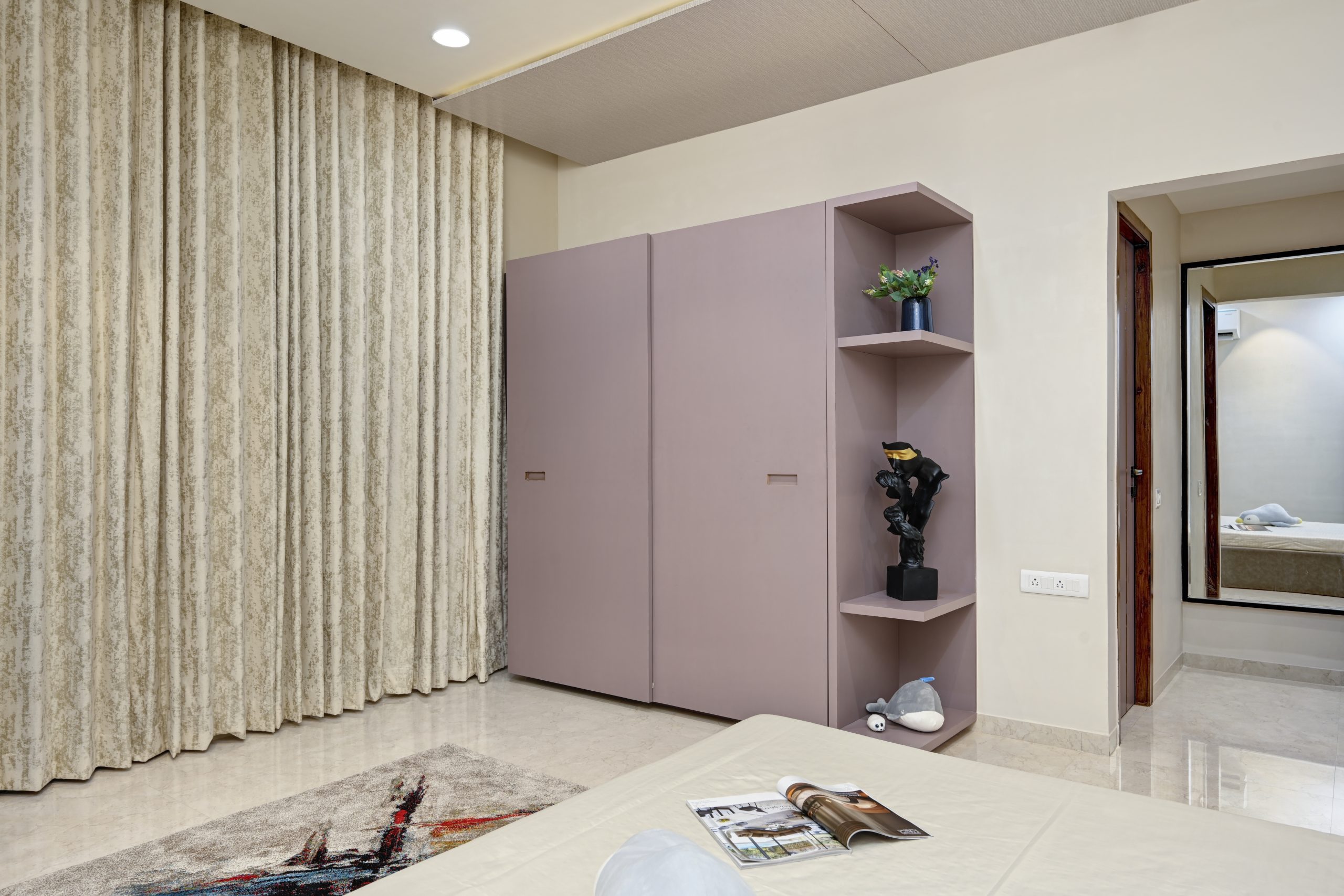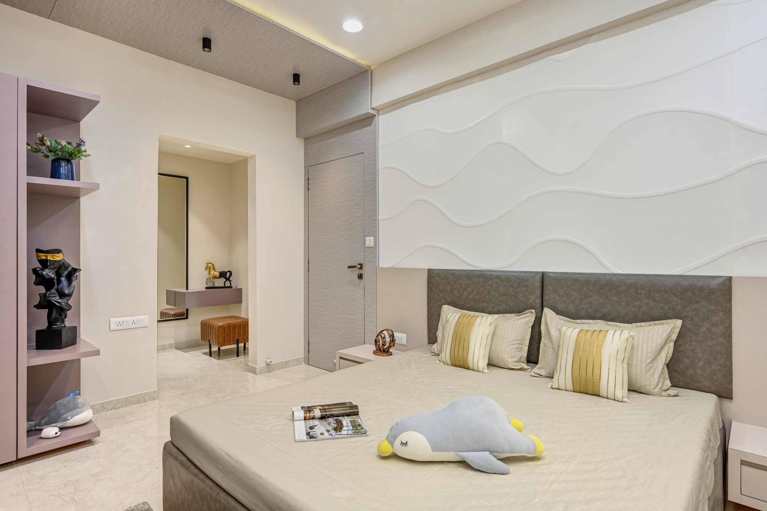 The first daughter’s room reflects simplicity and sophistication, with a wavy MDF back panel finished in PU paint. Cool tones and well-thought-out lighting create a calm, serene ambiance.
