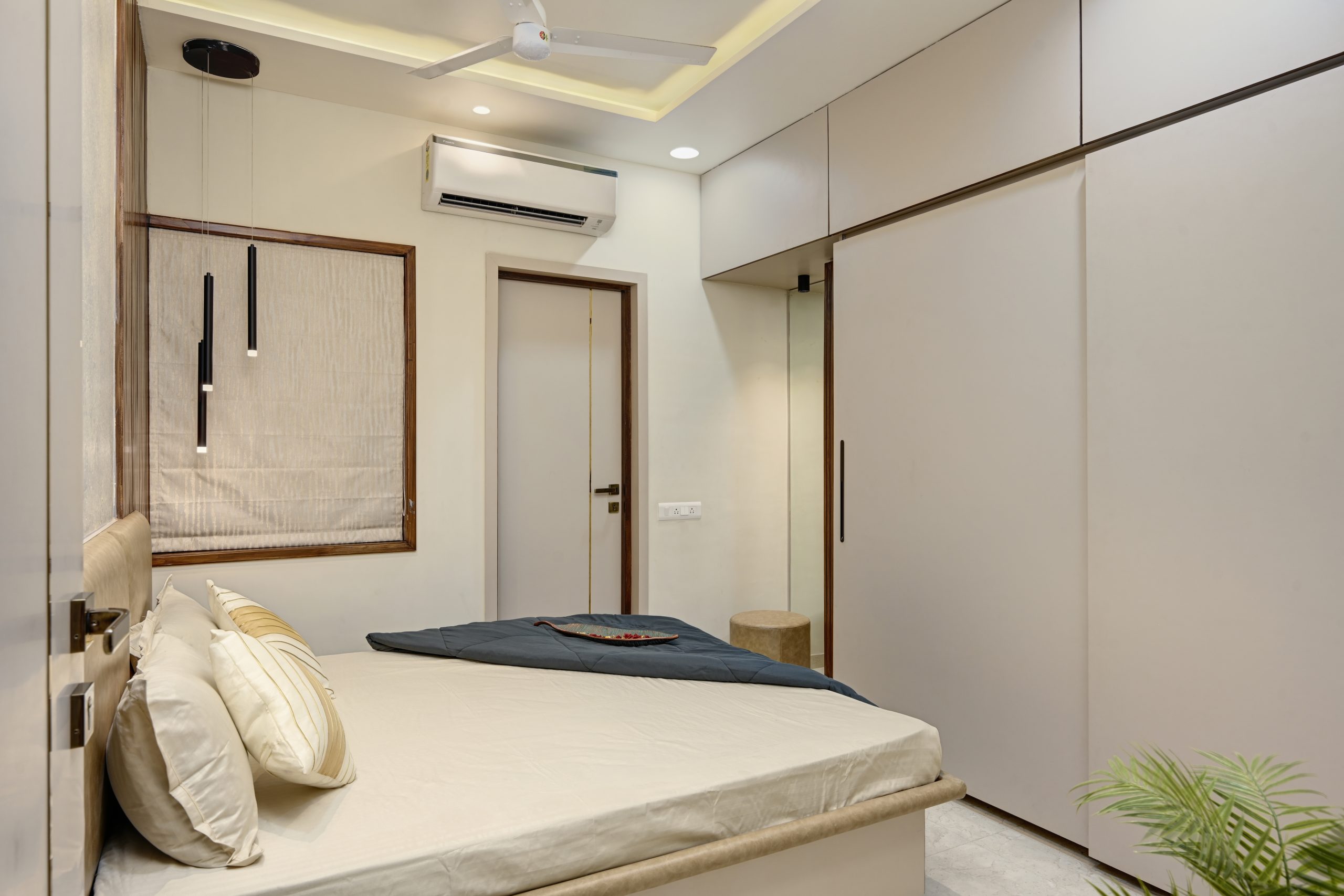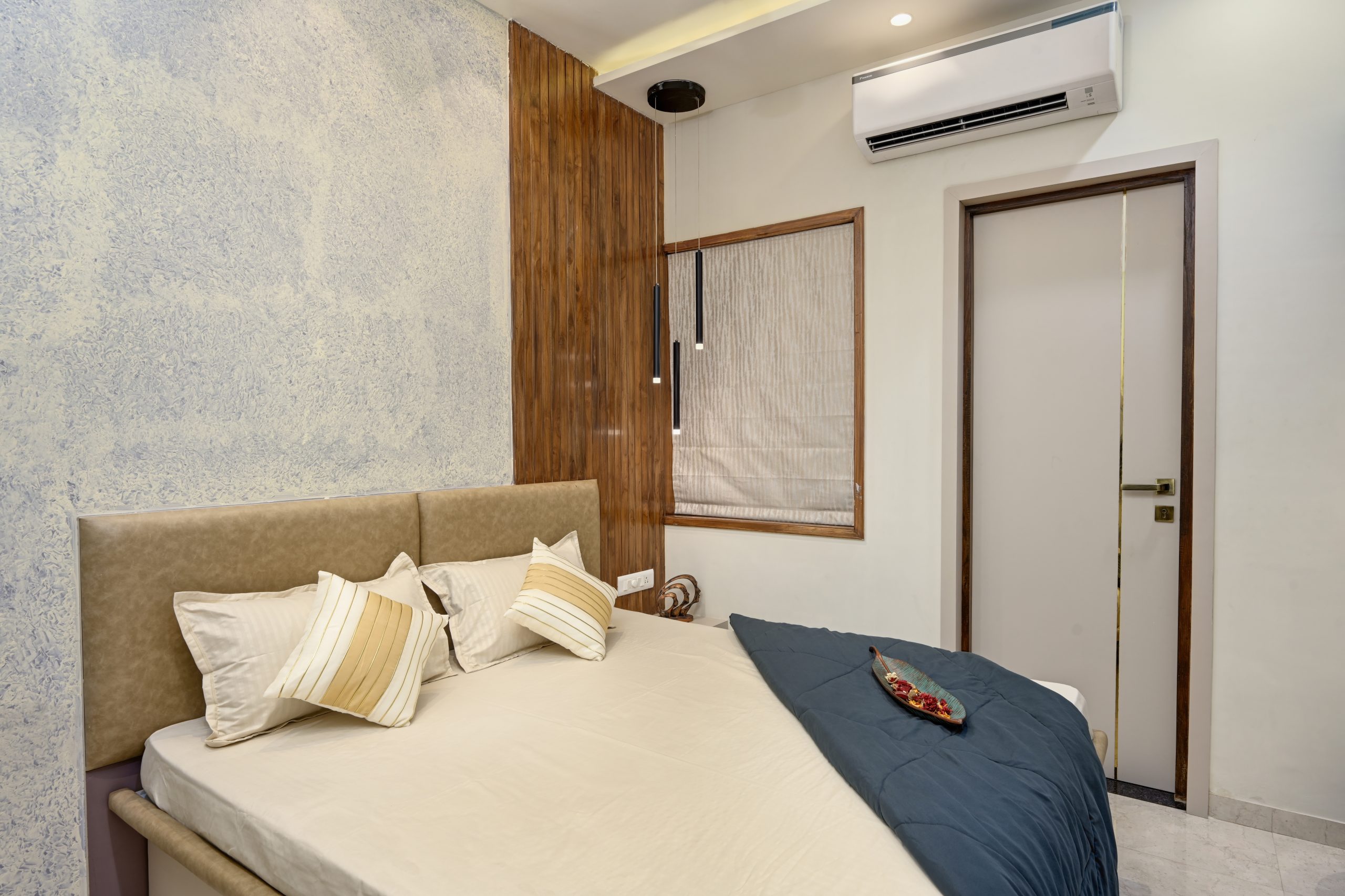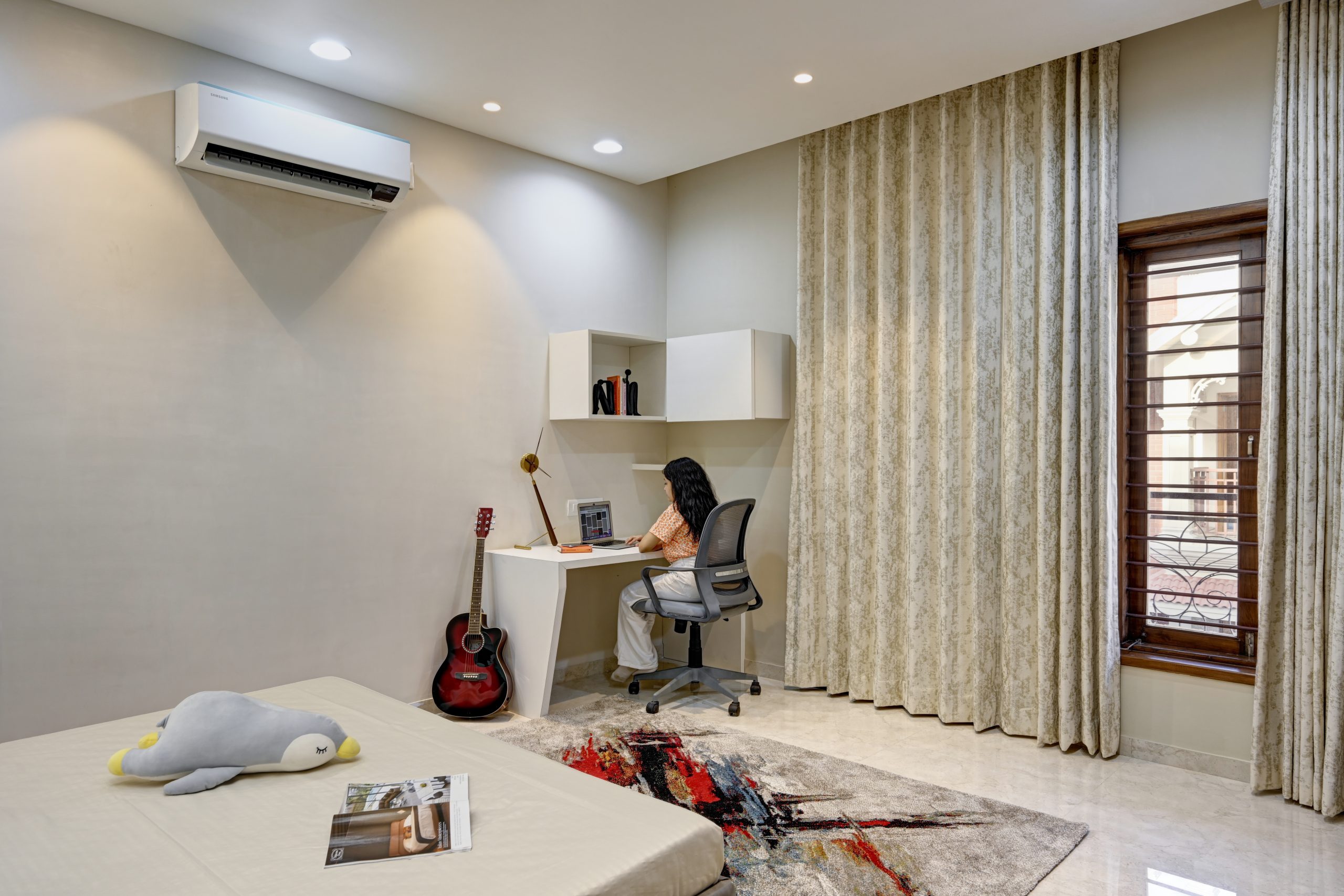 The second daughter’s bedroom features cool tones with wooden accents. The bed-back panel stands out with customized wallpaper with a minimalist girl’s face outline. A hidden door in textured laminate adds unique design element, while a well-lit, stylish dresser enhances usability.