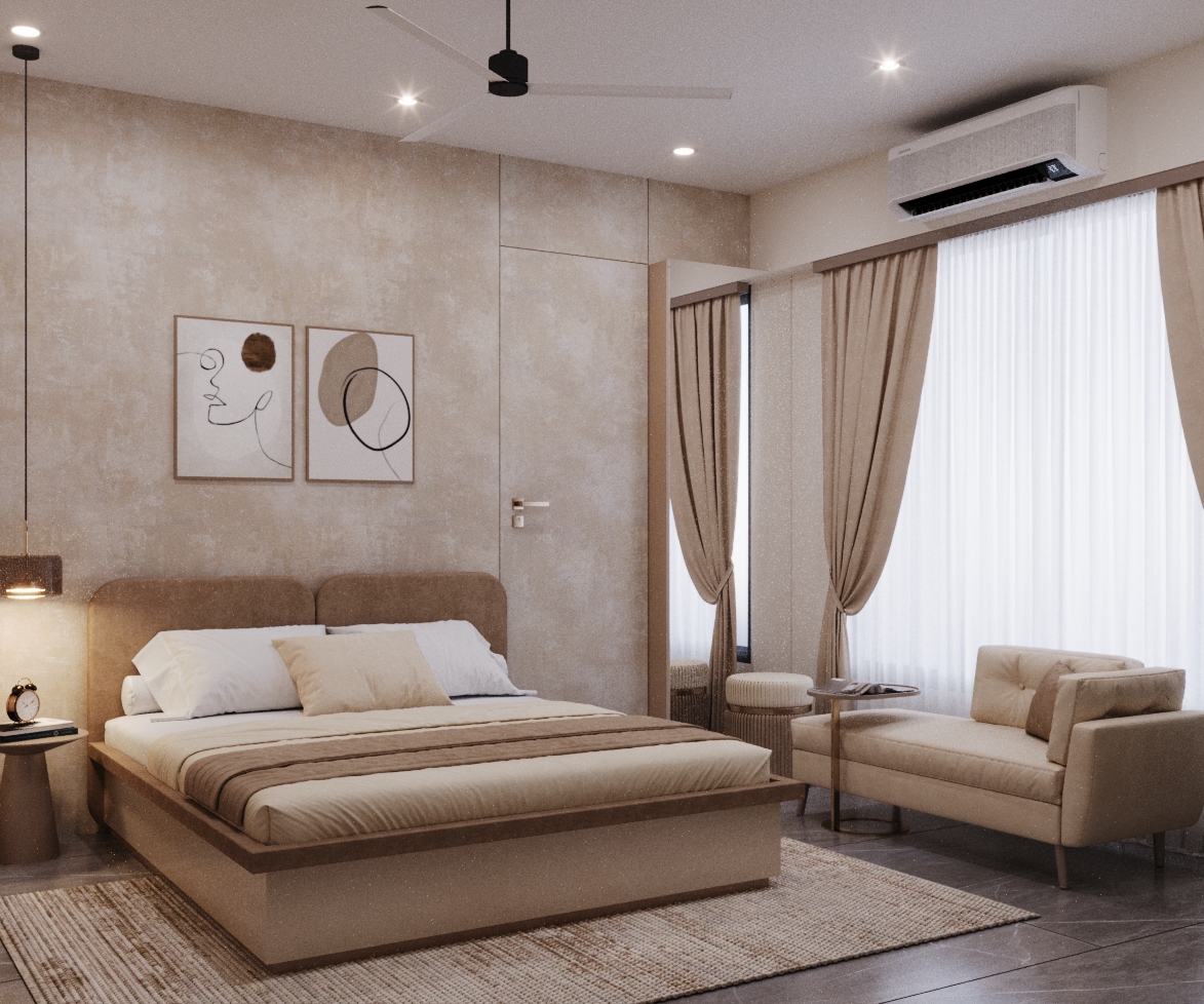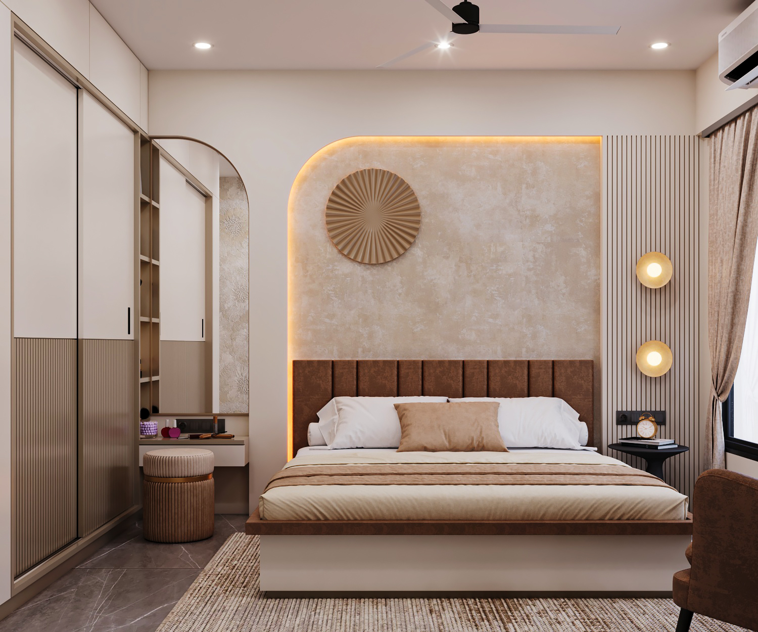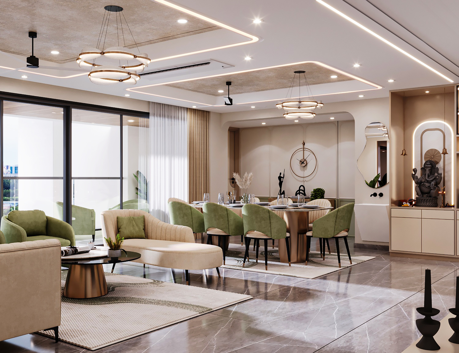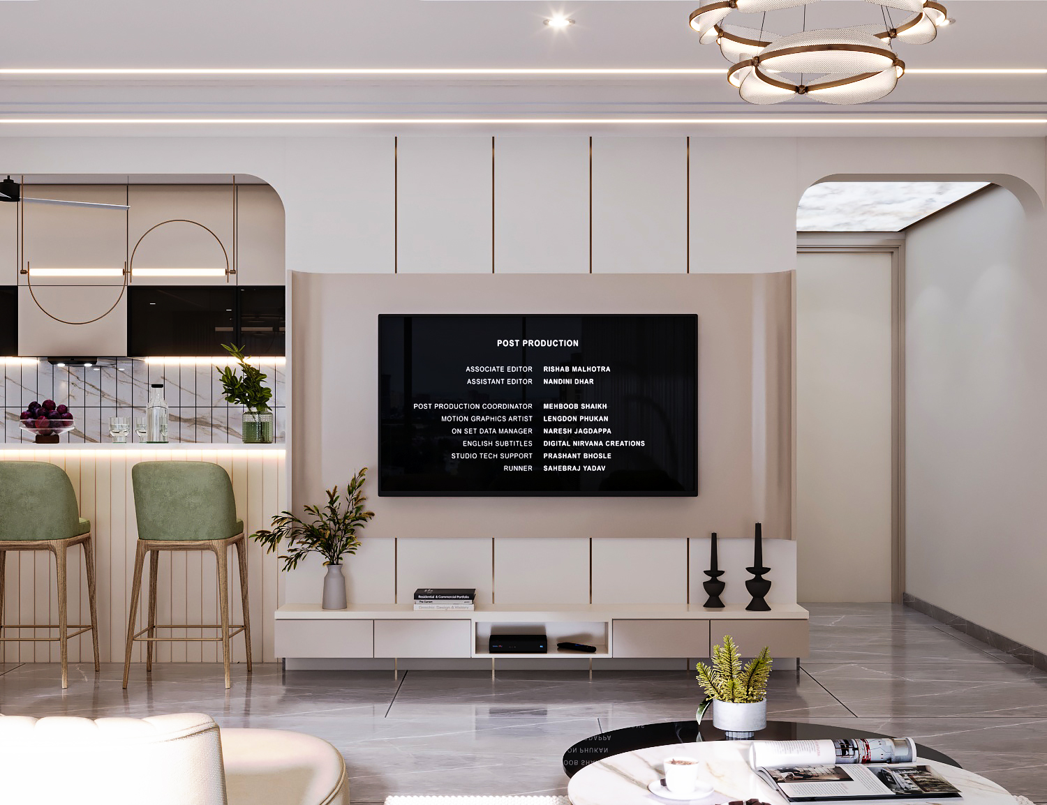 The foyer welcomes with a fabric stretch ceiling light and a sleek console table for essentials, setting a refined tone. The grand living space features an L-shaped sofa with a lounger, an accent center table, and a striking sofa-back wall adorned with bronze mirrors and artefacts. A custom-designed curved TV unit continues the soft curve theme, adding sophistication. The master bedroom includes cozy window seating, offering panoramic views of the stadium. Another master bedroom embraces subtle tones highlighted with warm browns, while the guest room and mother’s room reflect comfort. A neutral colour palette with earthy greens and warm browns ties the home together in harmony.