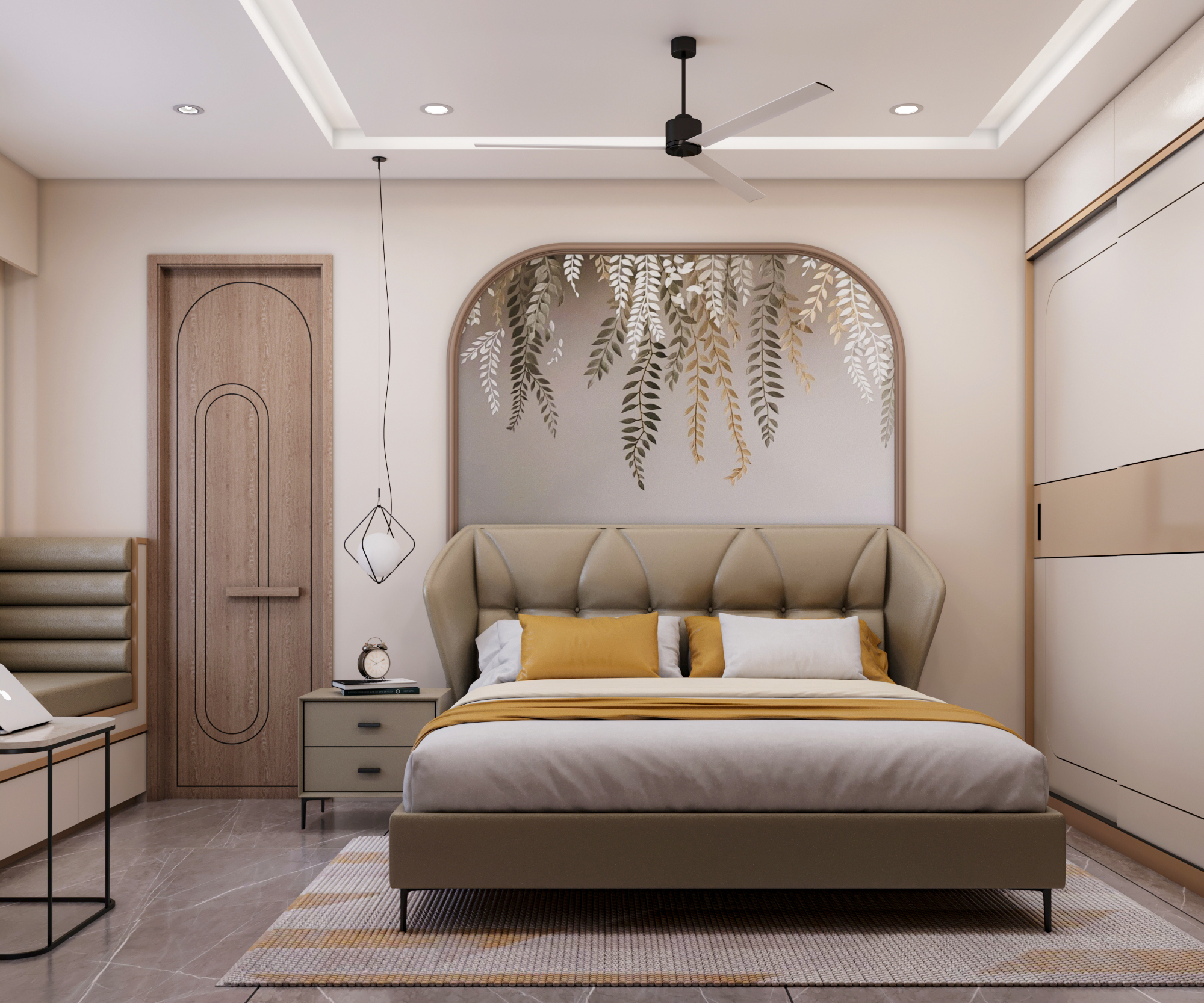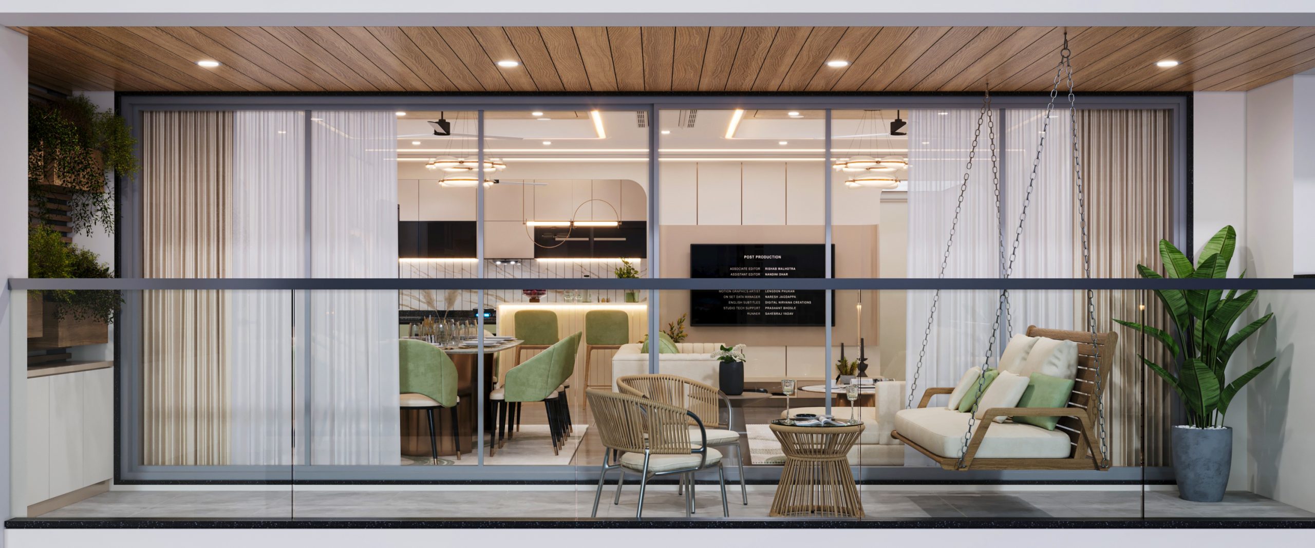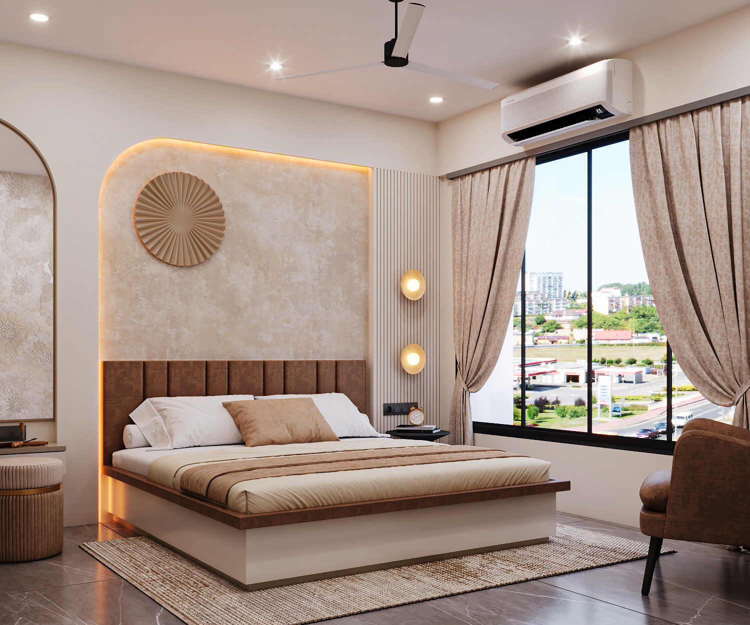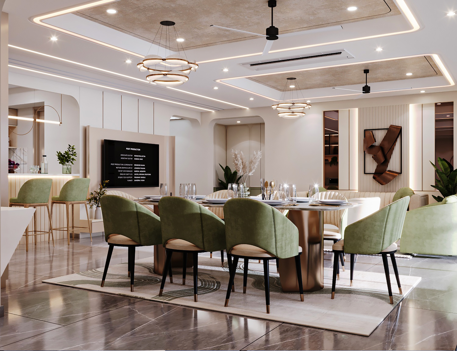 The foyer welcomes with a fabric stretch ceiling light and a sleek console table for essentials, setting a refined tone. The grand living space features an L-shaped sofa with a lounger, an accent center table, and a striking sofa-back wall adorned with bronze mirrors and artefacts. A custom-designed curved TV unit continues the soft curve theme, adding sophistication. The master bedroom includes cozy window seating, offering panoramic views of the stadium. Another master bedroom embraces subtle tones highlighted with warm browns, while the guest room and mother’s room reflect comfort. A neutral colour palette with earthy greens and warm browns ties the home together in harmony.