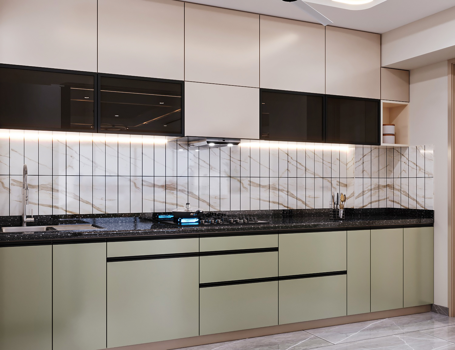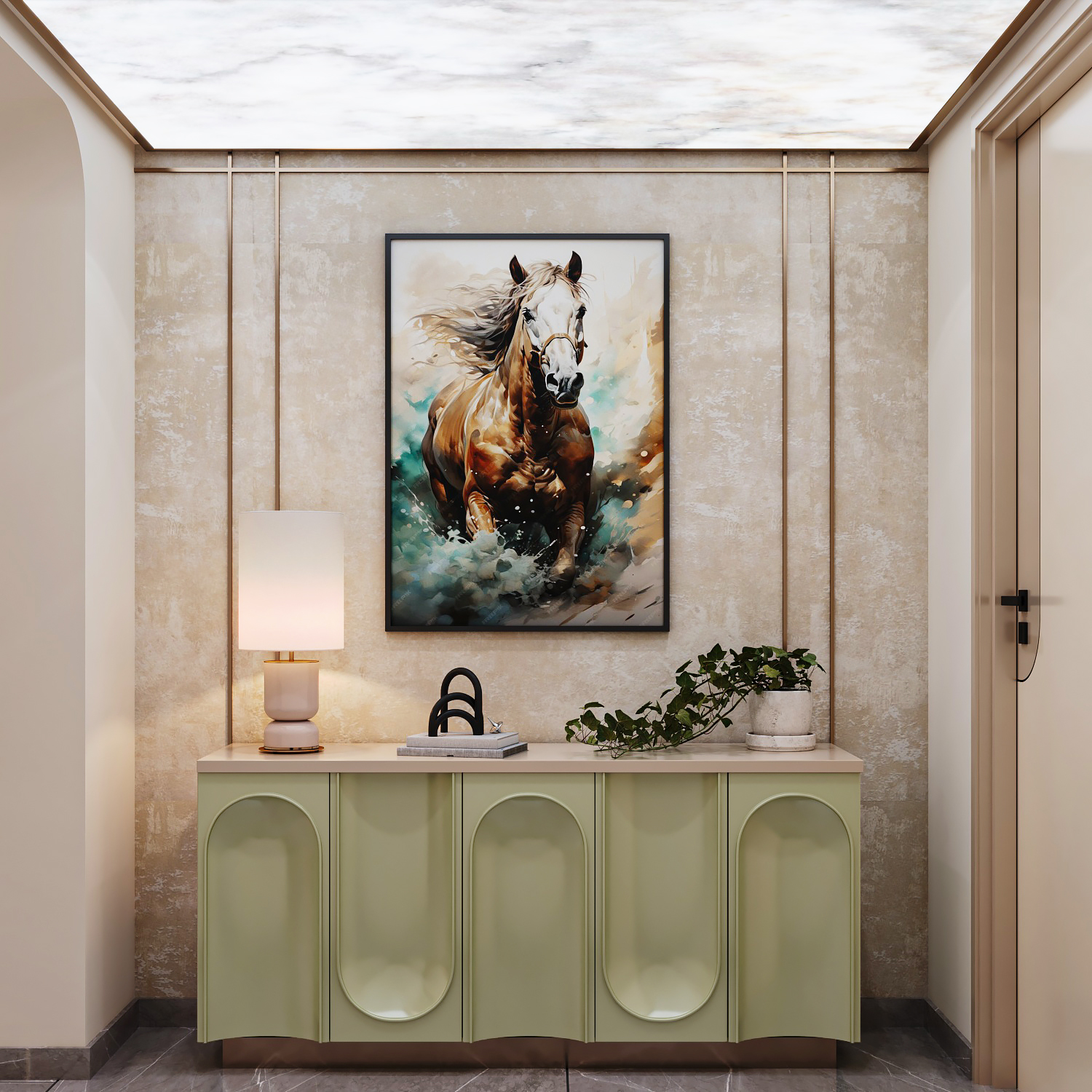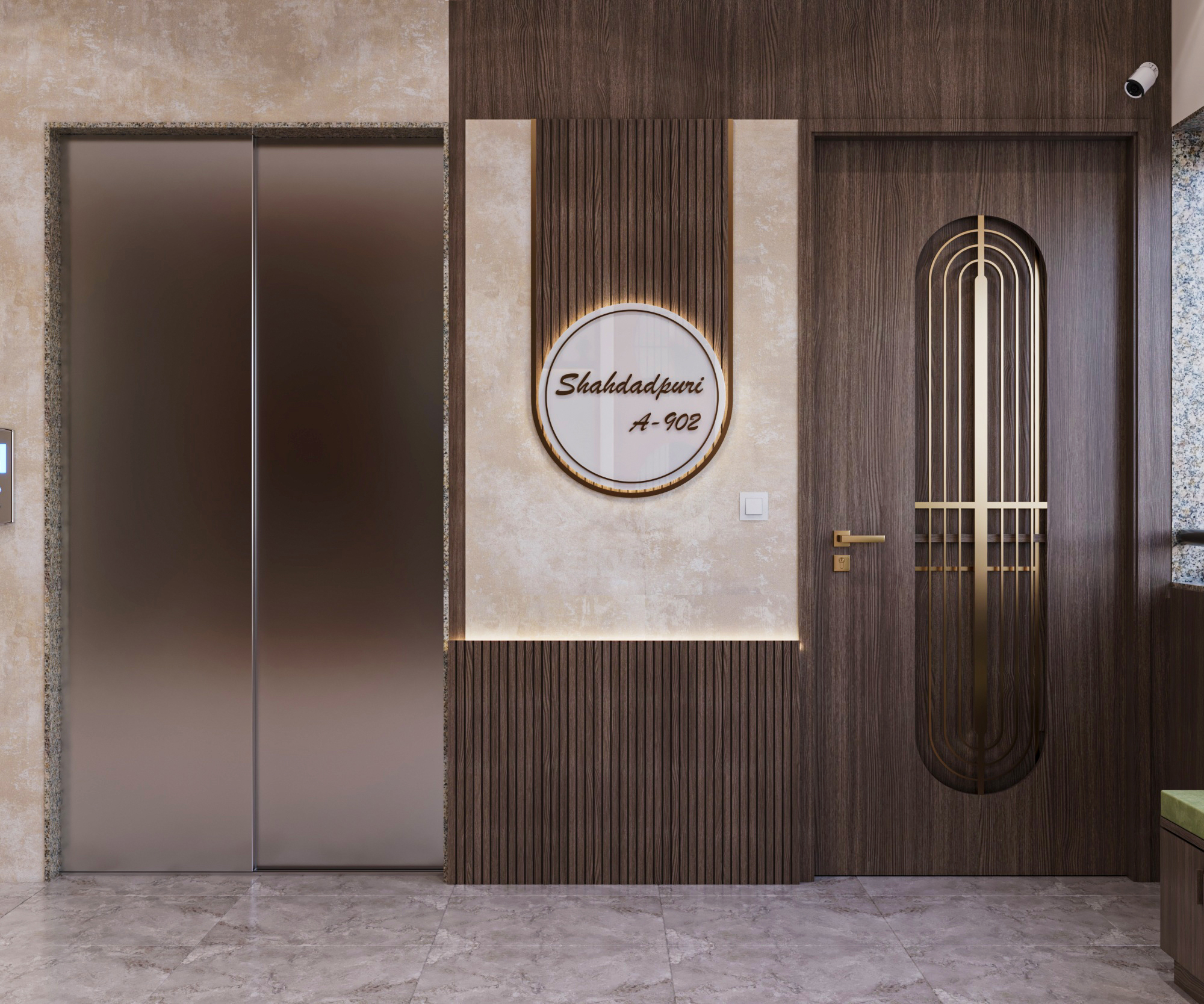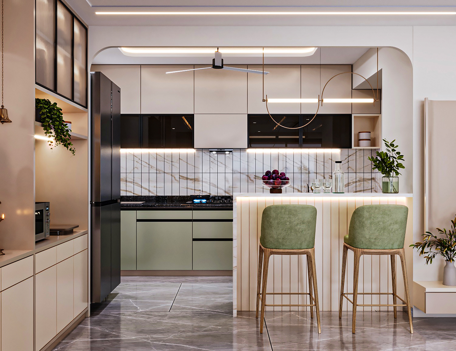 The foyer welcomes with a fabric stretch ceiling light and a sleek console table for essentials, setting a refined tone. The grand living space features an L-shaped sofa with a lounger, an accent center table, and a striking sofa-back wall adorned with bronze mirrors and artefacts. A custom-designed curved TV unit continues the soft curve theme, adding sophistication. The master bedroom includes cozy window seating, offering panoramic views of the stadium. Another master bedroom embraces subtle tones highlighted with warm browns, while the guest room and mother’s room reflect comfort. A neutral colour palette with earthy greens and warm browns ties the home together in harmony.