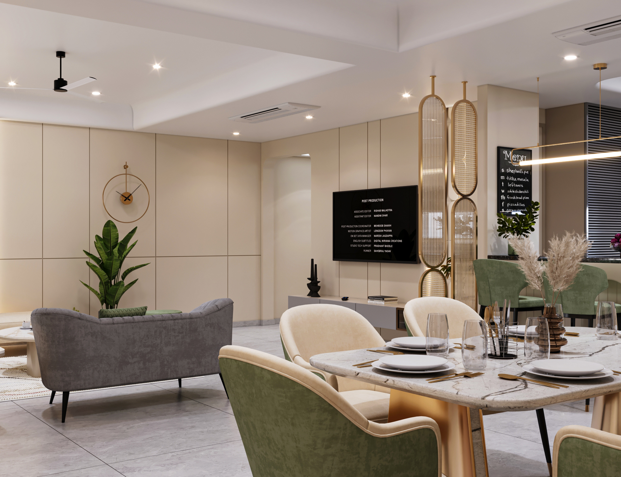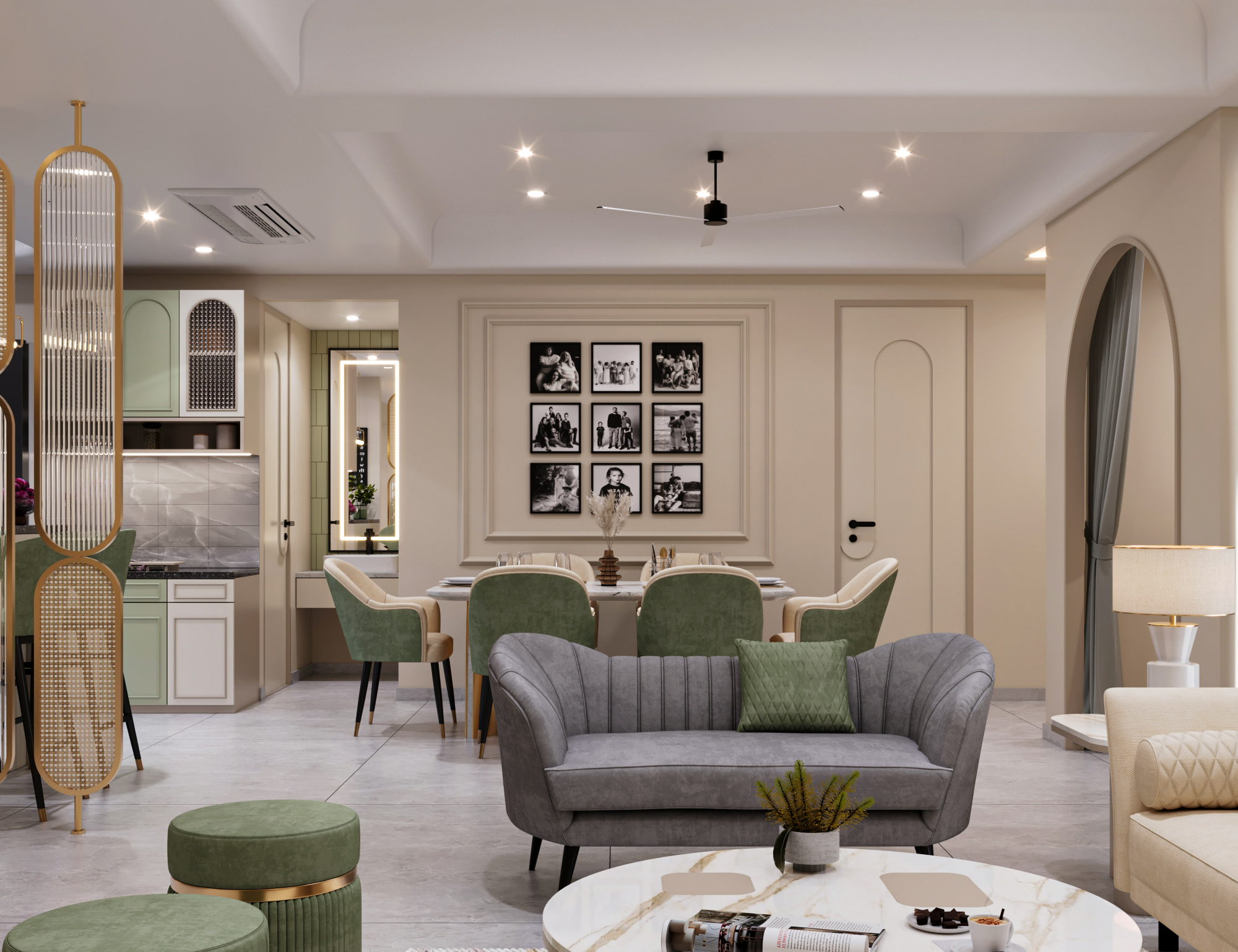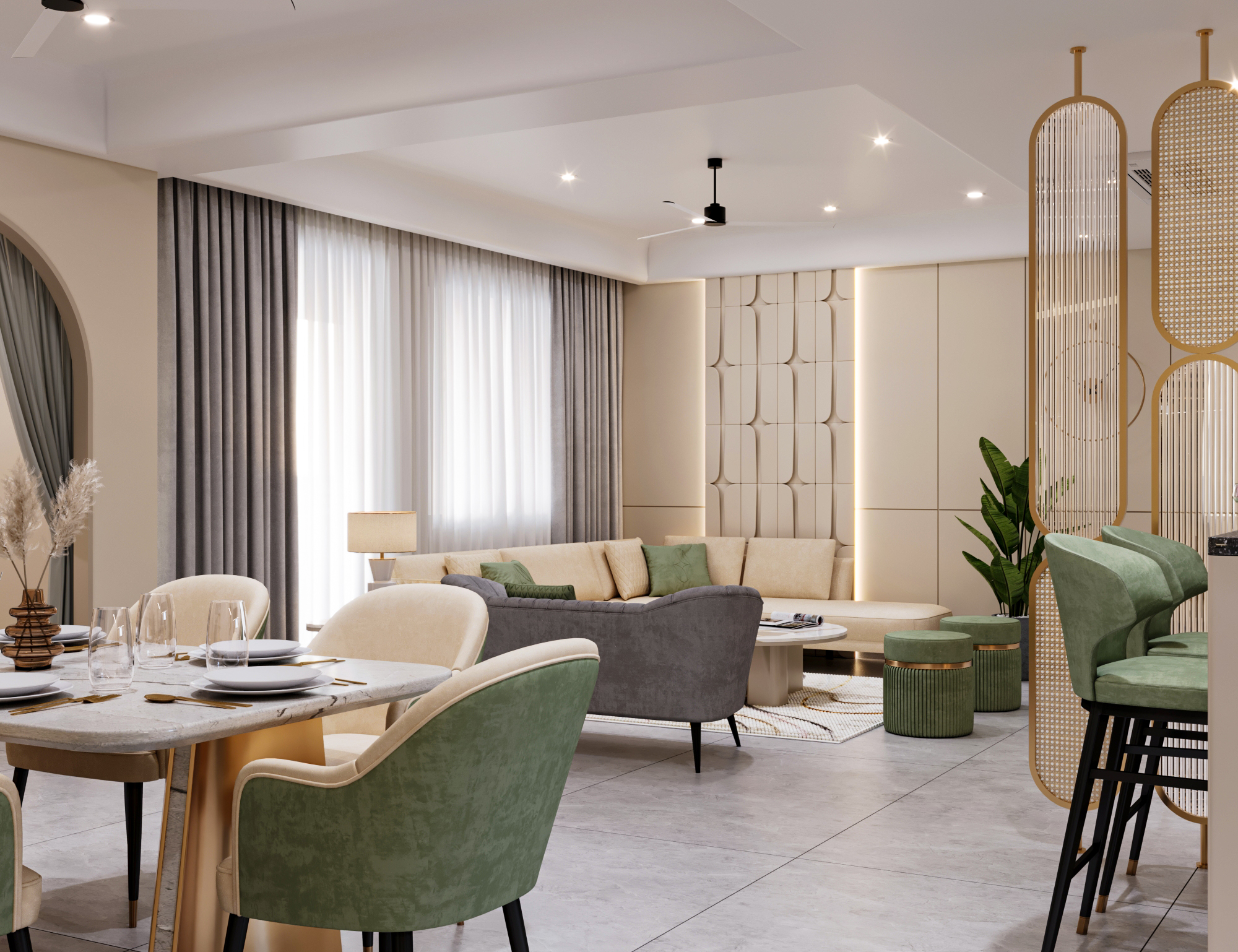 The design embraces a neutral beige palette, earthy tones, paired with muted greens and warm wood finishes, dominate the palette, enhancing harmony across spaces. Thoughtful lighting, contemporary furniture, and natural elements together craft a sophisticated yet inviting home environment.