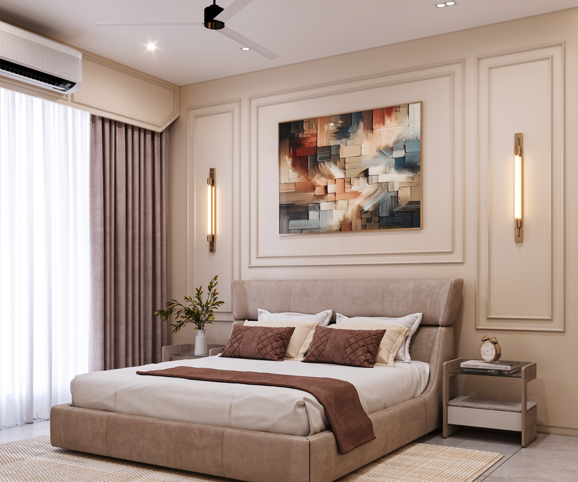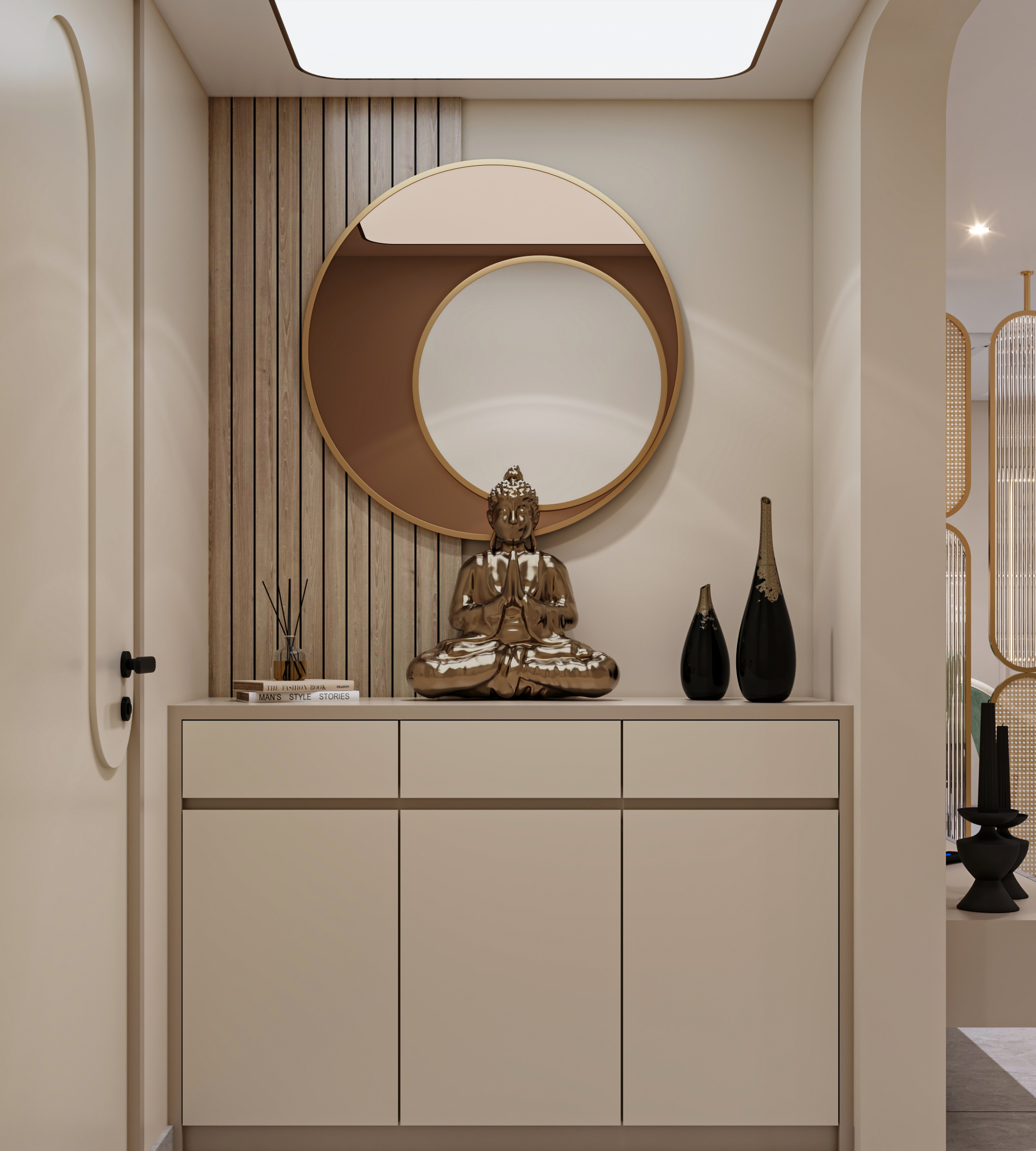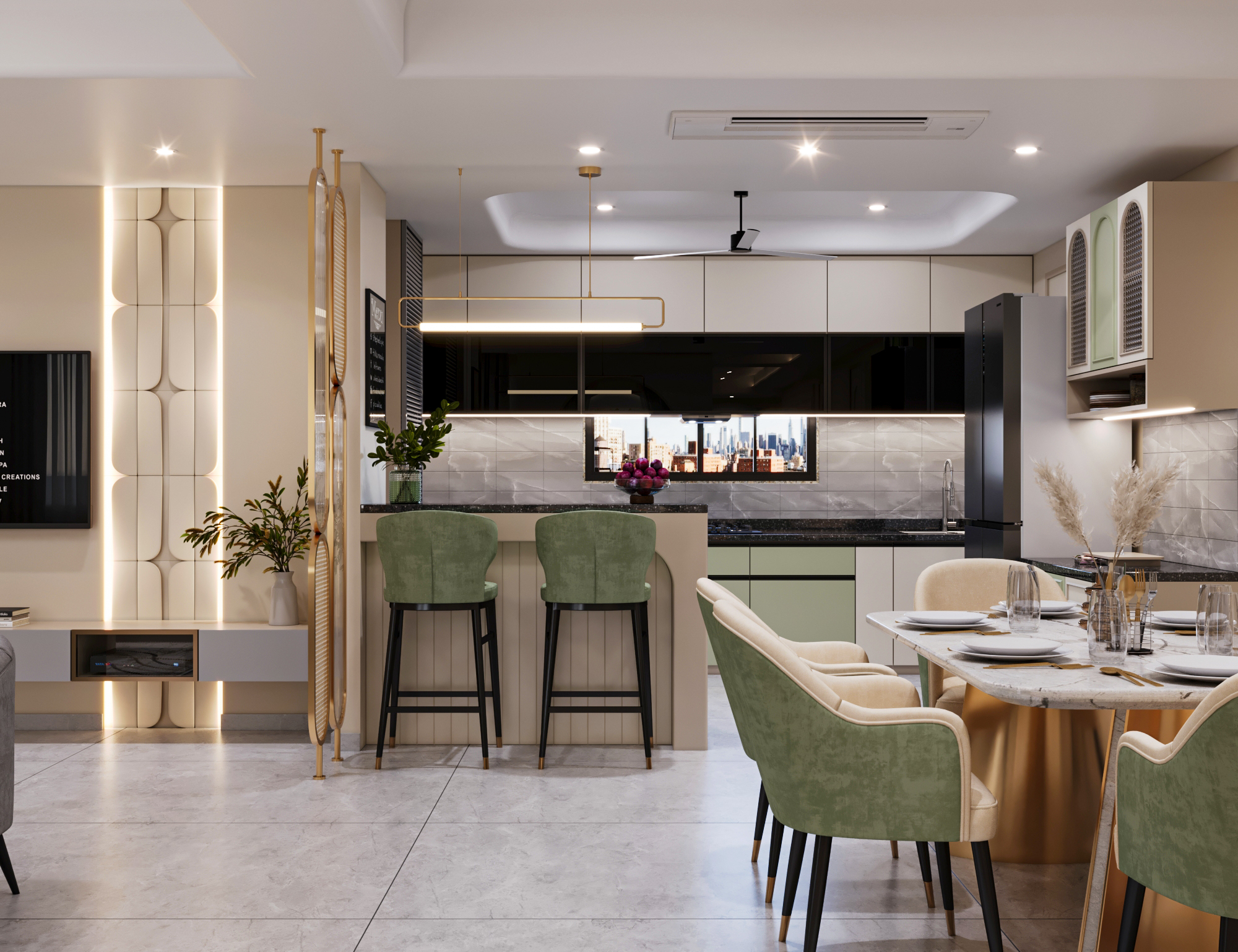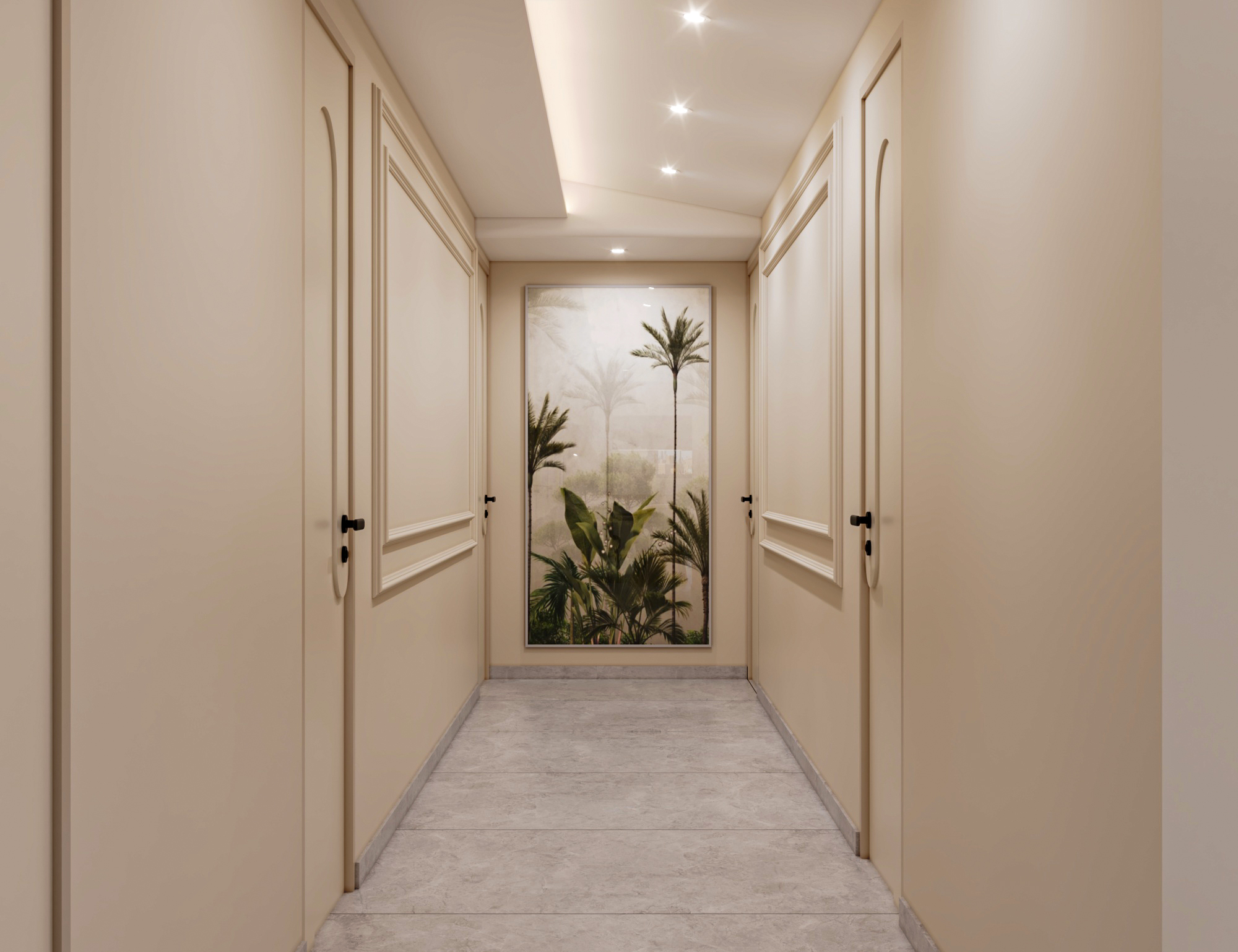 The design embraces a neutral beige palette, earthy tones, paired with muted greens and warm wood finishes, dominate the palette, enhancing harmony across spaces. Thoughtful lighting, contemporary furniture, and natural elements together craft a sophisticated yet inviting home environment.