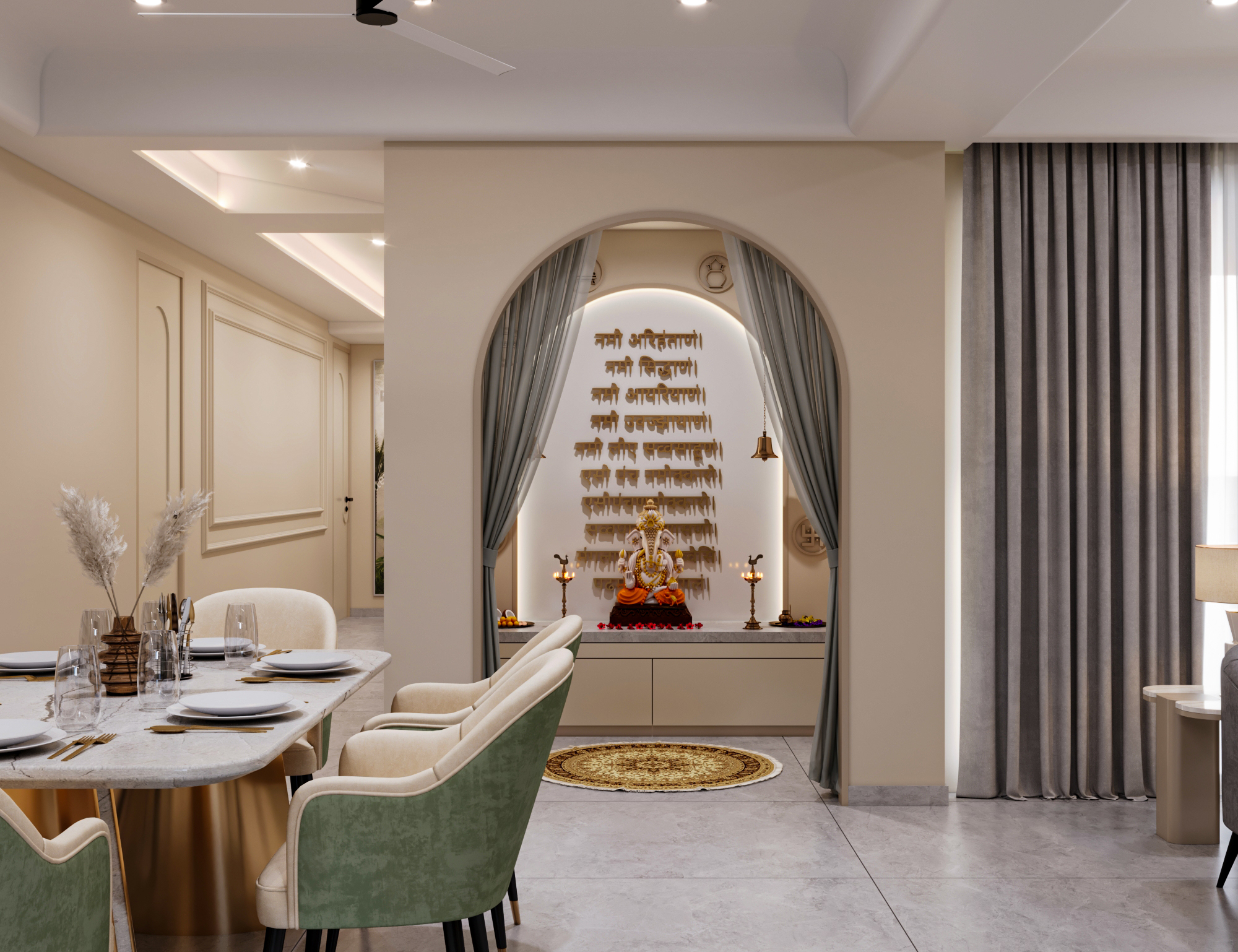 The layout features a spacious living room, dining, and kitchen designed in an open-plan style, creating seamless flow and connectivity. A serene pooja room adds a spiritual touch, while the master bedroom exudes luxury with soft neutrals and elegant textures. The mother’s and son’s rooms reflect comfort with subtle accents and practical layouts. A cozy guest room ensures hospitality, while the additional entertainment/yoga room offers space for relaxation and mindfulness.