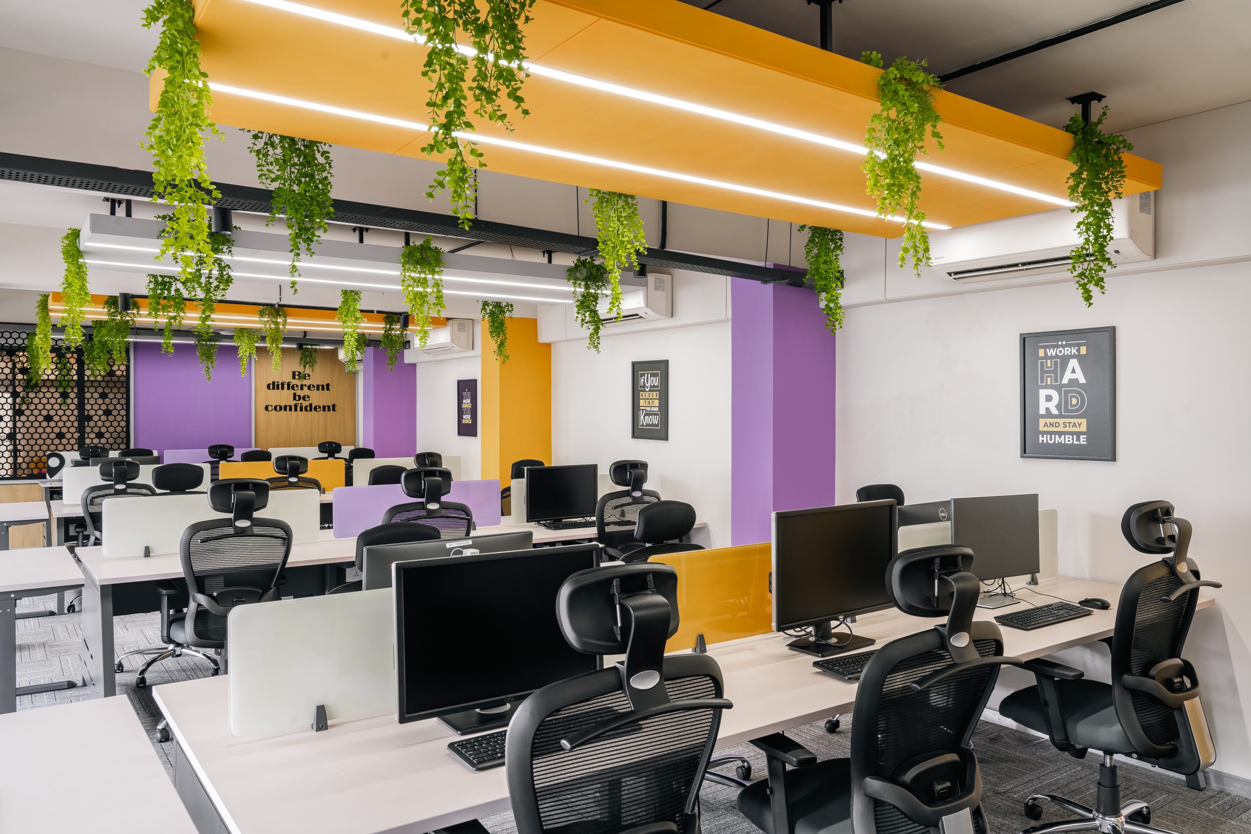 The color theme is inspired by the company’s logo, with yellow accents added to complement and energize the space. The layout features height-adjustable workstations to promote comfort and movement. The passage is smartly transformed into casual seating zones, offering employees diverse settings to relax or work based on their mood.