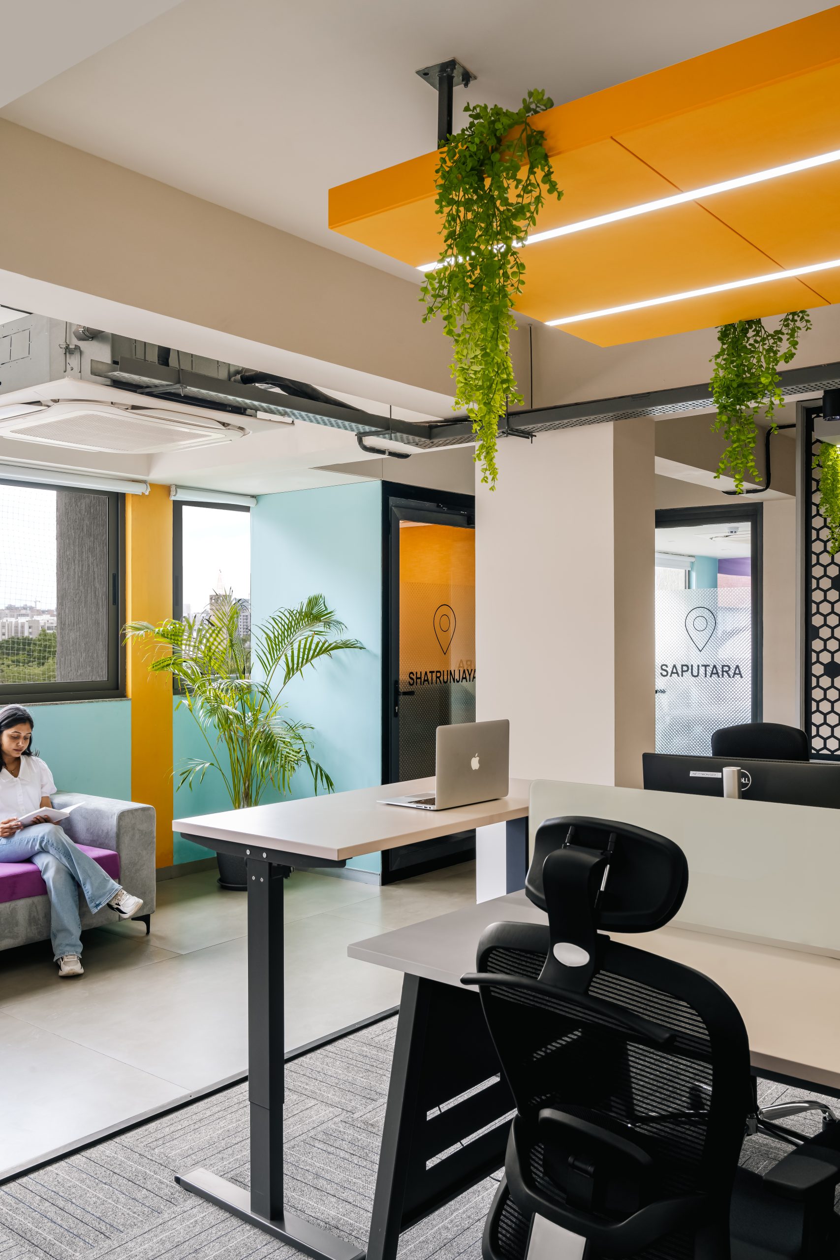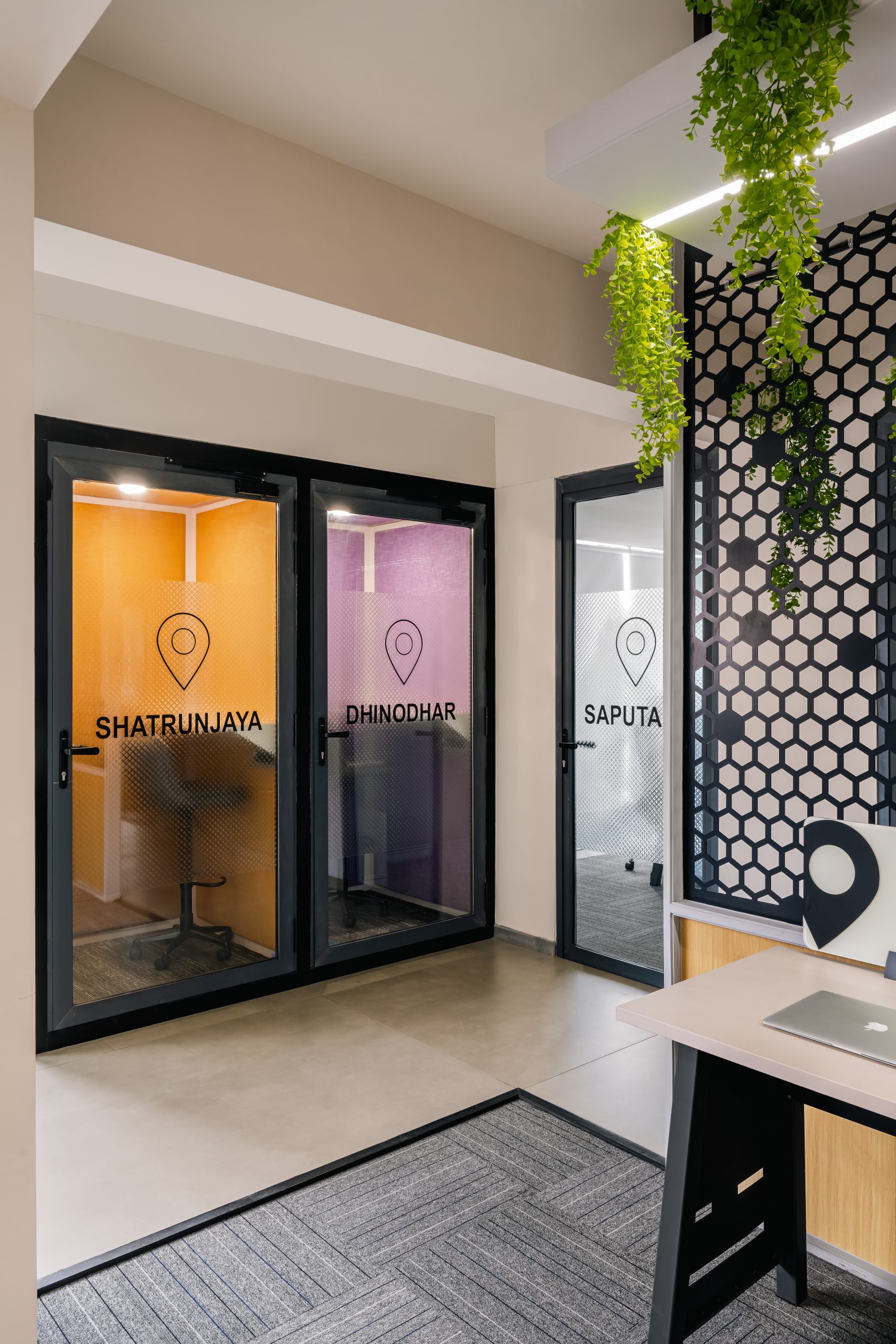 The office includes two soundproof call booths and two meeting rooms named Shatrunjaya, Dhinodhar, Saputara, and Girnar — inspired by Gujarat’s iconic peaks.