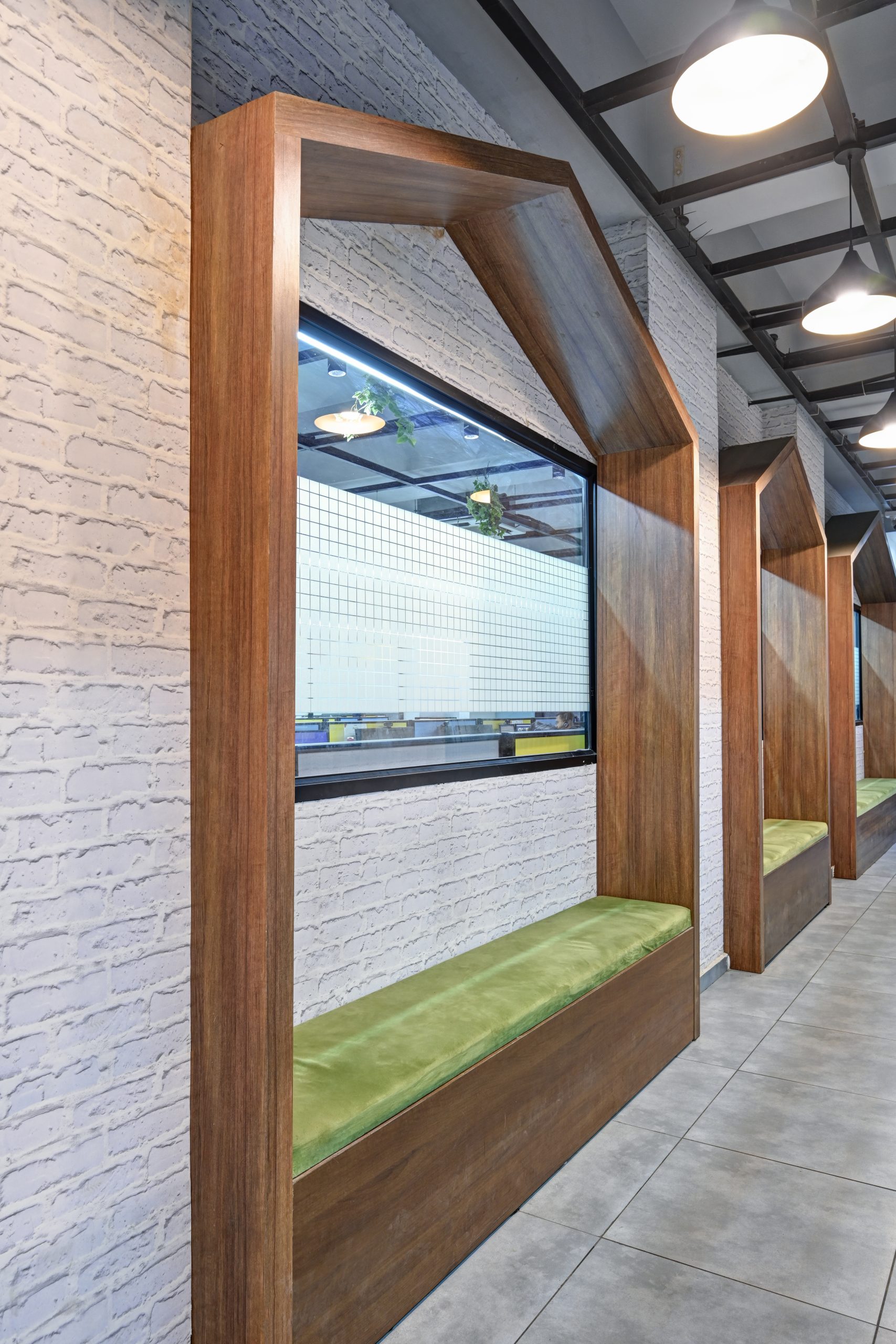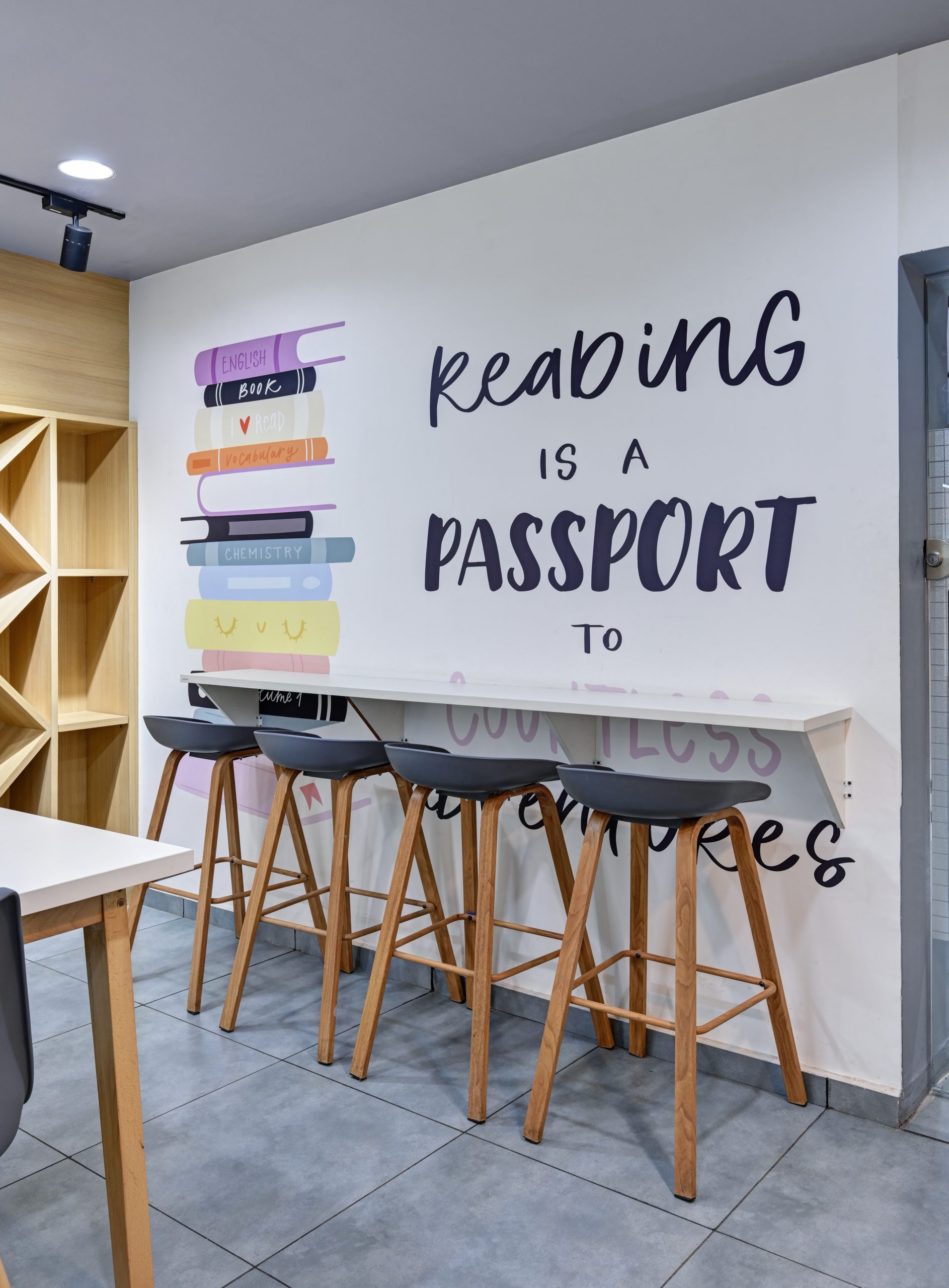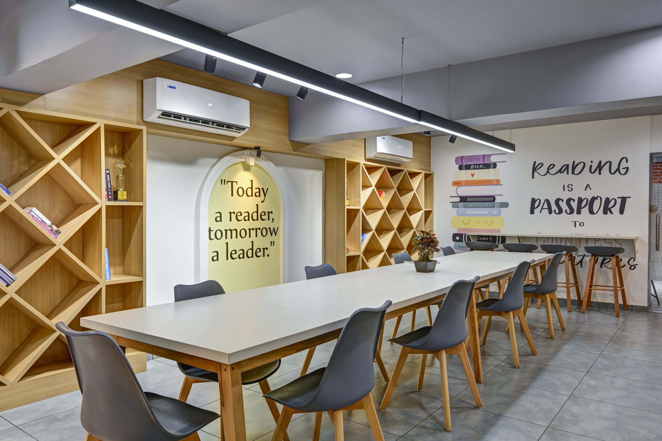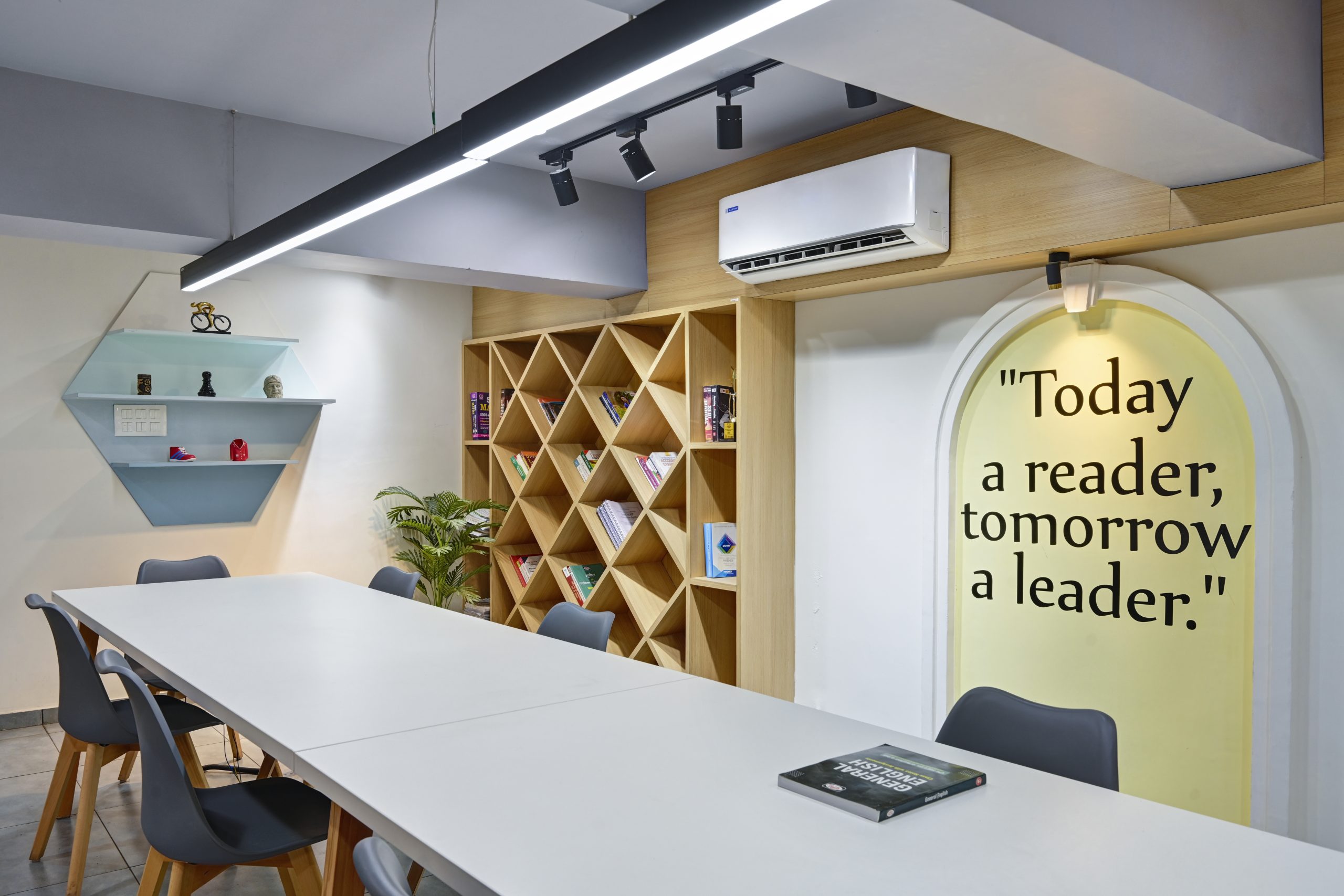 The reception area sets a professional tone with clean lines and geometric wall patterns that add a subtle designer touch while maintaining simplicity with a customised metal oval shape light. A lively breakout area provides a space for employees to relax and collaborate informally. The training room is well-equipped to support interactive learning, while the library offers a quiet, focused zone for reading and research. To reflect the brand’s innovative spirit, a dedicated studio room has been crafted with a striking brick wall backdrop for the logo, creating an authentic studio feel. Additionally, a concrete textured wall showcasing a photo collage enhances the overall vibe, making the office both dynamic and inspiring.
