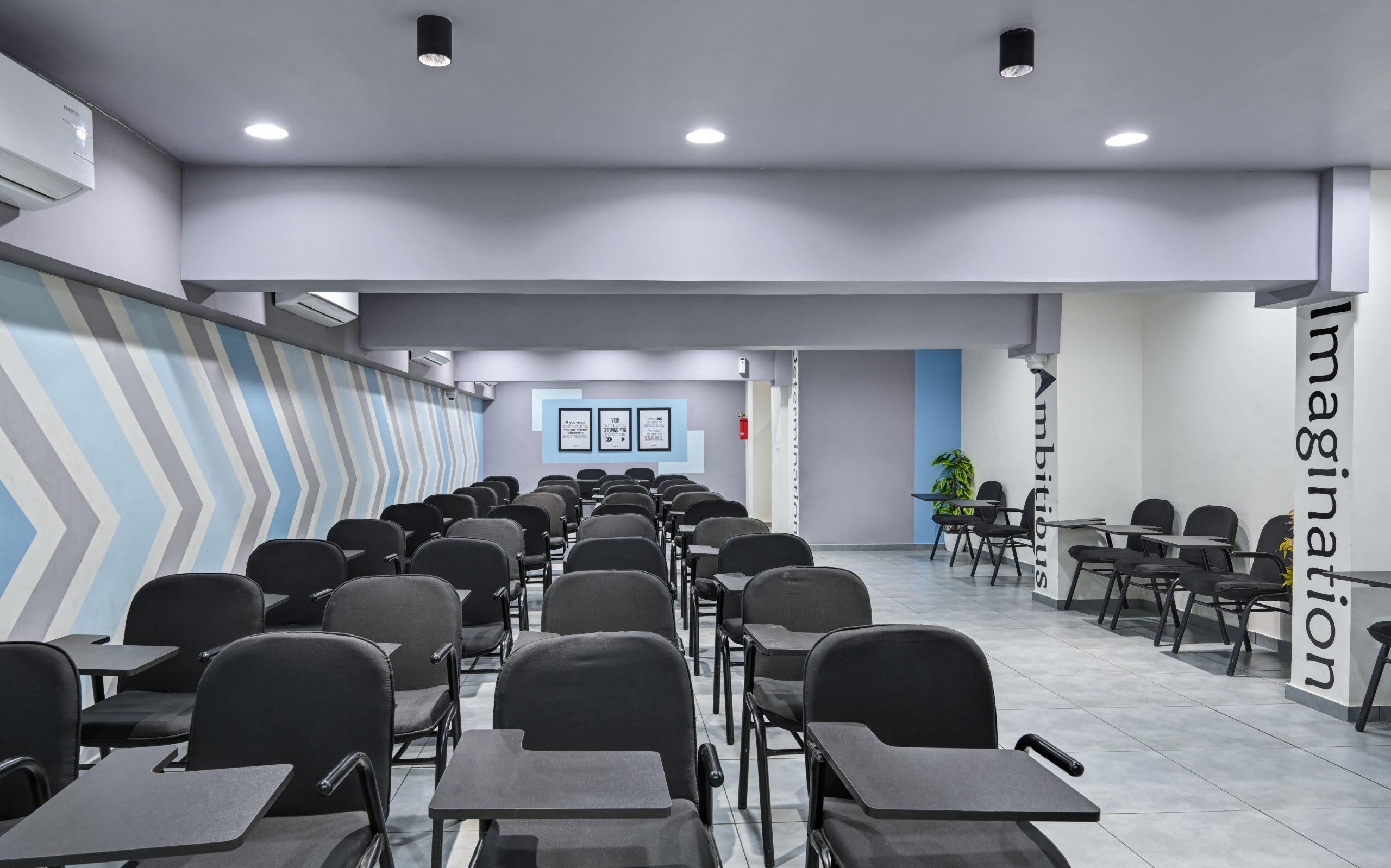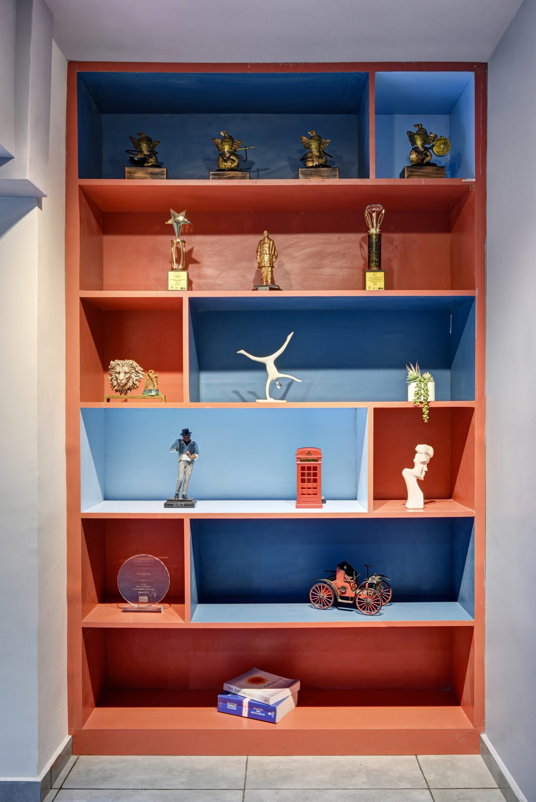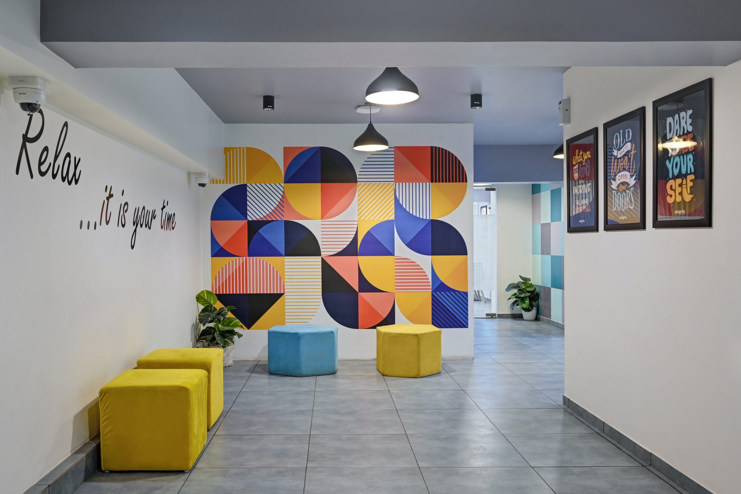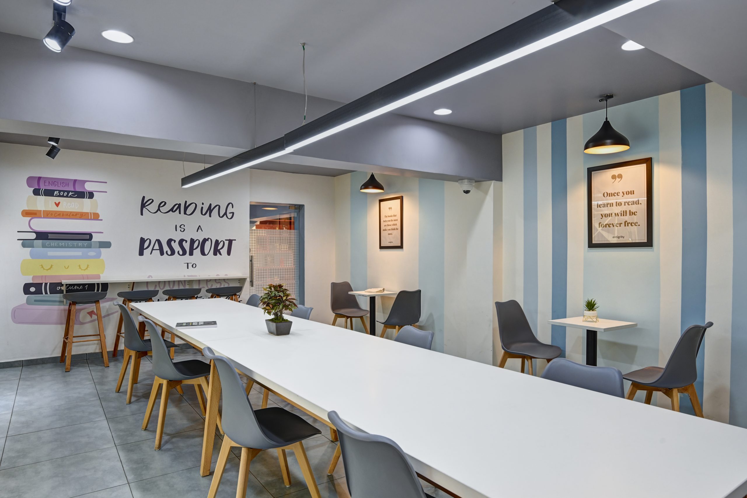 The reception area sets a professional tone with clean lines and geometric wall patterns that add a subtle designer touch while maintaining simplicity with a customised metal oval shape light. A lively breakout area provides a space for employees to relax and collaborate informally. The training room is well-equipped to support interactive learning, while the library offers a quiet, focused zone for reading and research. To reflect the brand’s innovative spirit, a dedicated studio room has been crafted with a striking brick wall backdrop for the logo, creating an authentic studio feel. Additionally, a concrete textured wall showcasing a photo collage enhances the overall vibe, making the office both dynamic and inspiring.