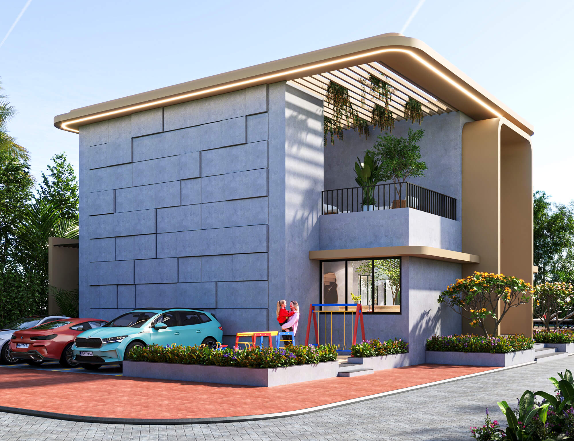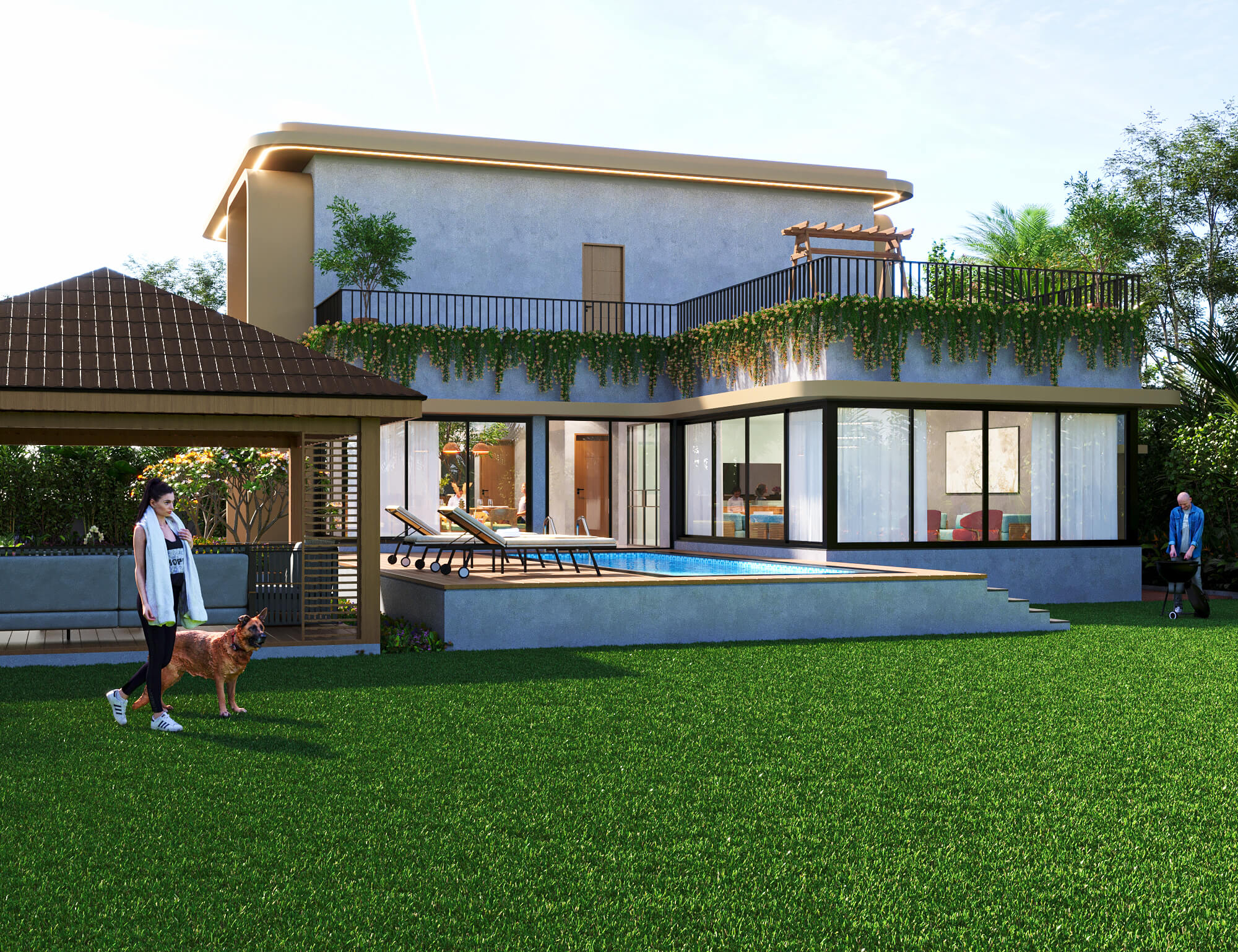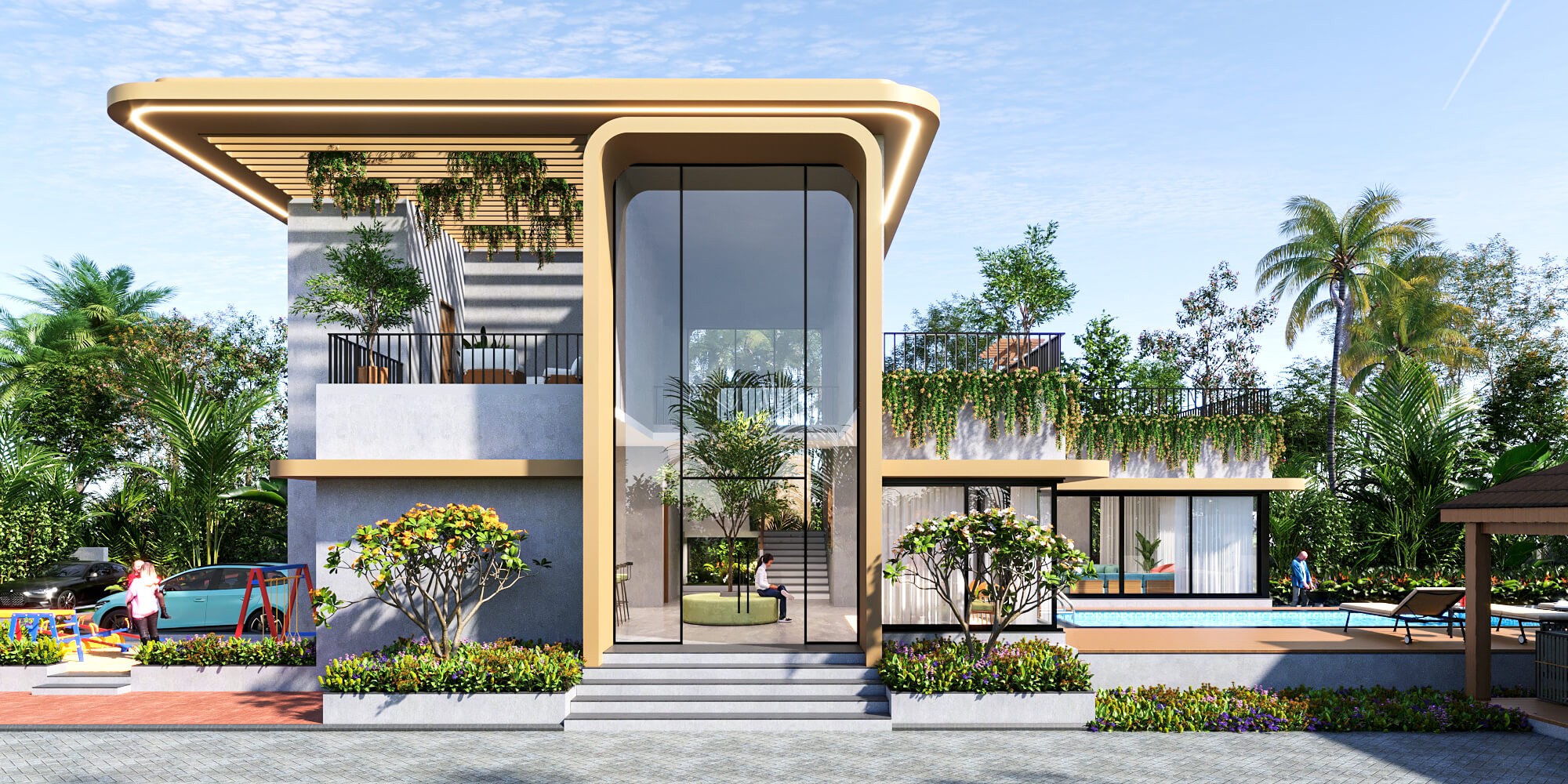 The double-height entrance with an indoor tree forms a striking centerpiece, complemented by wooden finishes and minimalist furniture. The dining and bar areas showcase clean lines with soft lighting, creating an inviting atmosphere for gatherings. A spacious living room with large glass windows, aqua-toned sofas, and statement lighting enhances comfort while connecting residents to the lush surroundings. The master bedroom reflects calm elegance with wooden tones and subtle décor accents. Externally, the structure features landscaped gardens, a swimming pool, and terrace greens that harmonize with nature. The bold yet simple façade, highlighted with modern lines and greenery cascading from balconies, enhances its contemporary charm. Altogether, this farmhouse is designed as a luxurious retreat balancing relaxation, functionality, and aesthetic beauty.