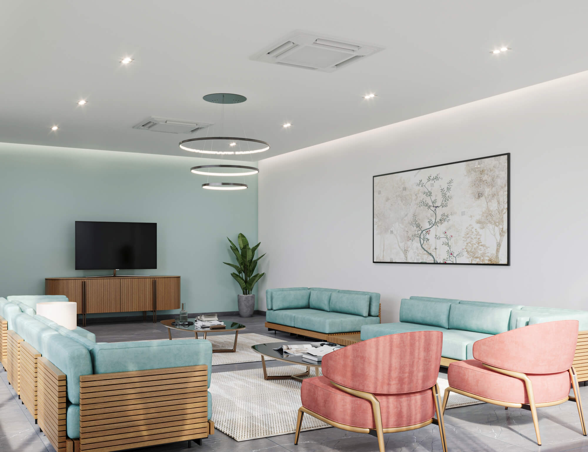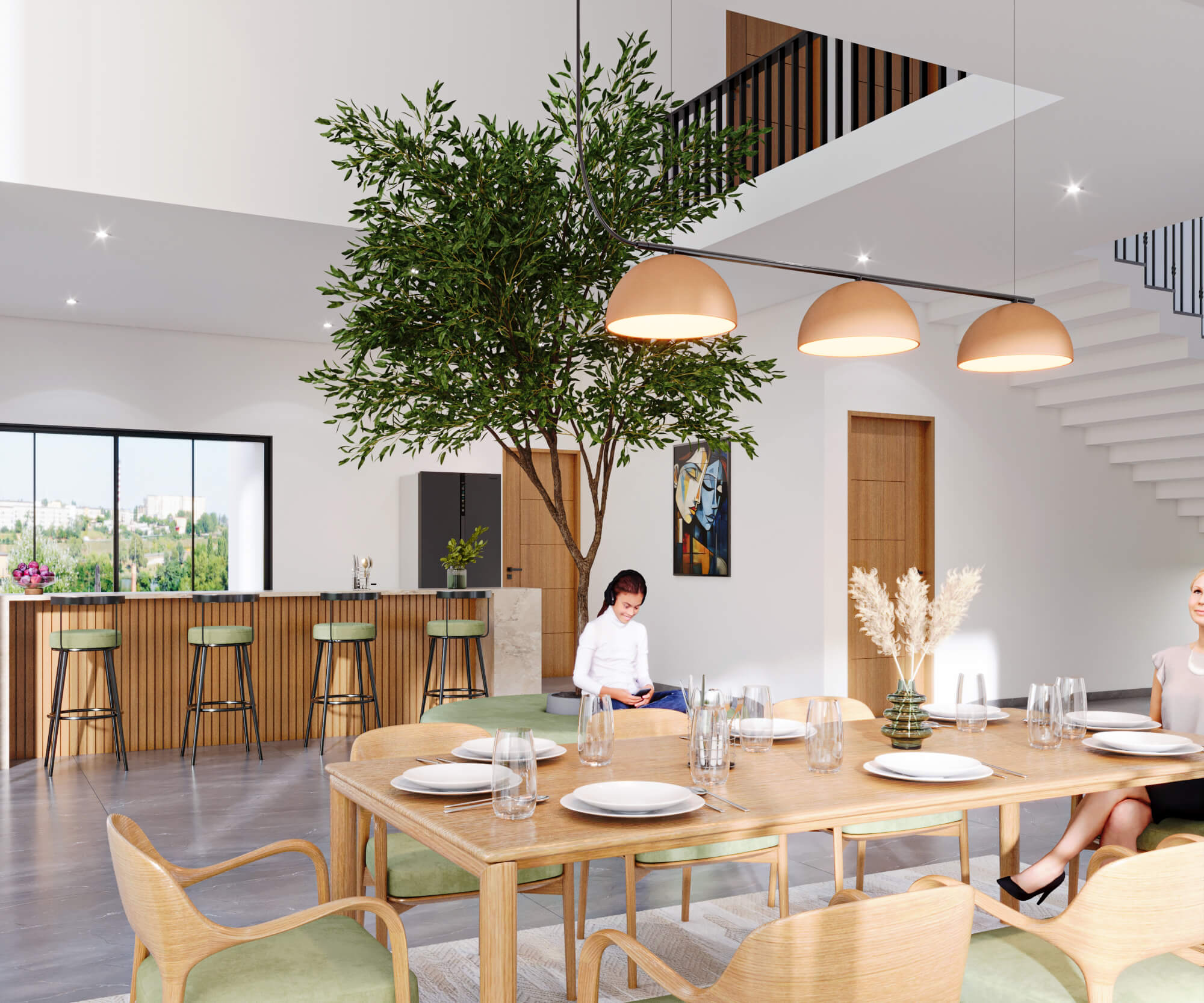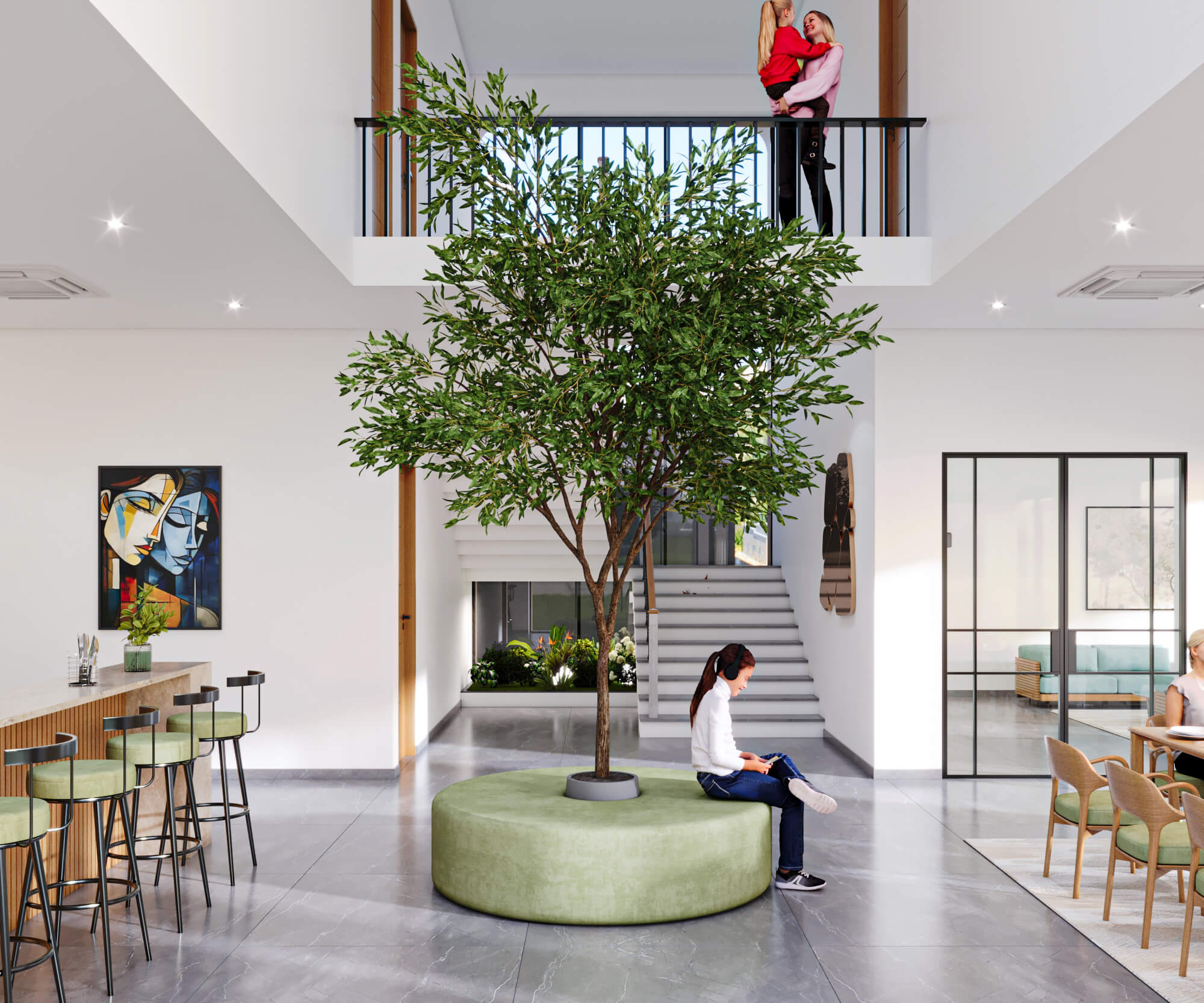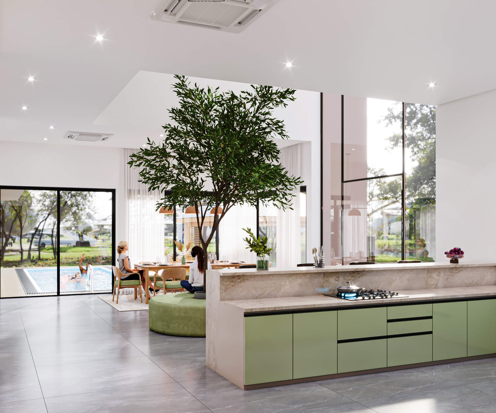 The double-height entrance with an indoor tree forms a striking centerpiece, complemented by wooden finishes and minimalist furniture. The dining and bar areas showcase clean lines with soft lighting, creating an inviting atmosphere for gatherings. A spacious living room with large glass windows, aqua-toned sofas, and statement lighting enhances comfort while connecting residents to the lush surroundings. The master bedroom reflects calm elegance with wooden tones and subtle décor accents. Externally, the structure features landscaped gardens, a swimming pool, and terrace greens that harmonize with nature. The bold yet simple façade, highlighted with modern lines and greenery cascading from balconies, enhances its contemporary charm. Altogether, this farmhouse is designed as a luxurious retreat balancing relaxation, functionality, and aesthetic beauty.