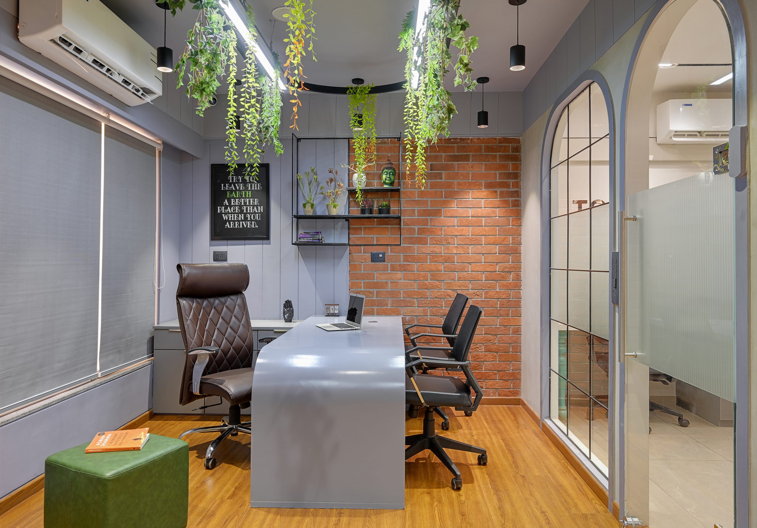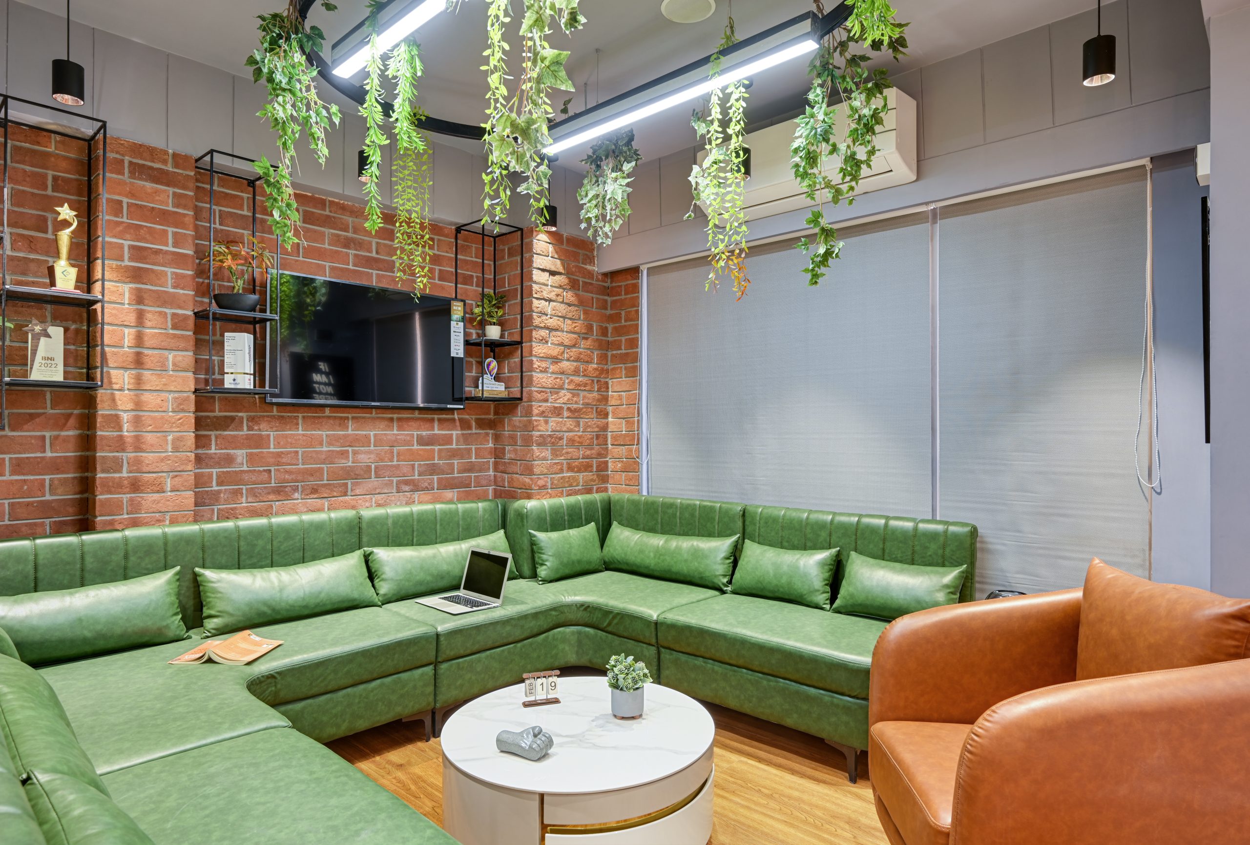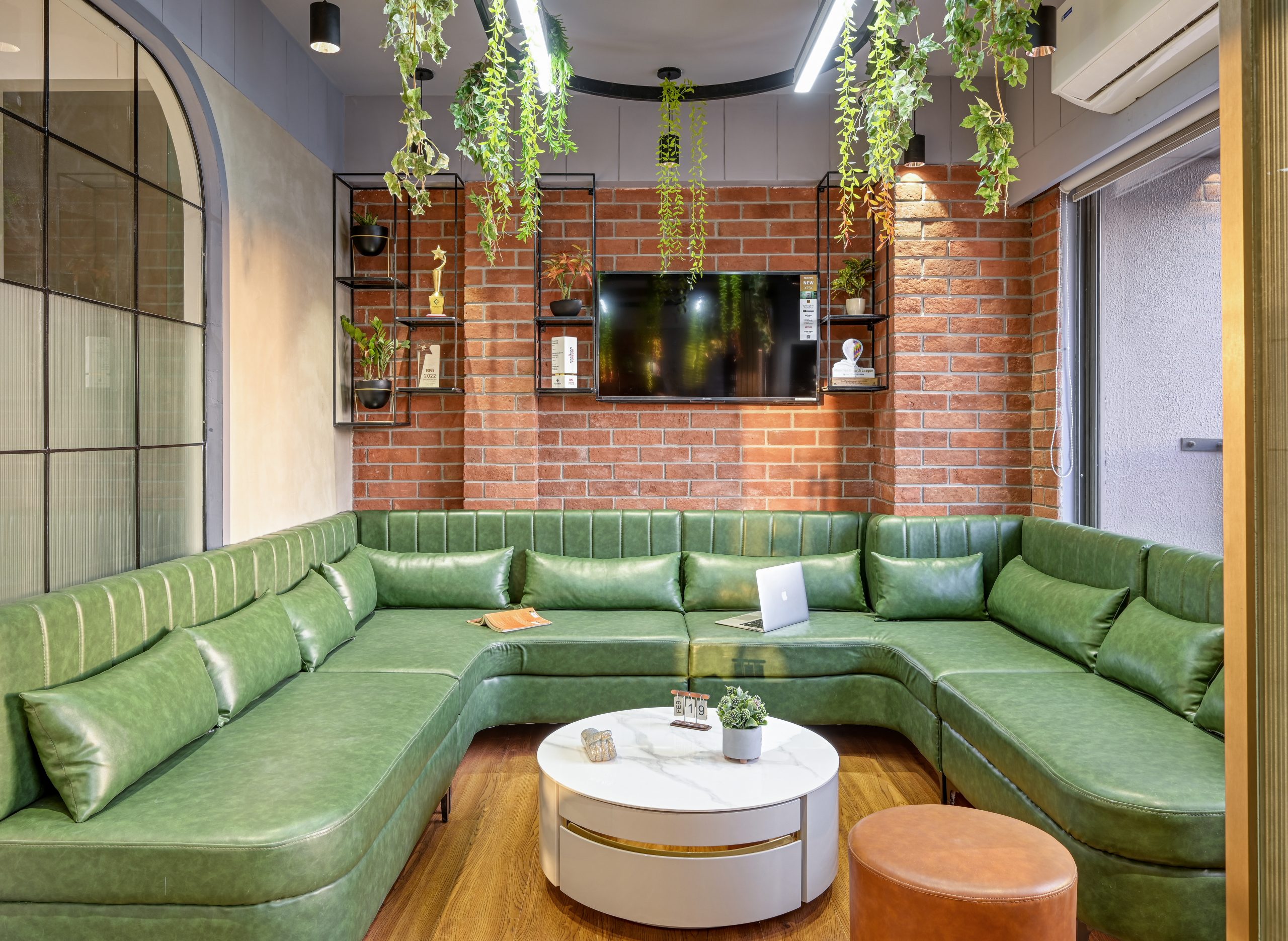 To balance the styles, classic materials such as leather, wood, and brick are paired with modern finishes like polished surfaces, glass partitions, and clean lines. The lush greenery, cascading from ceiling planters, introduces a biophilic element that bridges both eras, adding a natural, refreshing atmosphere to the space.