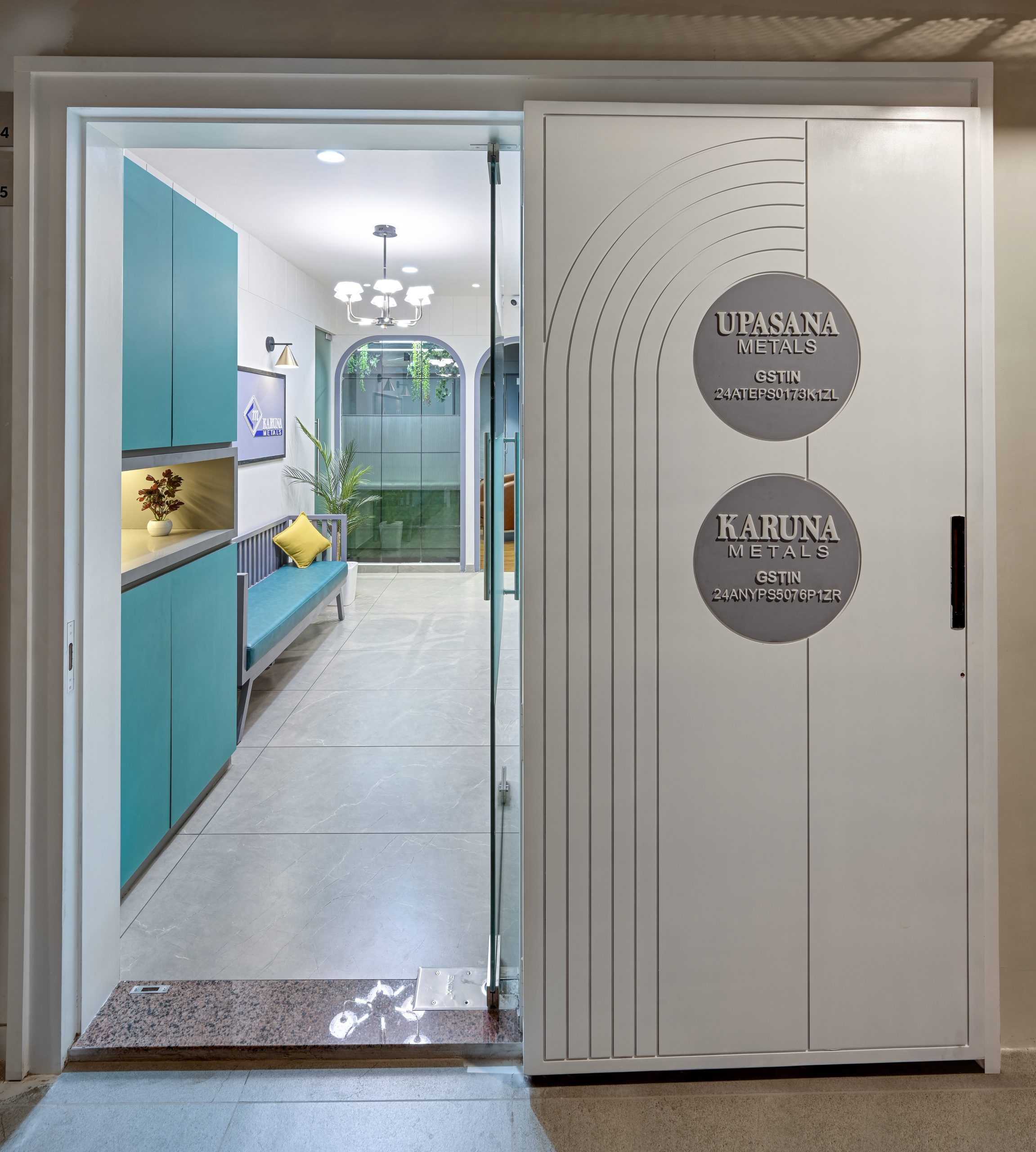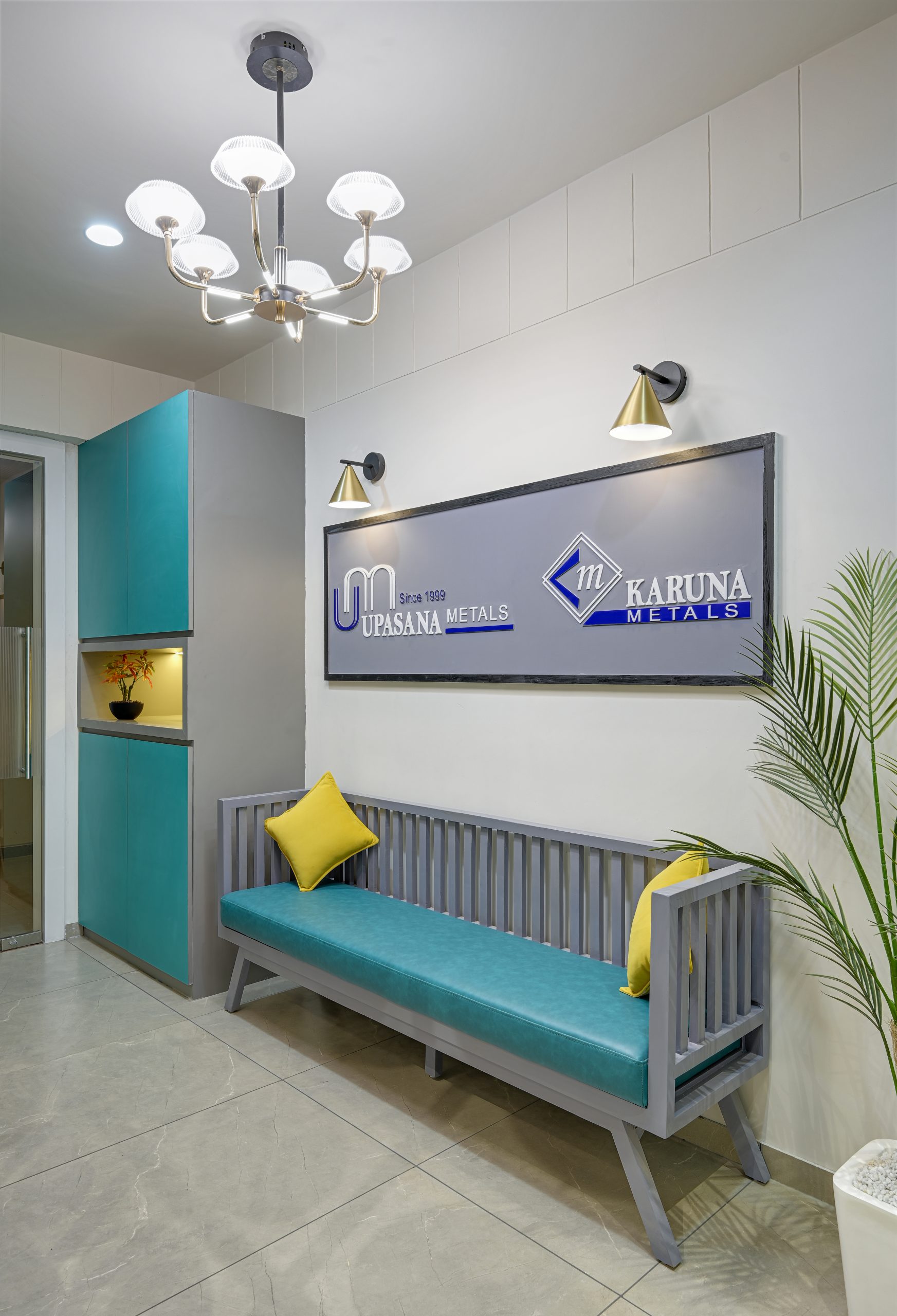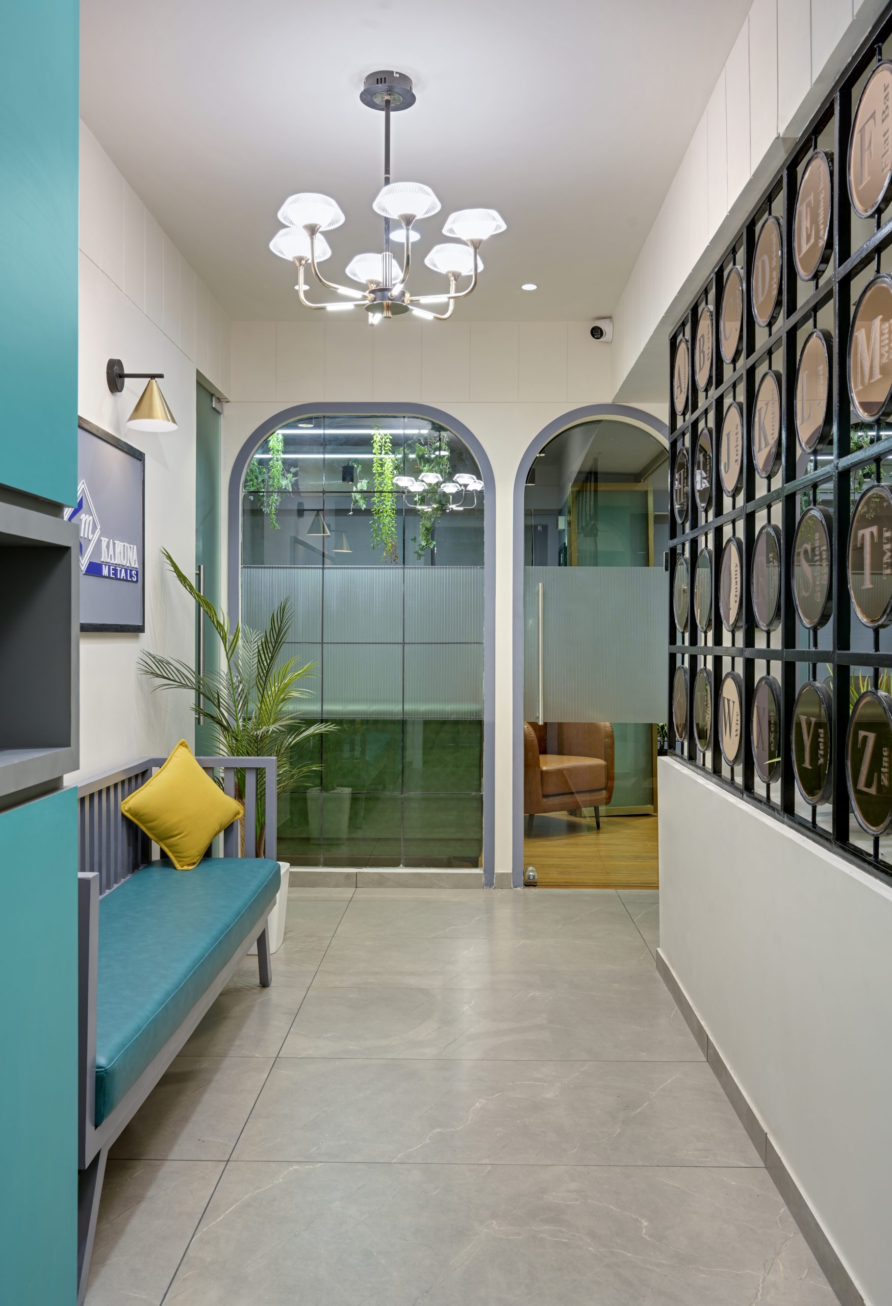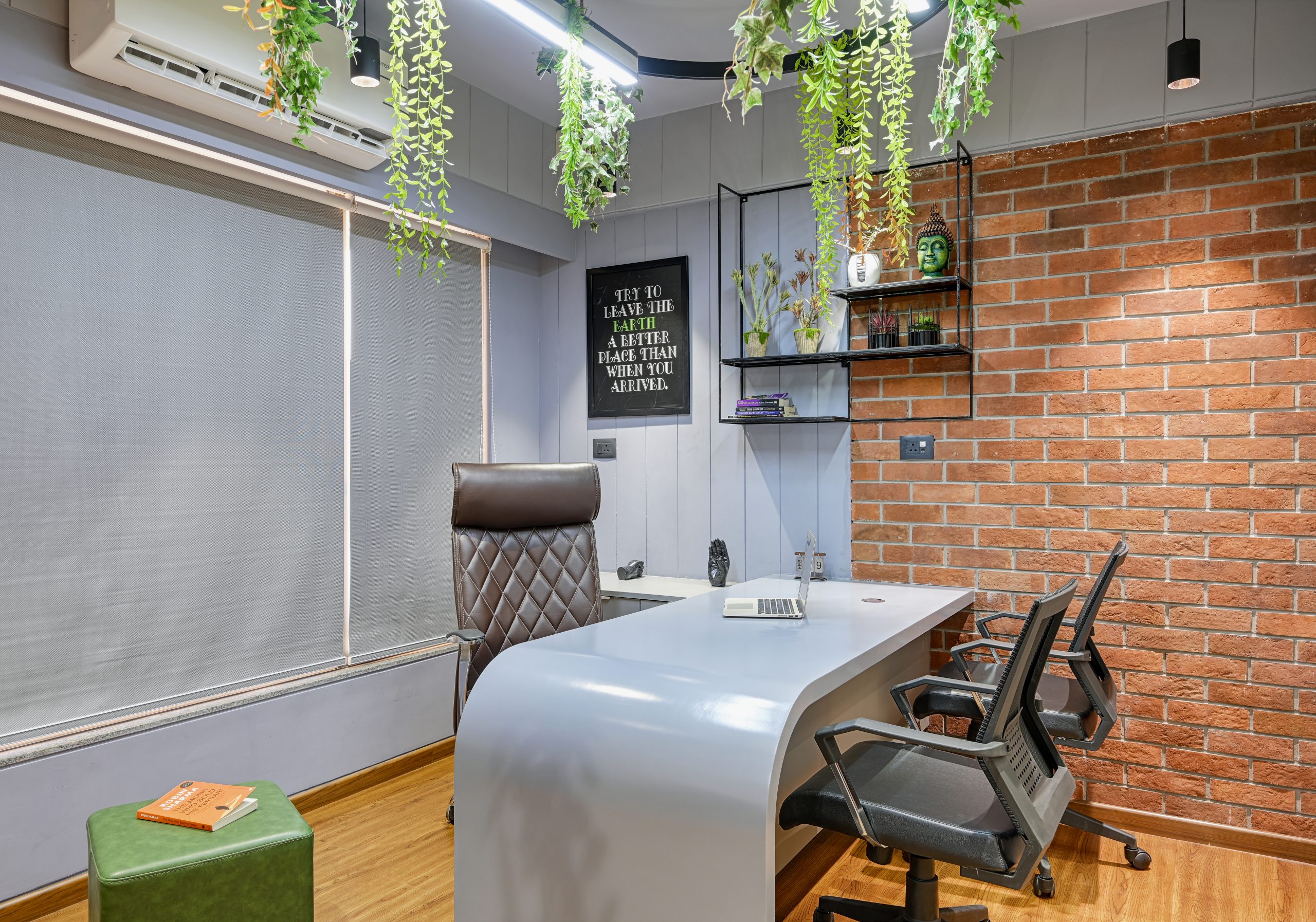 To balance the styles, classic materials such as leather, wood, and brick are paired with modern finishes like polished surfaces, glass partitions, and clean lines. The lush greenery, cascading from ceiling planters, introduces a biophilic element that bridges both eras, adding a natural, refreshing atmosphere to the space.