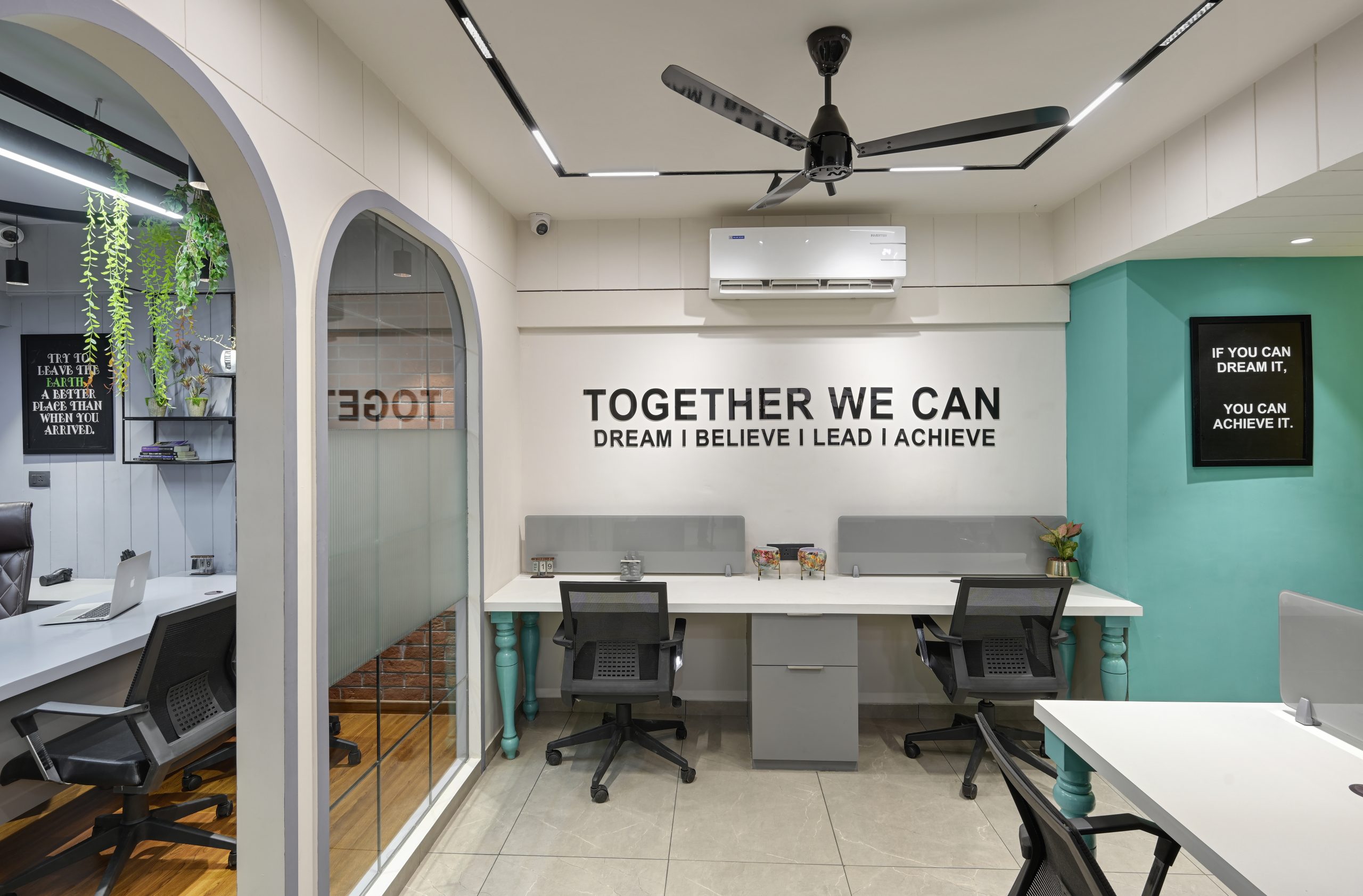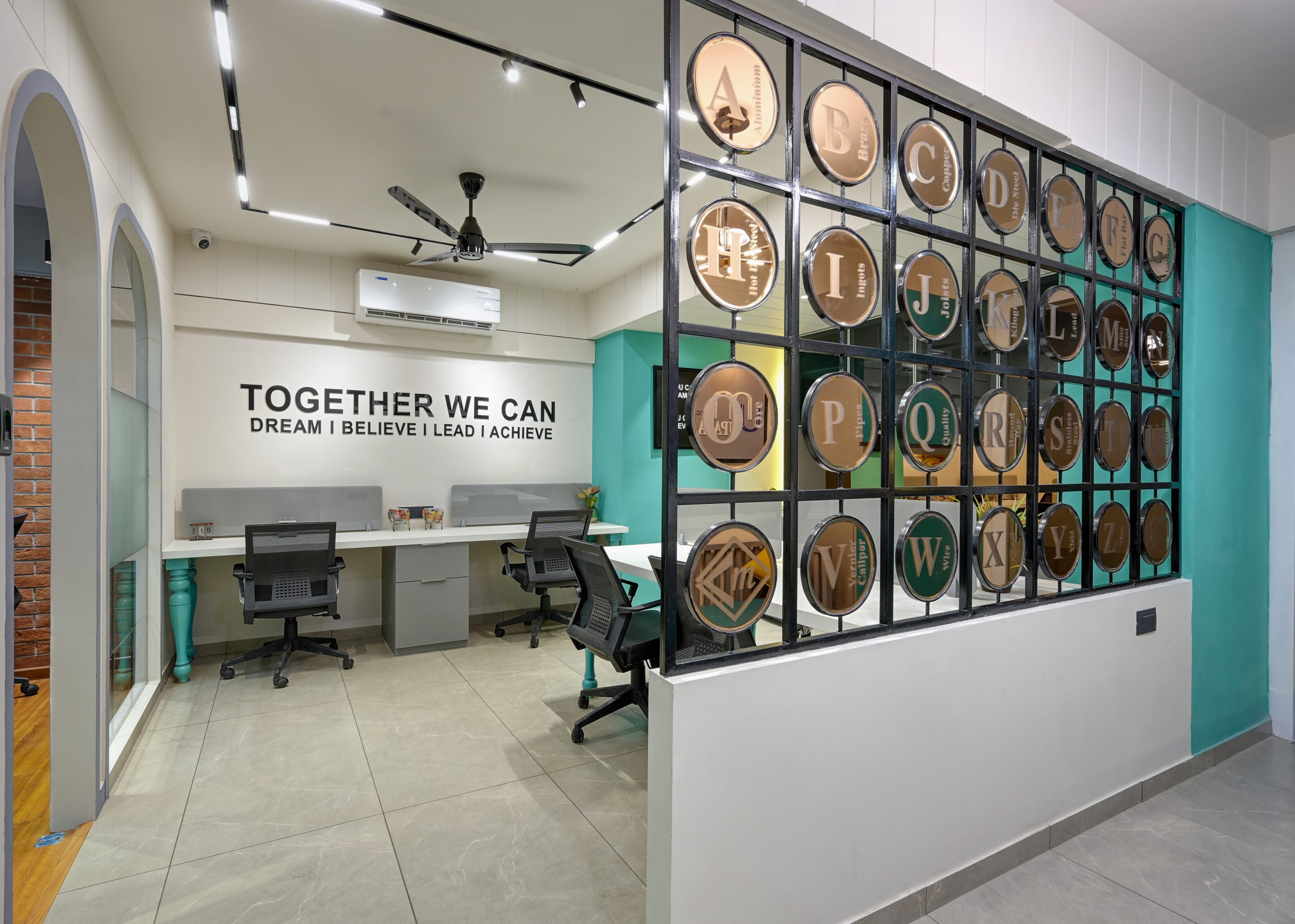 This office interior concept harmoniously blends traditional charm with modern sophistication, creating a space that is both timeless and functional. The design features exposed brick walls, which bring a rustic, traditional appeal, while contemporary furniture like the sleek curved desk, ergonomic chairs, and modular seating infuse modernity and comfort.
