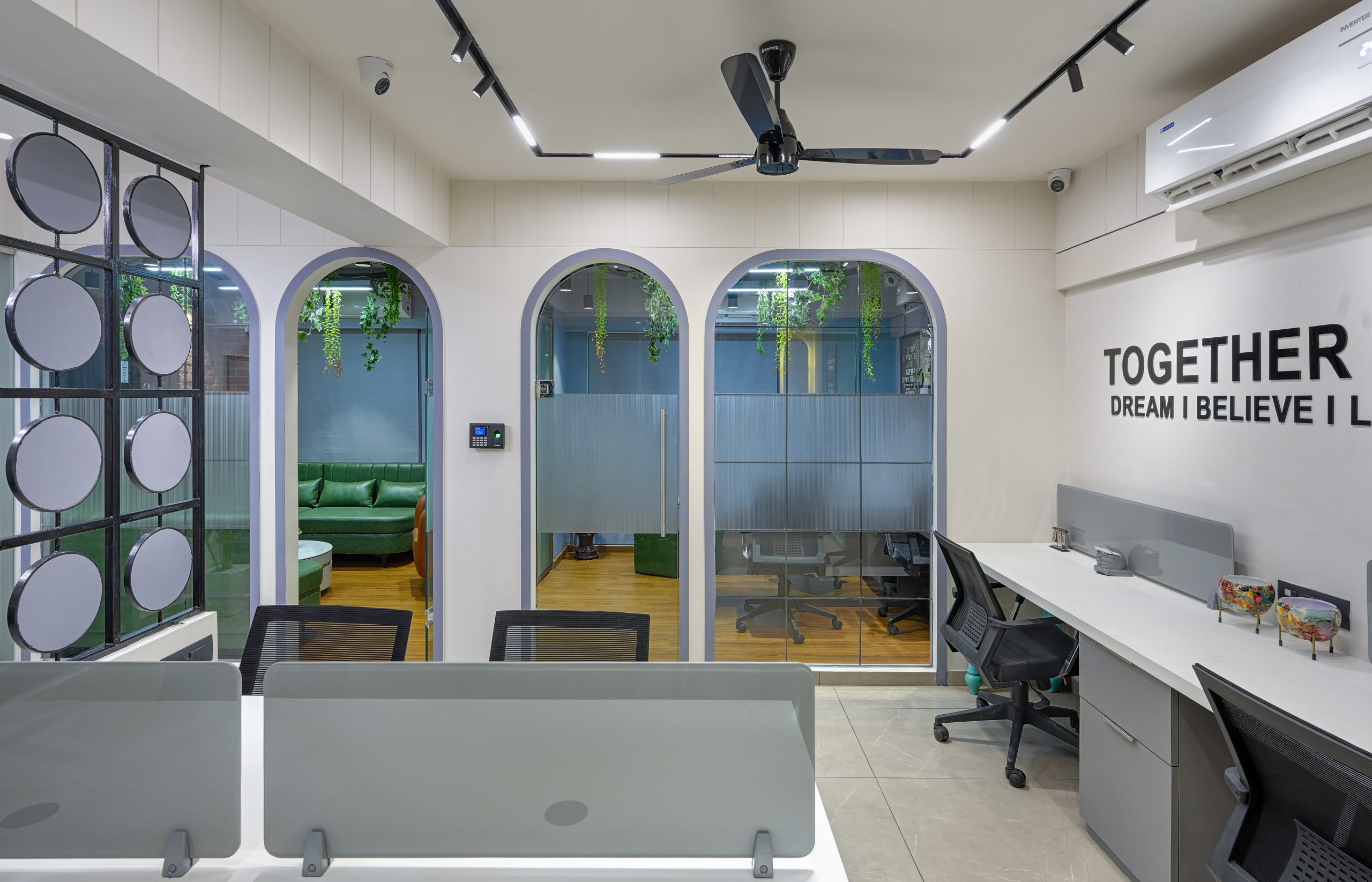 Traditional touches like arched doorways and decorative wall shelving are thoughtfully combined with modern elements such as recessed lighting and minimalistic decor. The large green C-shaped sofa, reminiscent of vintage lounges, coexists beautifully with sleek, contemporary meeting furniture, encouraging collaboration while offering a nod to heritage.