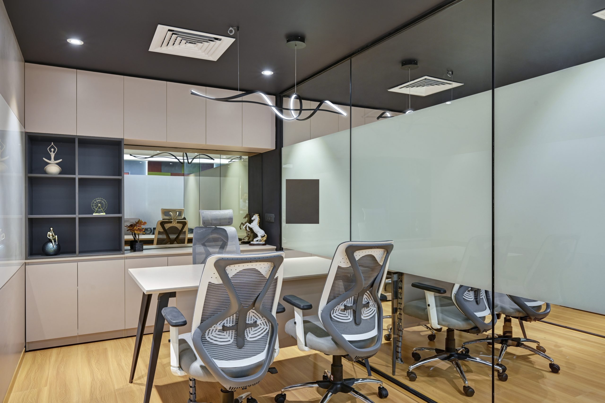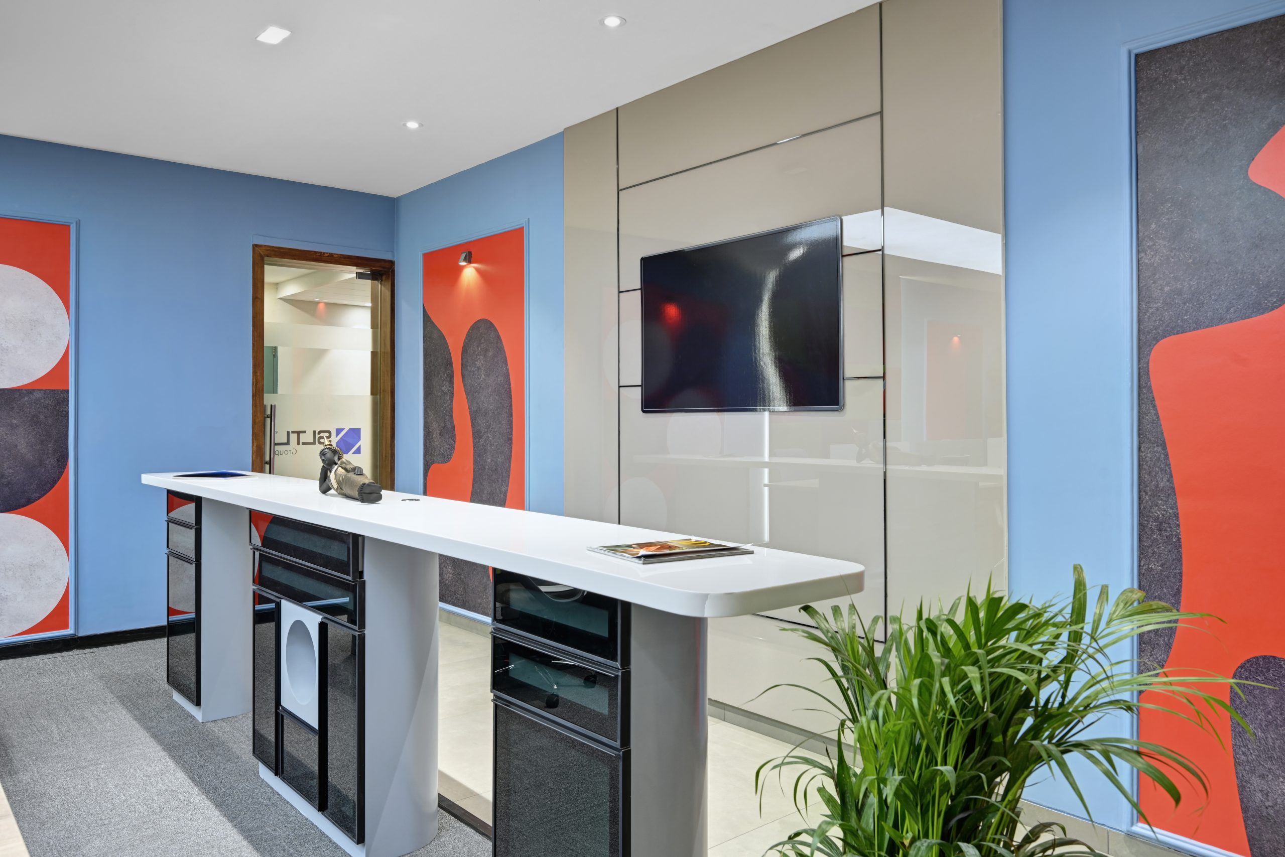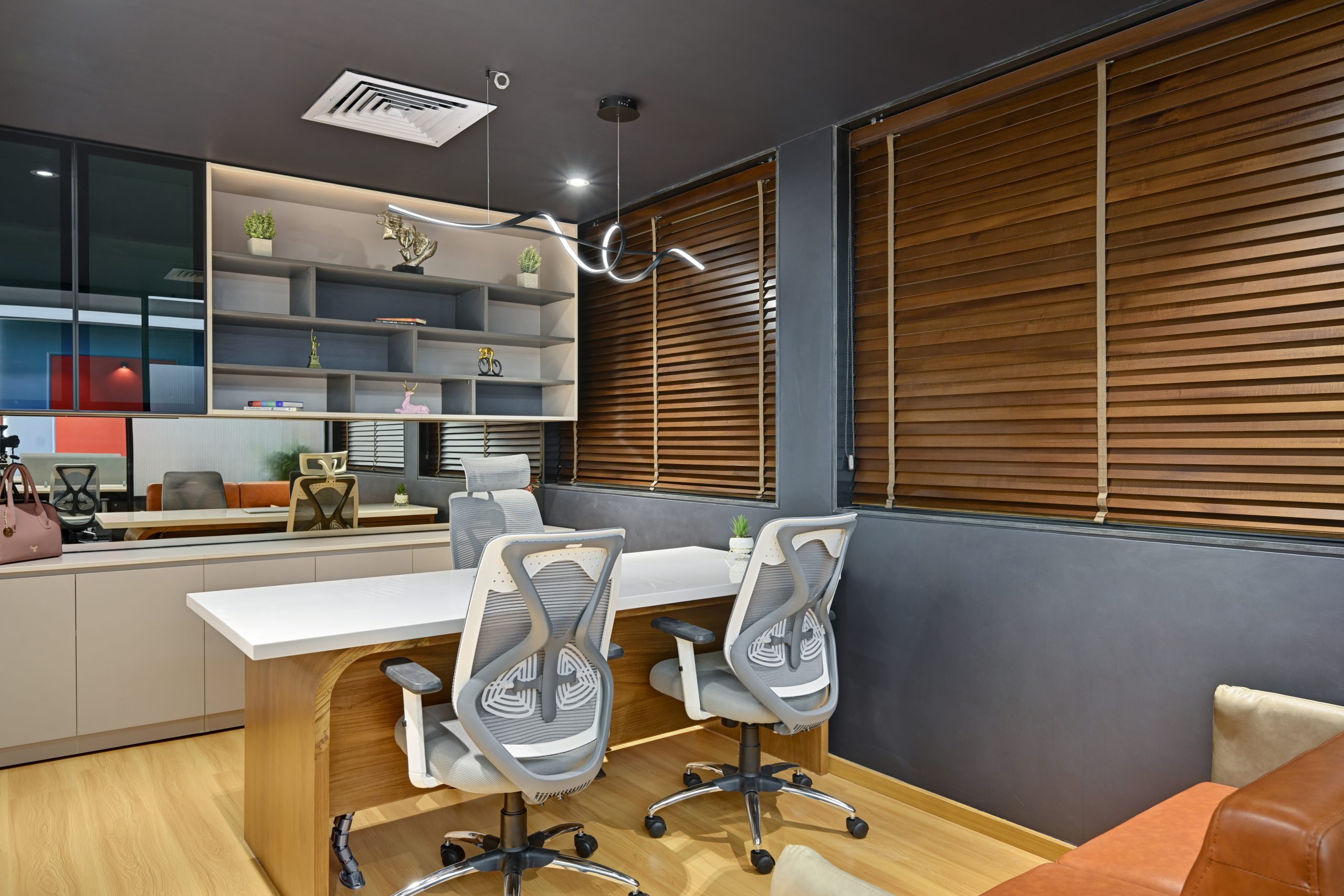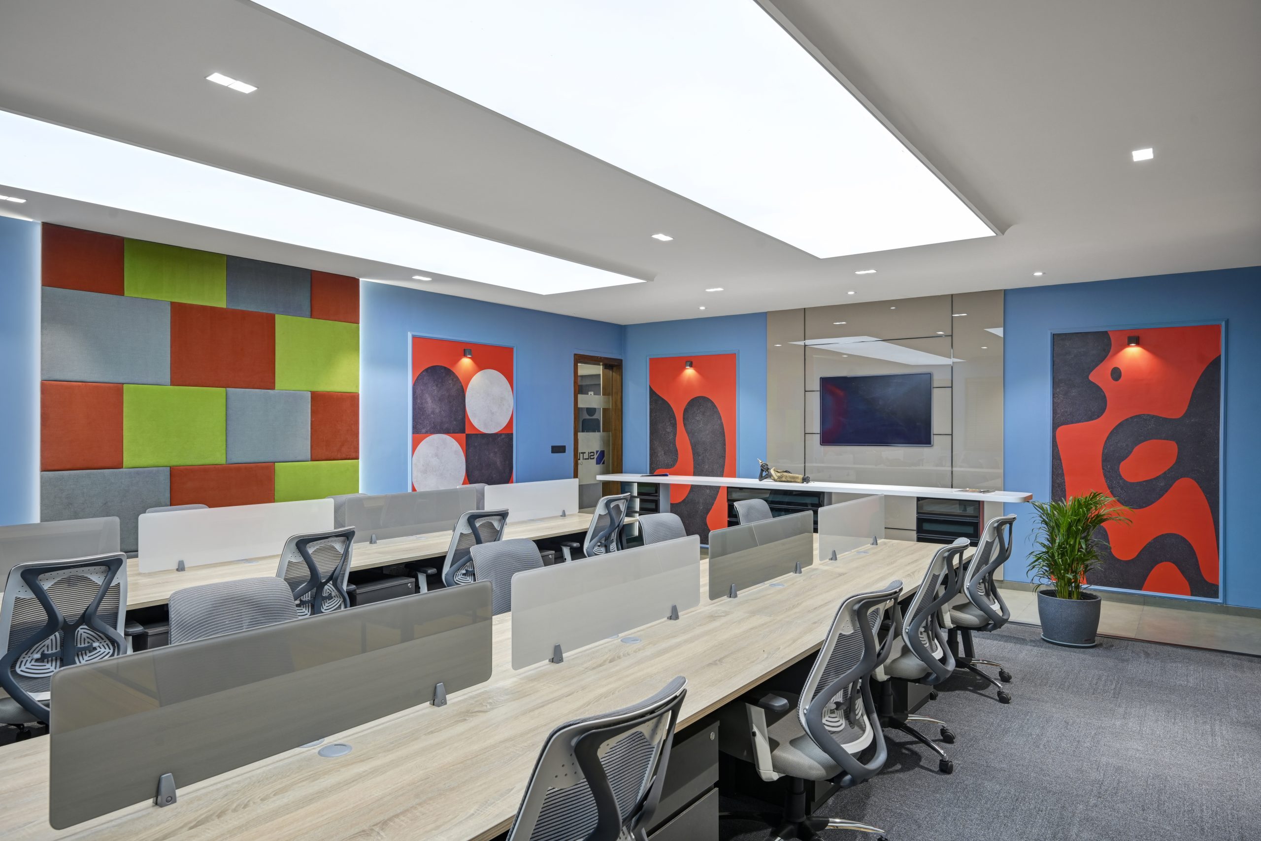 The space accommodates 20 efficient workstations and includes two small cabins, a director’s area, and a high discussion table in the passage—strategically placed to encourage collaboration while minimizing disruption to work zones. Walls are clad in multicolor soft boards with backlit, offering sound insulation and visual interest, paired with abstract wallpapers framed in moldings. A TV panel featuring back-painted glass serves dual purposes—presentation display and writable surface during meetings. The ceiling incorporates a fabric stretch system, ensuring uniform lighting and a clean, seamless look. The director’s cabin is elevated with wooden flooring and a custom wooden desk topped in Corian. A full-height storage unit with open shelves backed by bronze mirror adds both functionality and a sense of depth. Wooden blinds complement the luxurious palette, tying the design together with a refined and elegant touch.