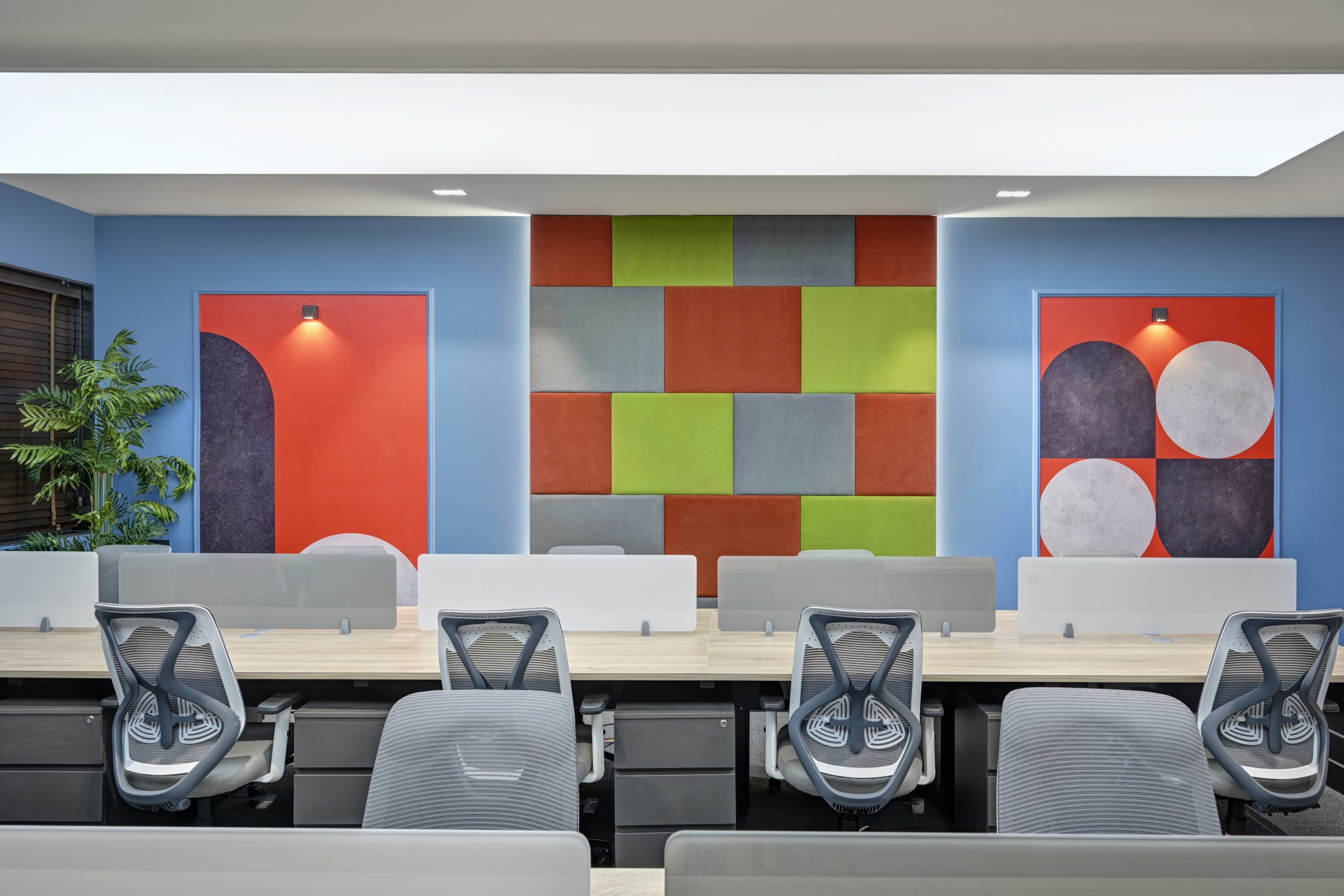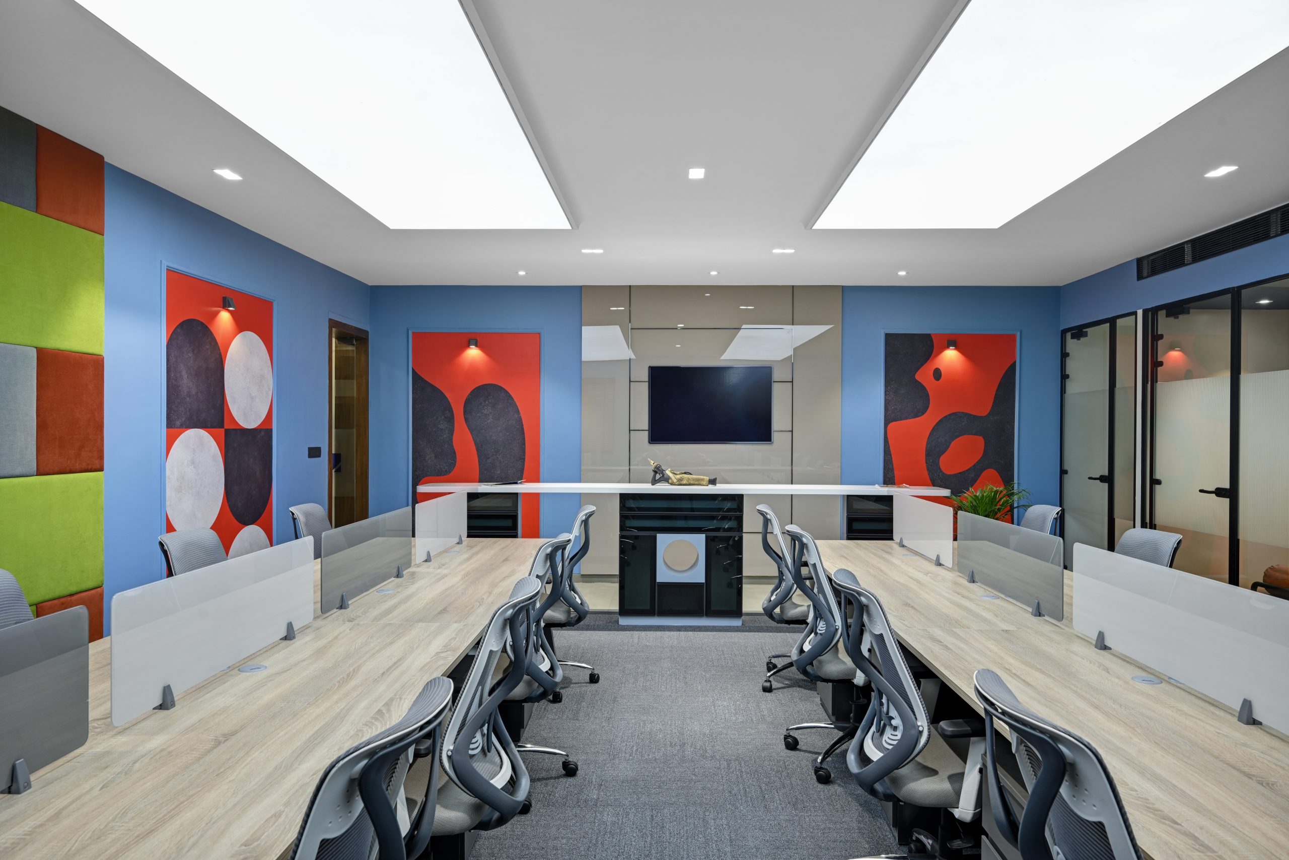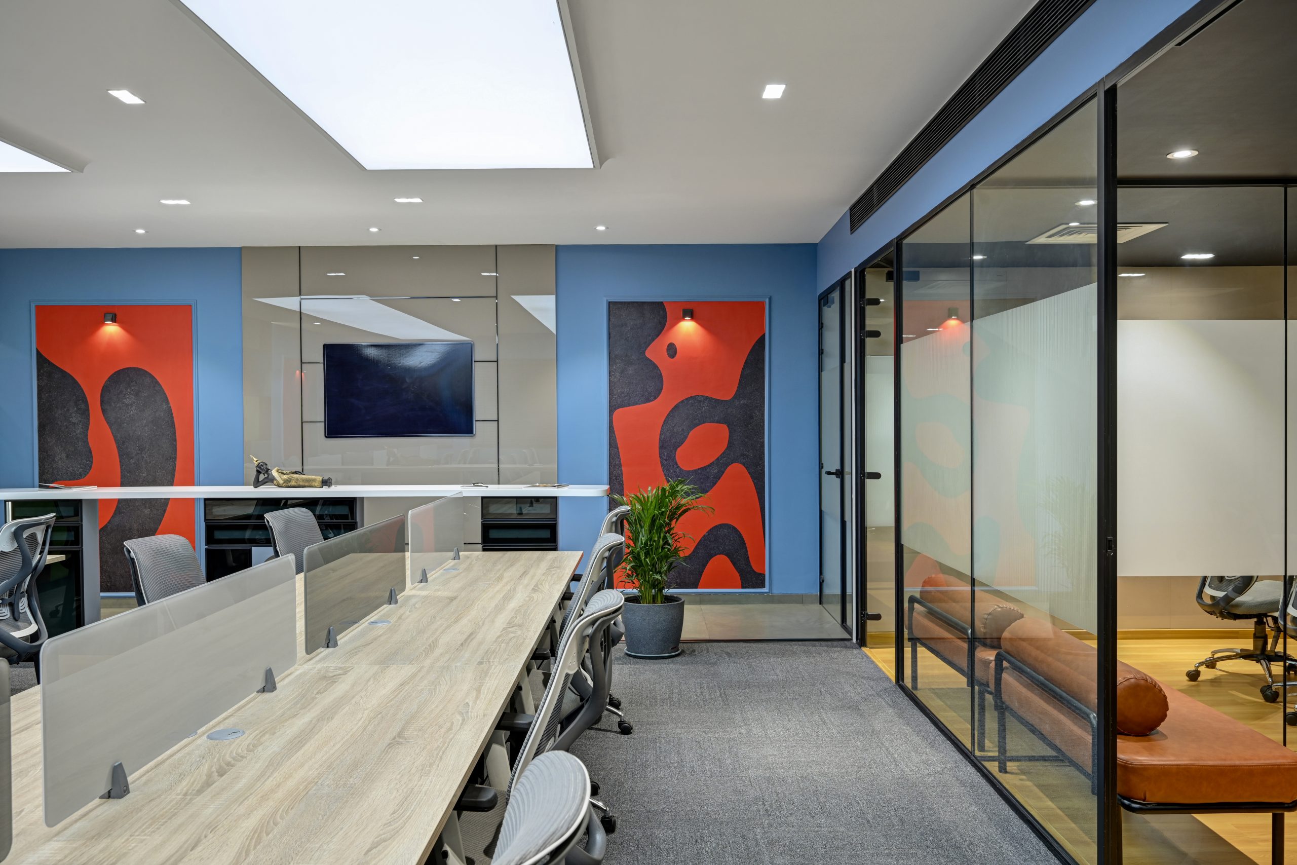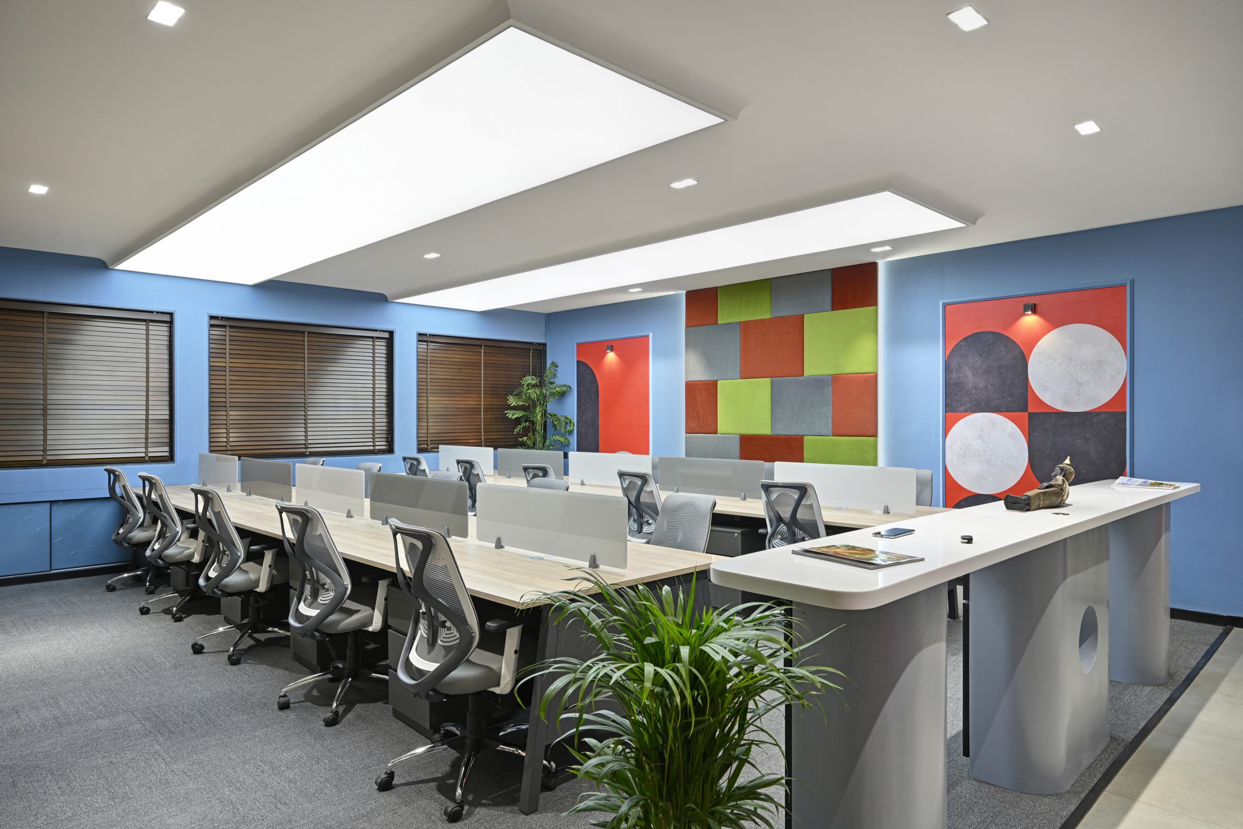 The space accommodates 20 efficient workstations and includes two small cabins, a director’s area, and a high discussion table in the passage—strategically placed to encourage collaboration while minimizing disruption to work zones. Walls are clad in multicolor soft boards with backlit, offering sound insulation and visual interest, paired with abstract wallpapers framed in moldings. A TV panel featuring back-painted glass serves dual purposes—presentation display and writable surface during meetings. The ceiling incorporates a fabric stretch system, ensuring uniform lighting and a clean, seamless look. The director’s cabin is elevated with wooden flooring and a custom wooden desk topped in Corian. A full-height storage unit with open shelves backed by bronze mirror adds both functionality and a sense of depth. Wooden blinds complement the luxurious palette, tying the design together with a refined and elegant touch.