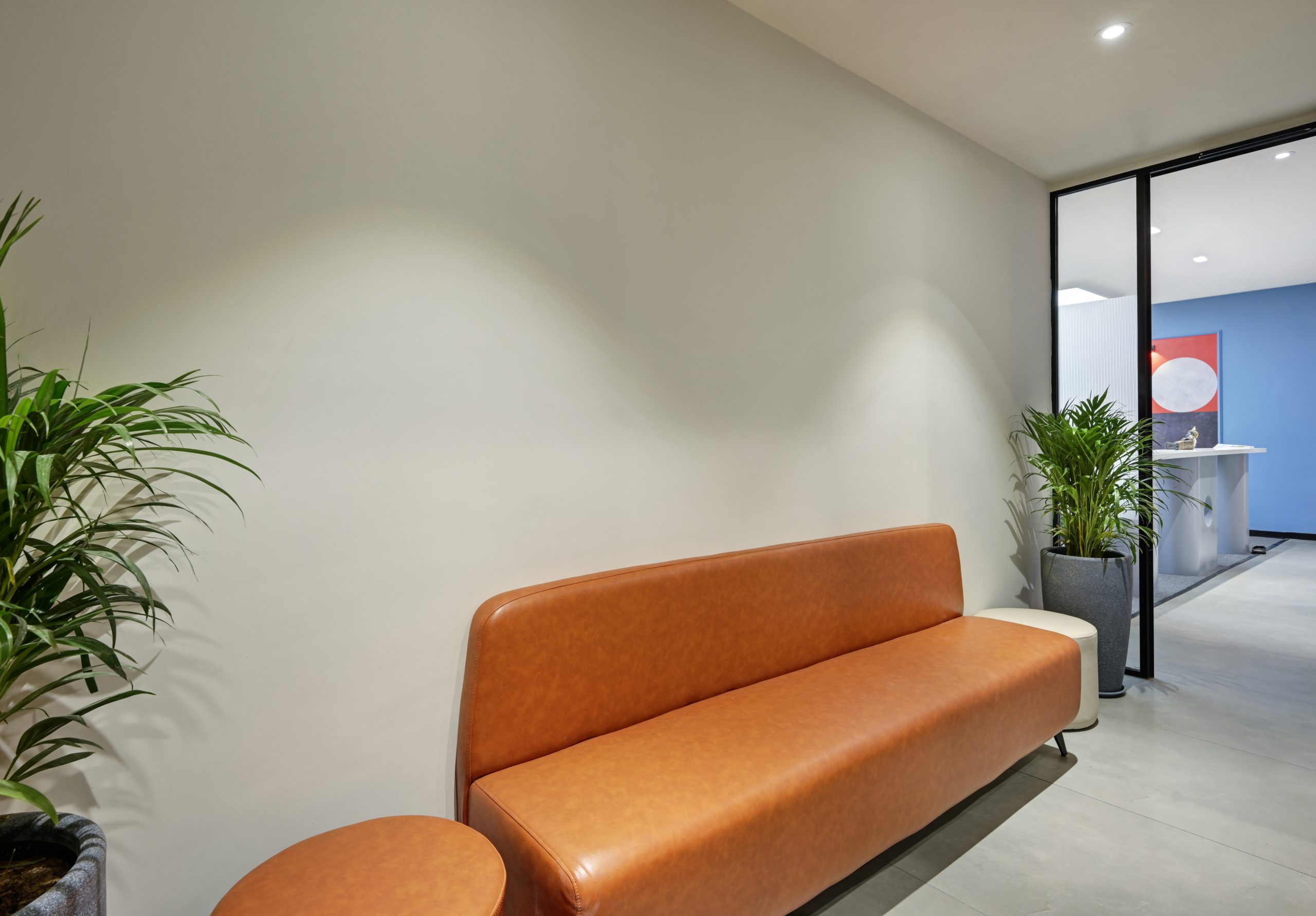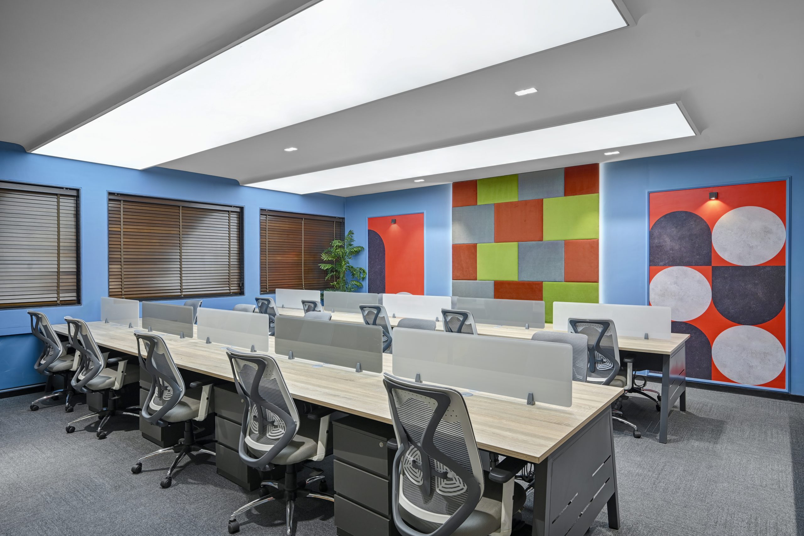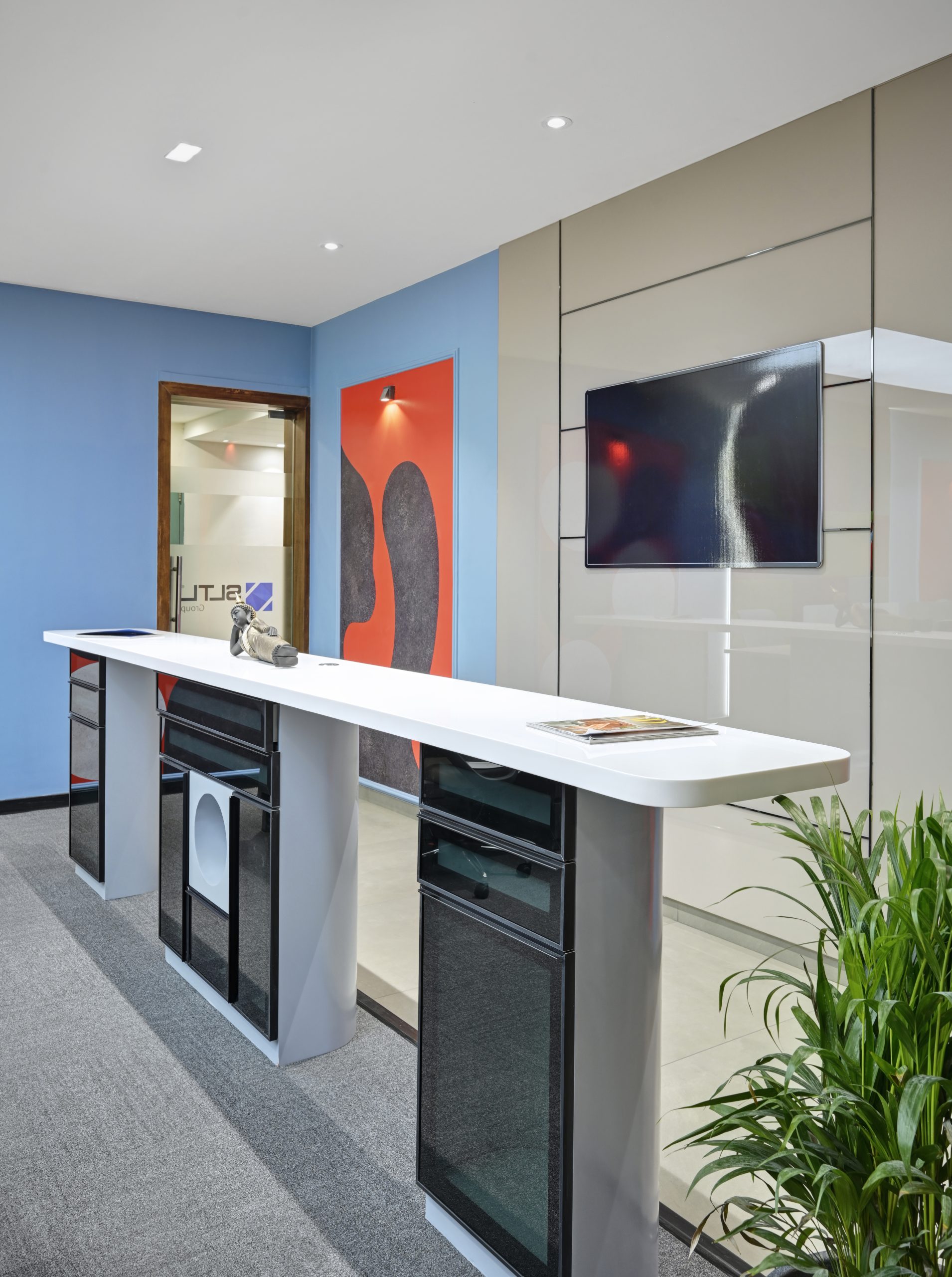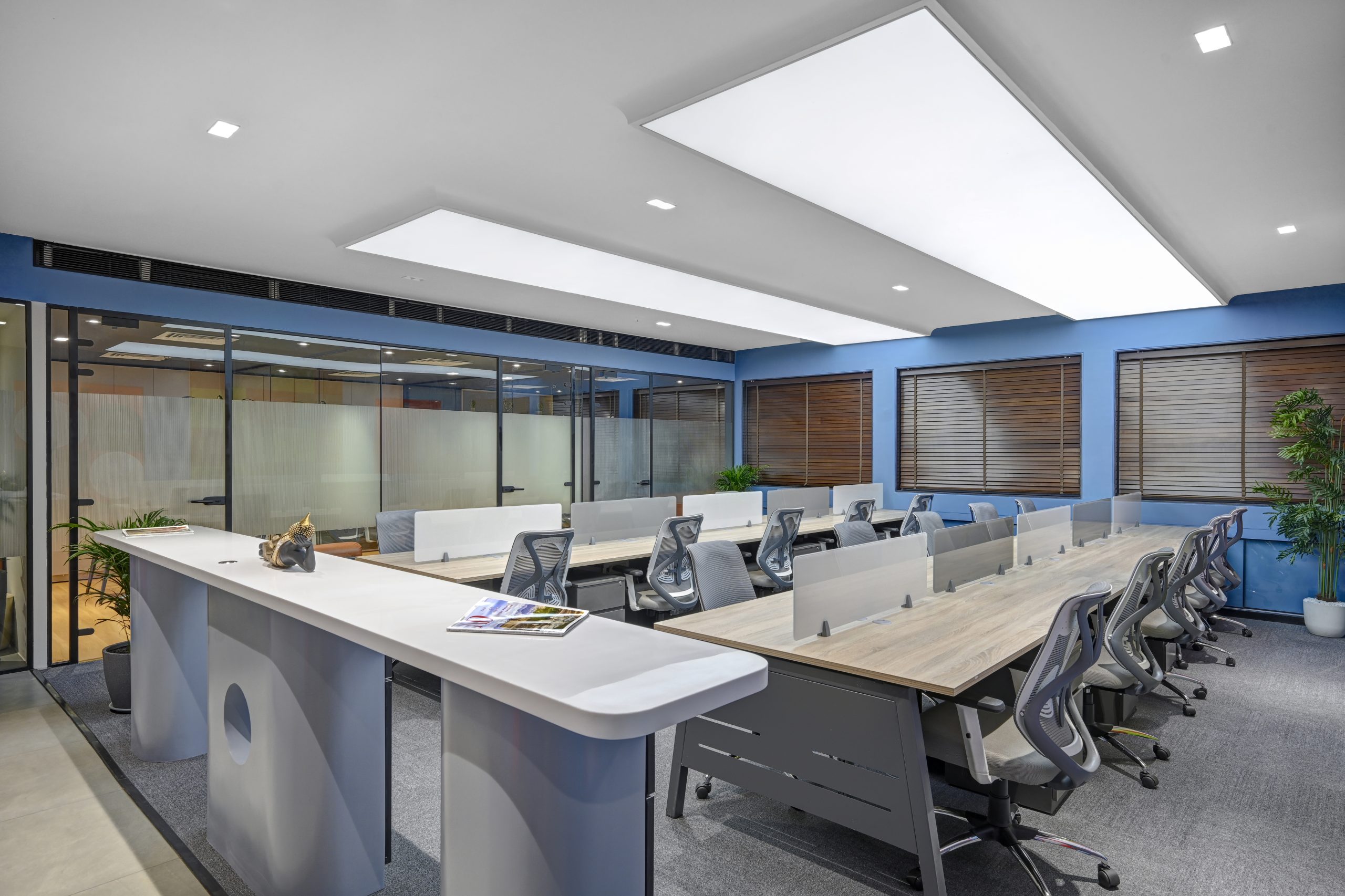 The space accommodates 20 efficient workstations and includes two small cabins, a director’s area, and a high discussion table in the passage—strategically placed to encourage collaboration while minimizing disruption to work zones. Walls are clad in multicolor soft boards with backlit, offering sound insulation and visual interest, paired with abstract wallpapers framed in moldings. A TV panel featuring back-painted glass serves dual purposes—presentation display and writable surface during meetings. The ceiling incorporates a fabric stretch system, ensuring uniform lighting and a clean, seamless look. The director’s cabin is elevated with wooden flooring and a custom wooden desk topped in Corian. A full-height storage unit with open shelves backed by bronze mirror adds both functionality and a sense of depth. Wooden blinds complement the luxurious palette, tying the design together with a refined and elegant touch.