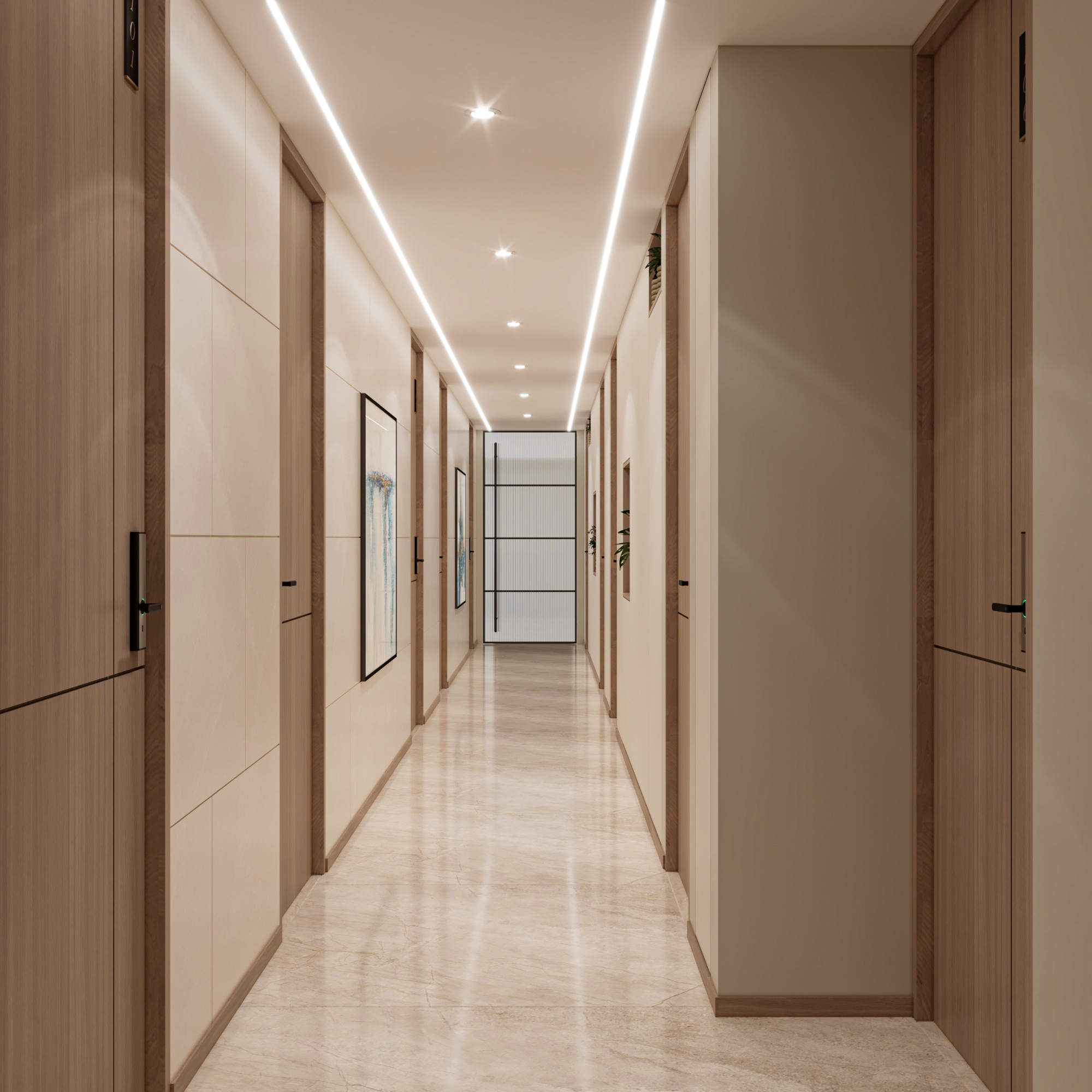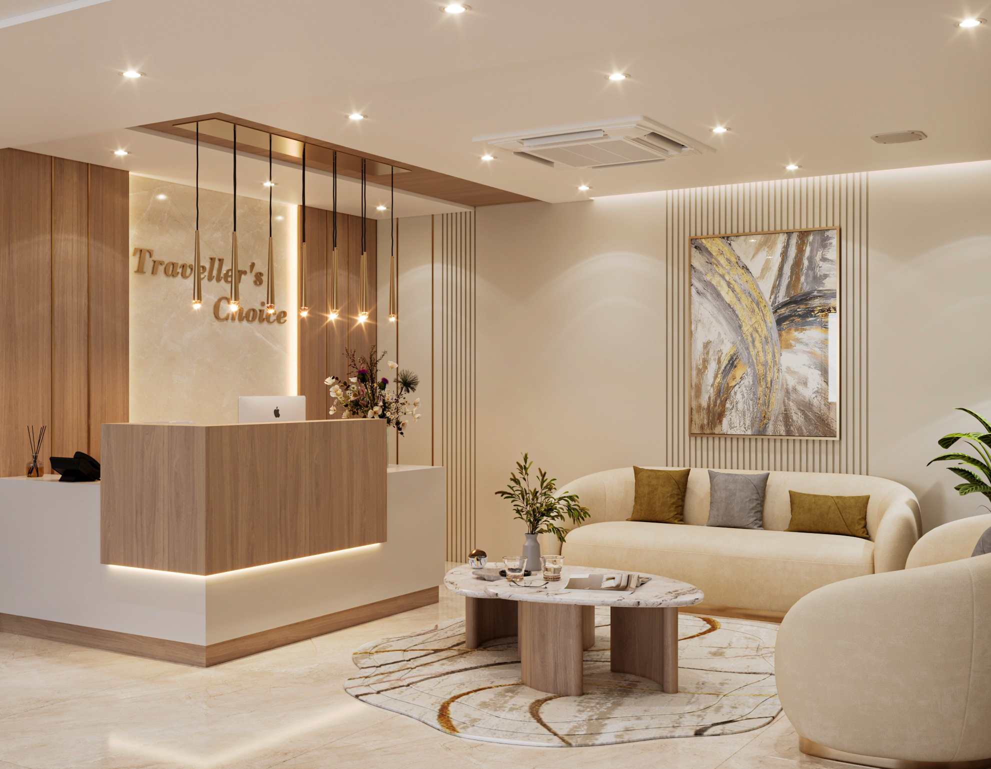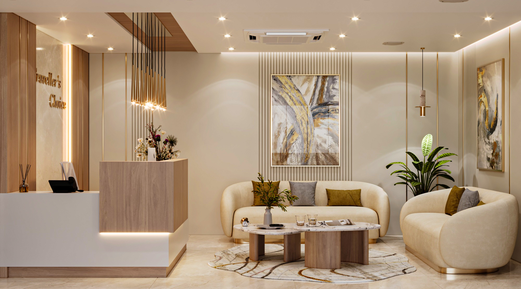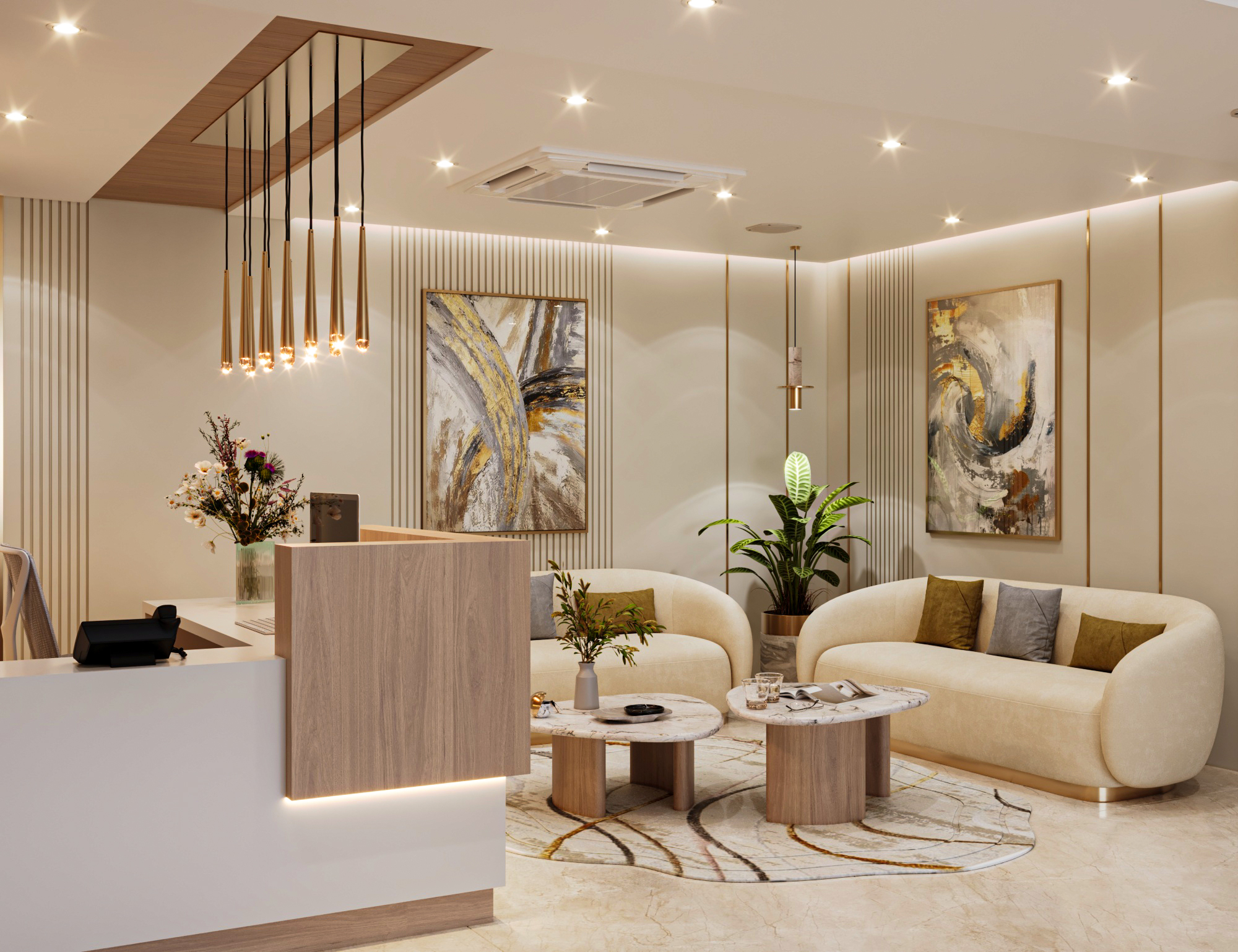 The layout includes a welcoming reception and waiting area, an open workspace, a director’s cabin, and a conference room. Arched doorways and glass partitions maintain a balance between privacy and visibility, lending a soft architectural touch. Hanging planters paired with ambient lighting introduce natural greenery, creating an energized and vibrant atmosphere. The director’s cabin features wooden flooring for a distinguished, warm feel, while a sliding-folding partition between the cabin and conference room offers flexibility—allowing the director to attend meetings seamlessly or expand the space when needed.
