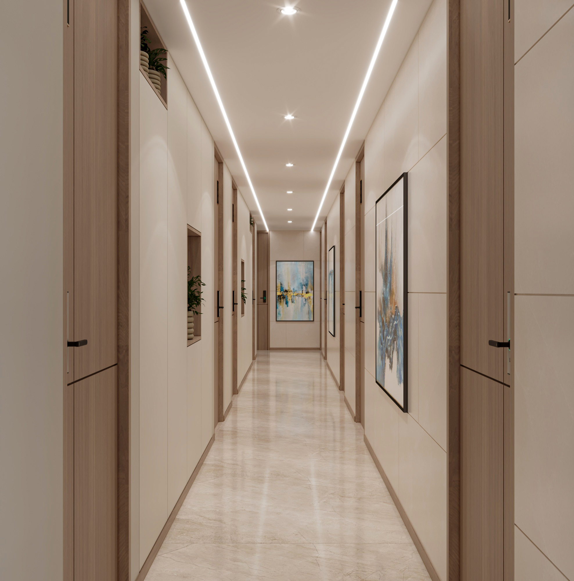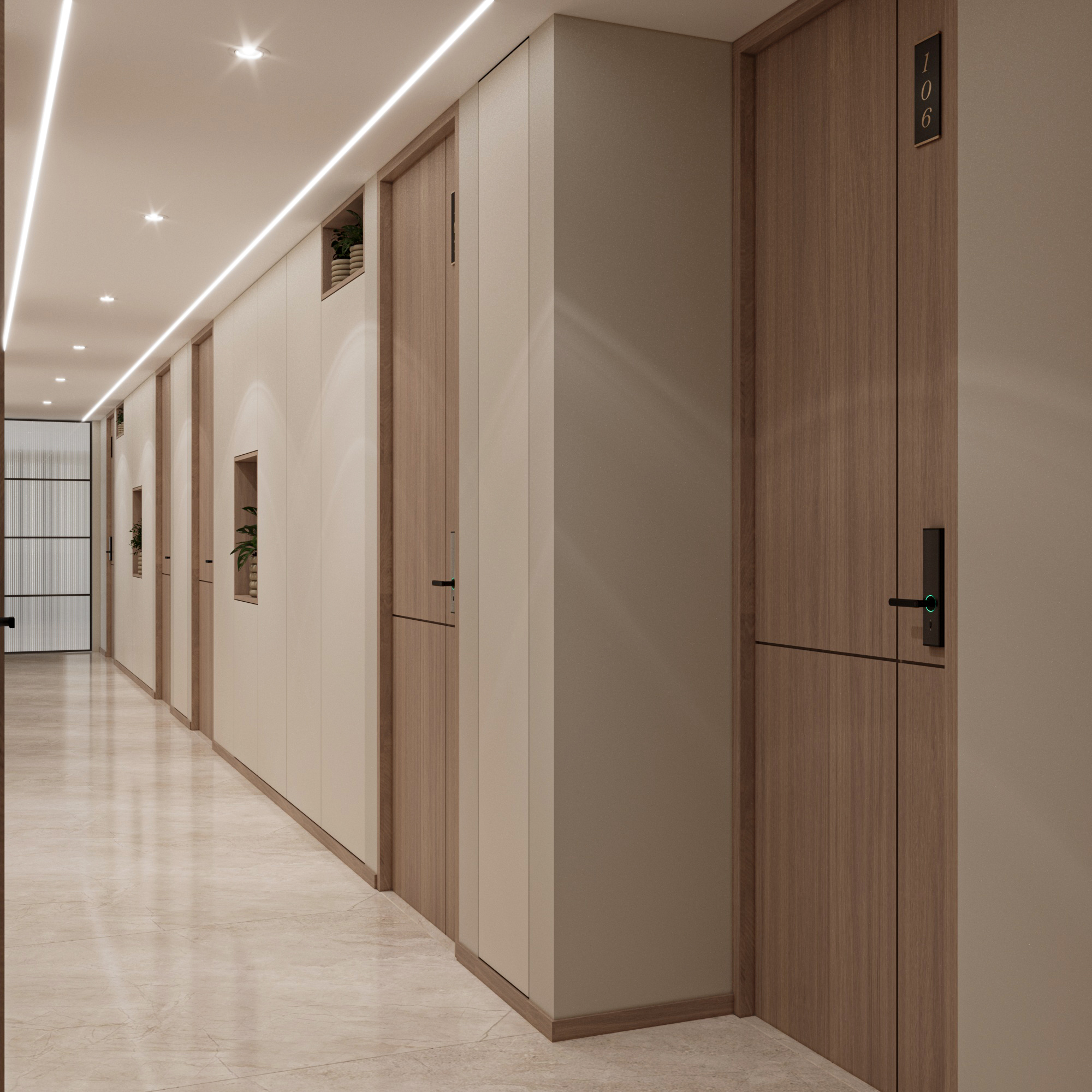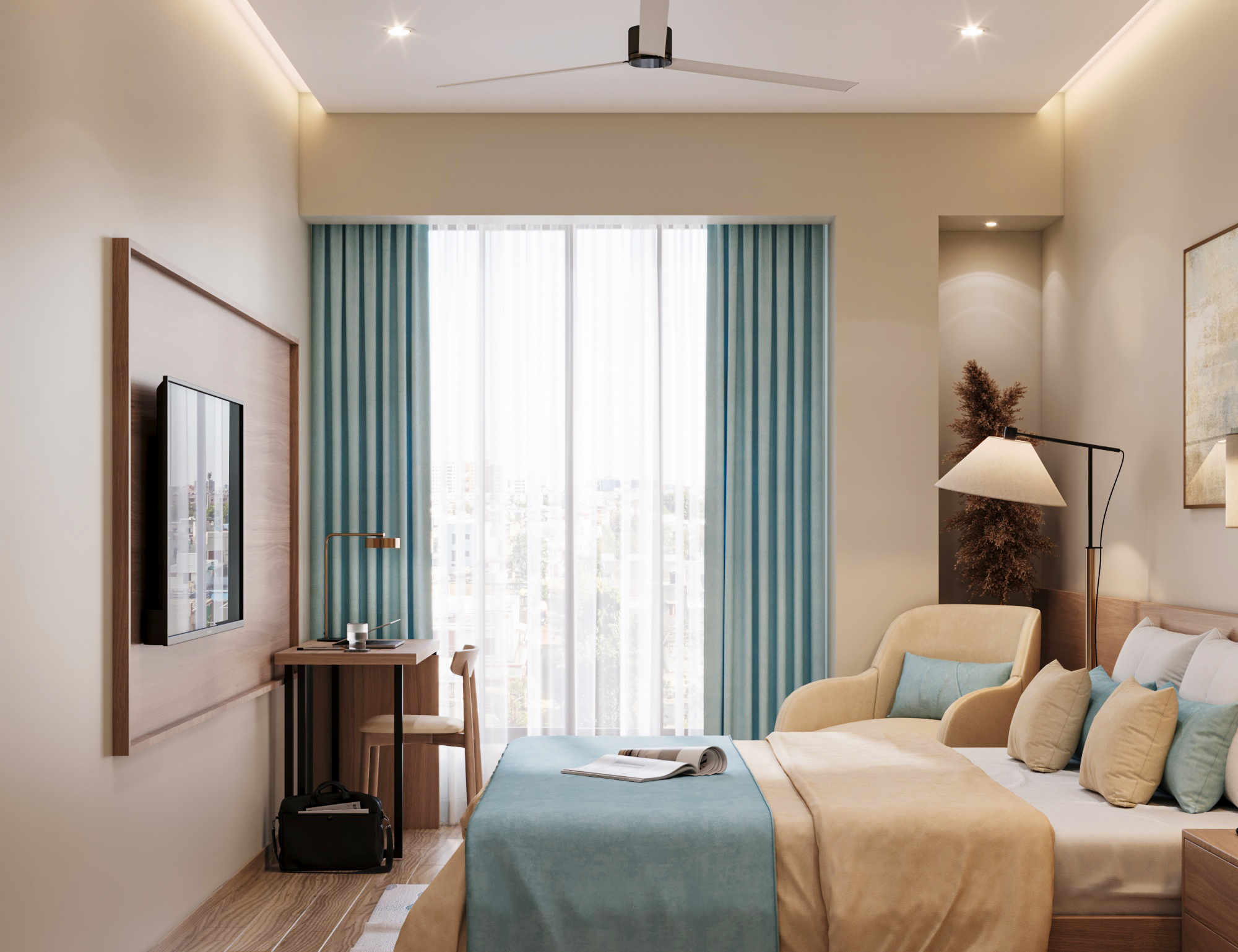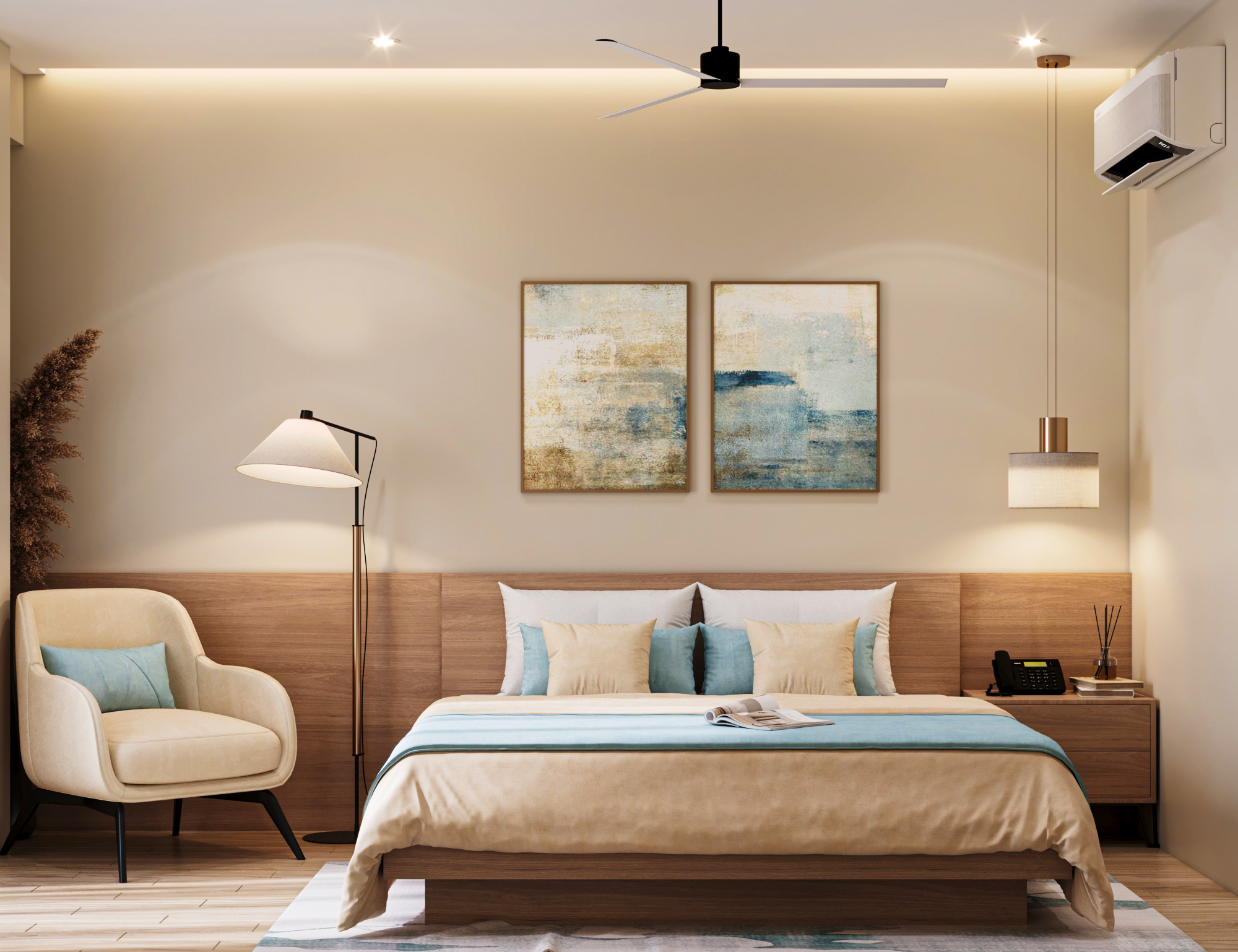 The layout includes a welcoming reception and waiting area, an open workspace, a director’s cabin, and a conference room. Arched doorways and glass partitions maintain a balance between privacy and visibility, lending a soft architectural touch. Hanging planters paired with ambient lighting introduce natural greenery, creating an energized and vibrant atmosphere. The director’s cabin features wooden flooring for a distinguished, warm feel, while a sliding-folding partition between the cabin and conference room offers flexibility—allowing the director to attend meetings seamlessly or expand the space when needed.