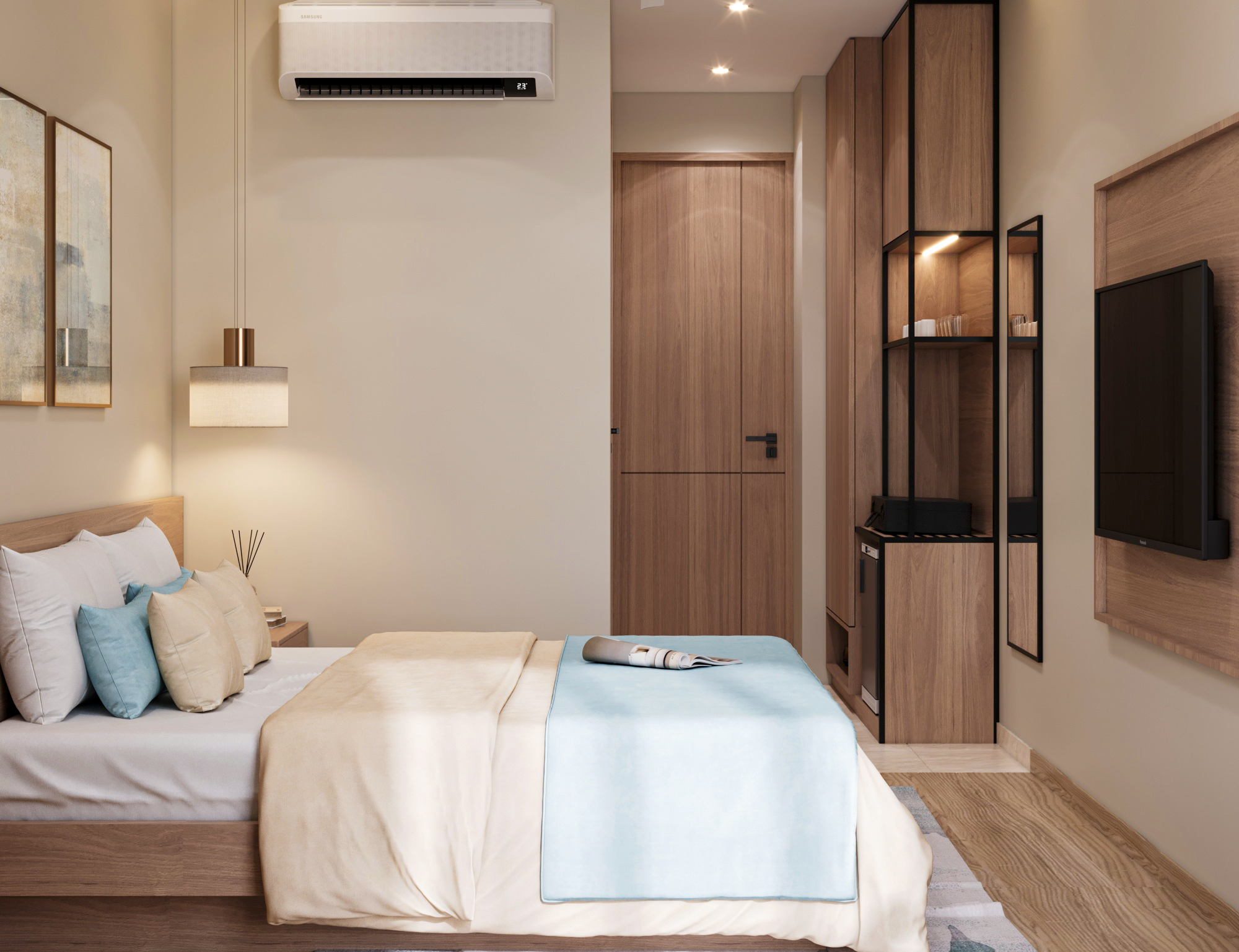 This compact yet thoughtfully designed pharmaceutical office integrates function with aesthetic elegance.