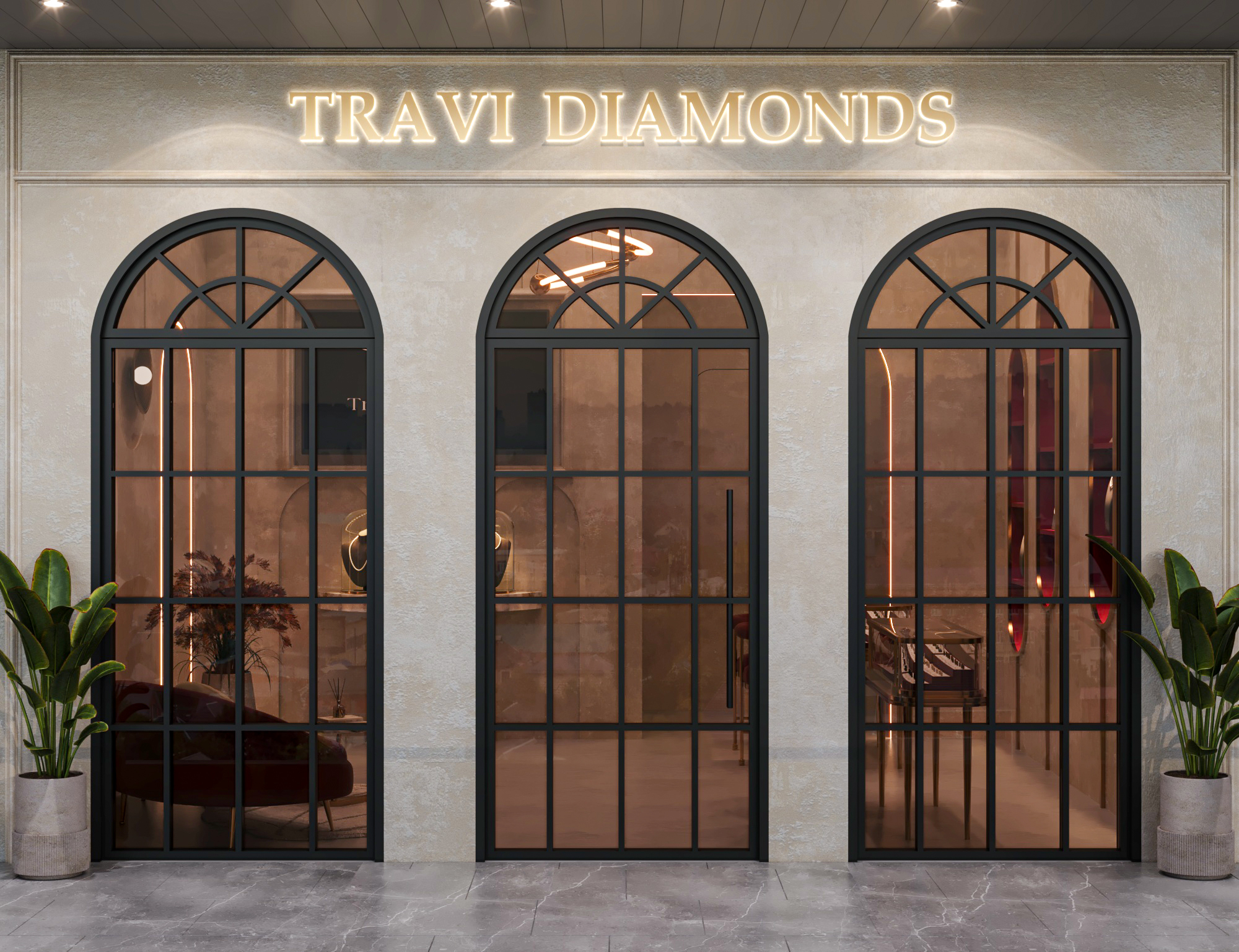 This jewelry showroom interior for Travi Diamonds embodies elegance and modern luxury.