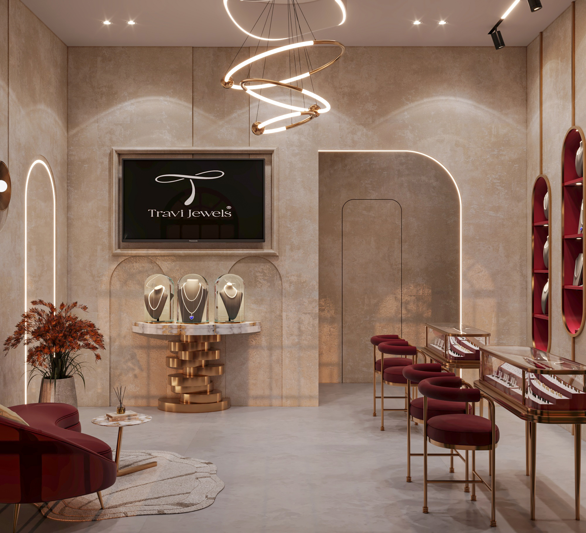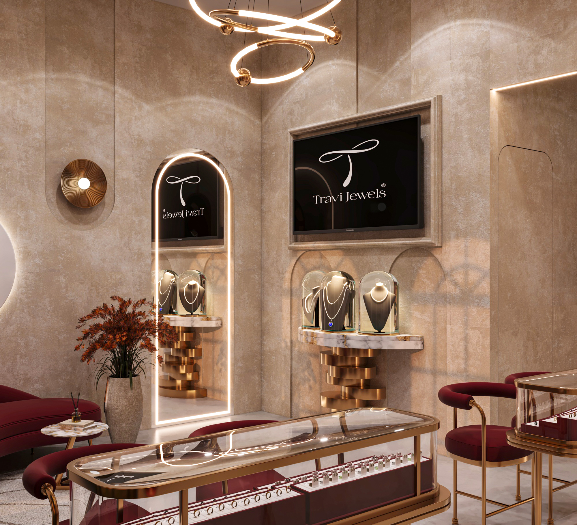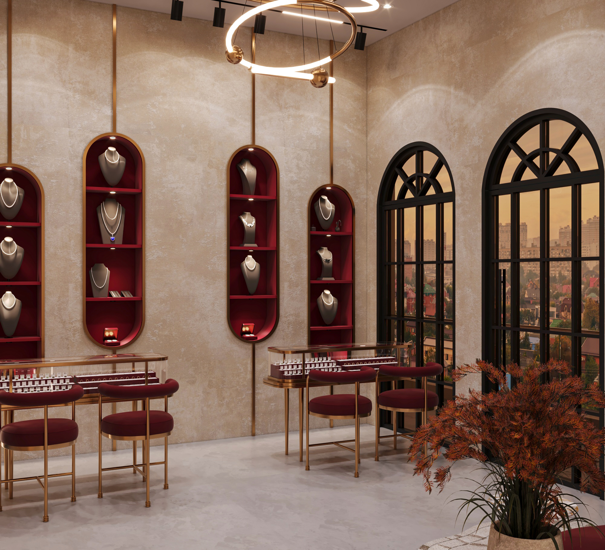 The design features large arched windows framed in black, allowing natural light to enhance the display while giving the facade a sophisticated charm. Inside, a warm beige textured wall finish pairs beautifully with burgundy seating and shelving, creating a regal yet welcoming atmosphere. Golden accents in lighting, furniture, and display counters add a refined sparkle, complementing the brilliance of the jewelry showcased. The use of curved elements—arched niches, oval shelves, and circular chandeliers—softens the space, balancing richness with comfort. The layout highlights jewelry pieces as the focal point, presented under sleek glass cases and illuminated with ambient lighting. Overall, the design reflects exclusivity, blending contemporary aesthetics with timeless appeal, perfect for a premium diamond jewelry brand.