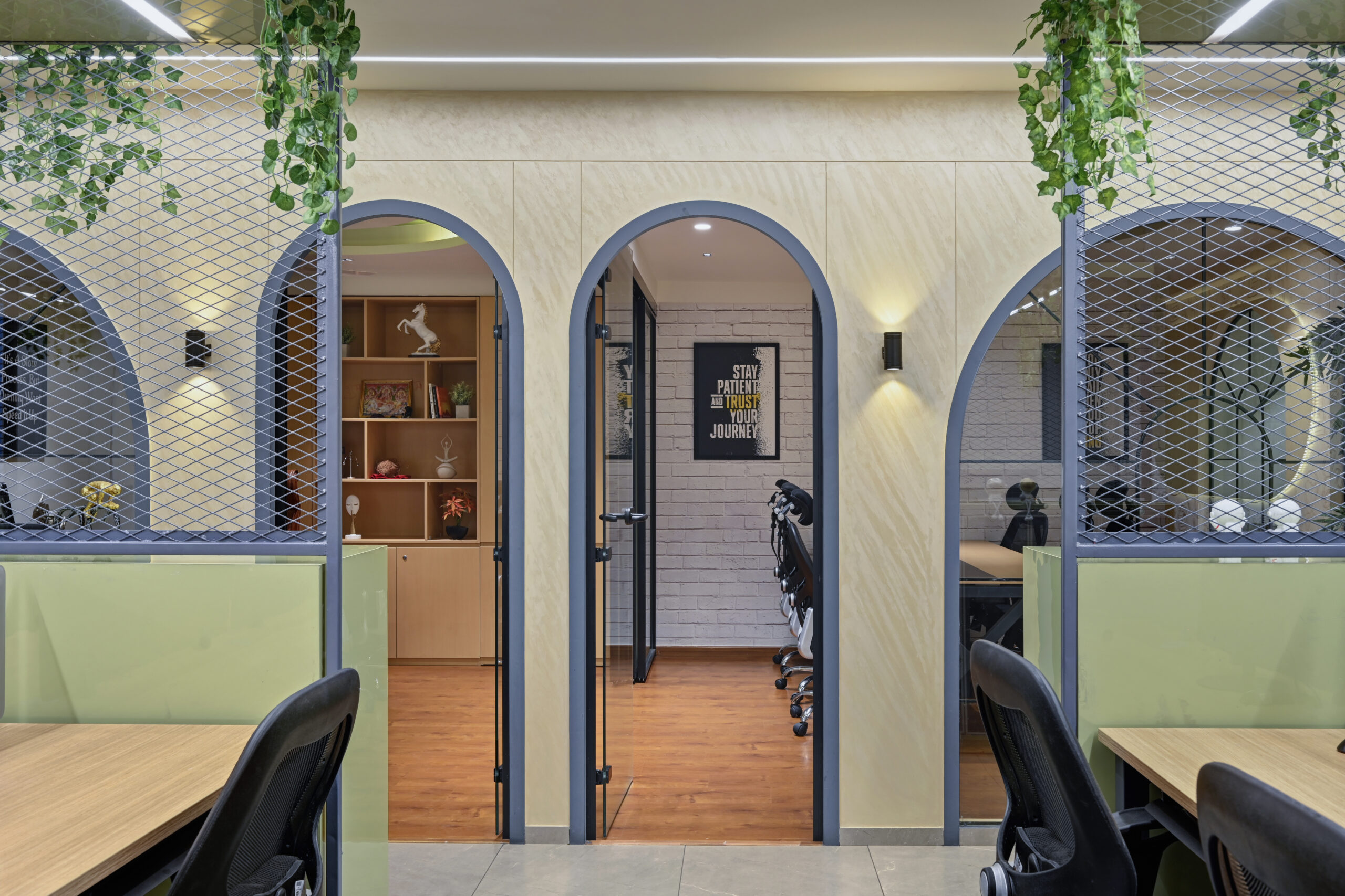 The layout includes a welcoming reception and waiting area, an open workspace, a director’s cabin, and a conference room. Arched doorways and glass partitions maintain a balance between privacy and visibility, lending a soft architectural touch. Hanging planters paired with ambient lighting introduce natural greenery, creating an energized and vibrant atmosphere. The director’s cabin features wooden flooring for a distinguished, warm feel, while a sliding-folding partition between the cabin and conference room offers flexibility—allowing the director to attend meetings seamlessly or expand the space when needed.